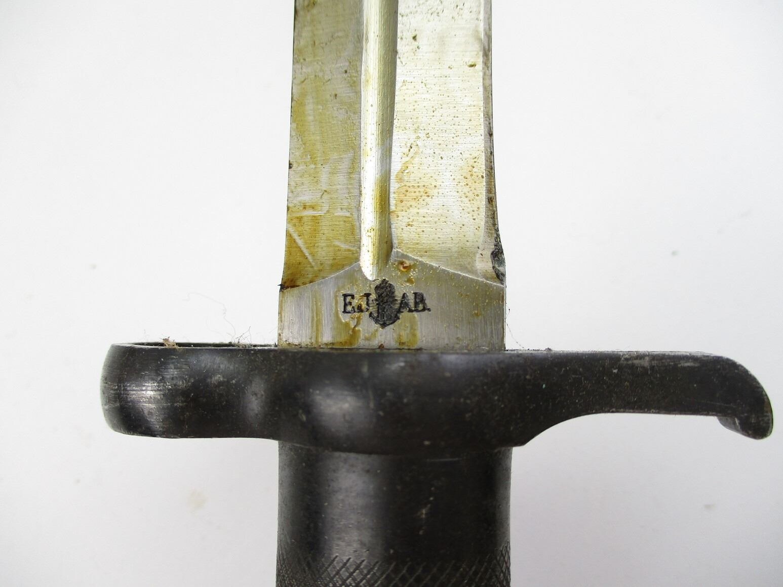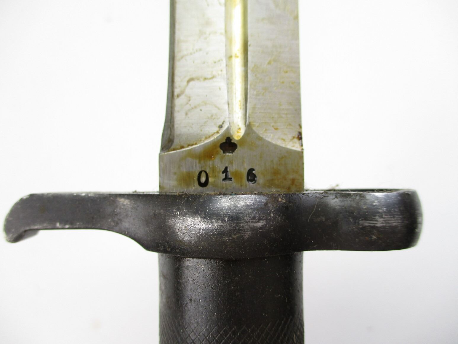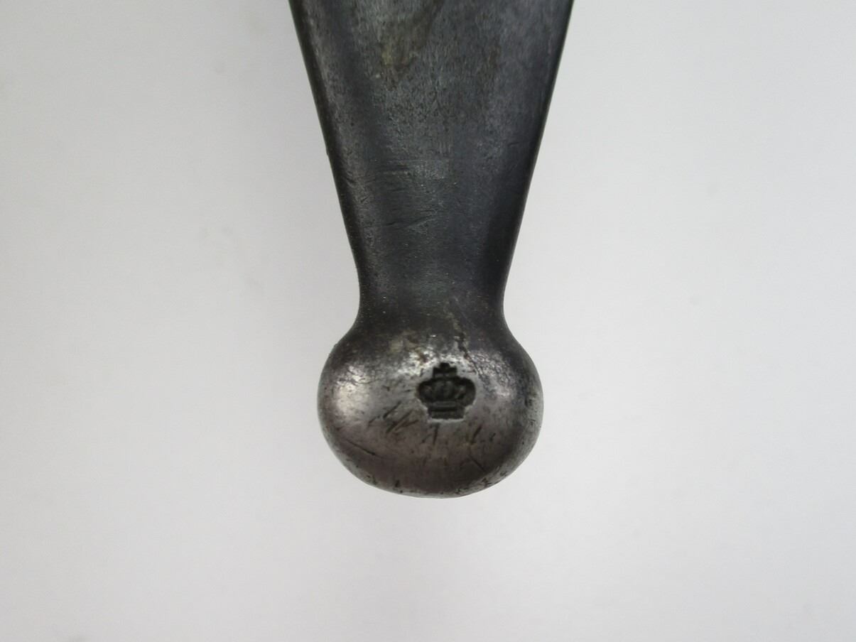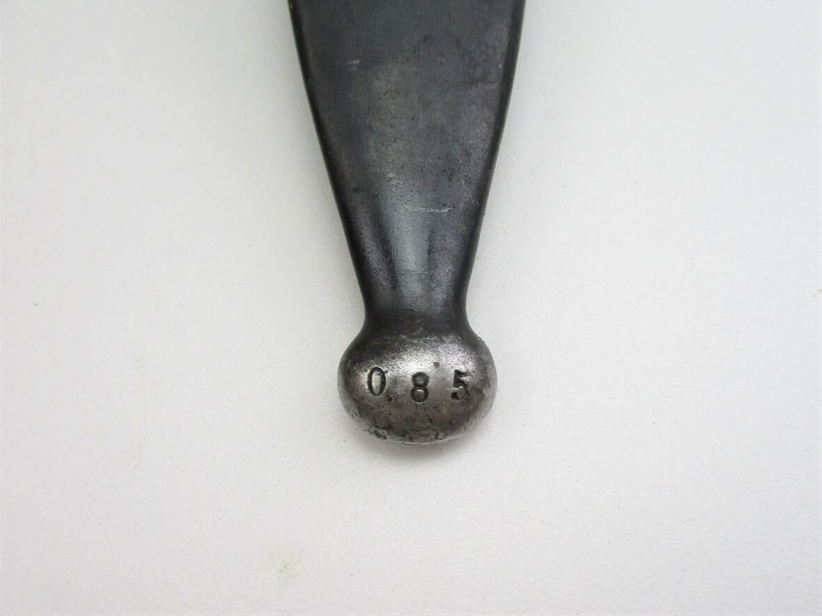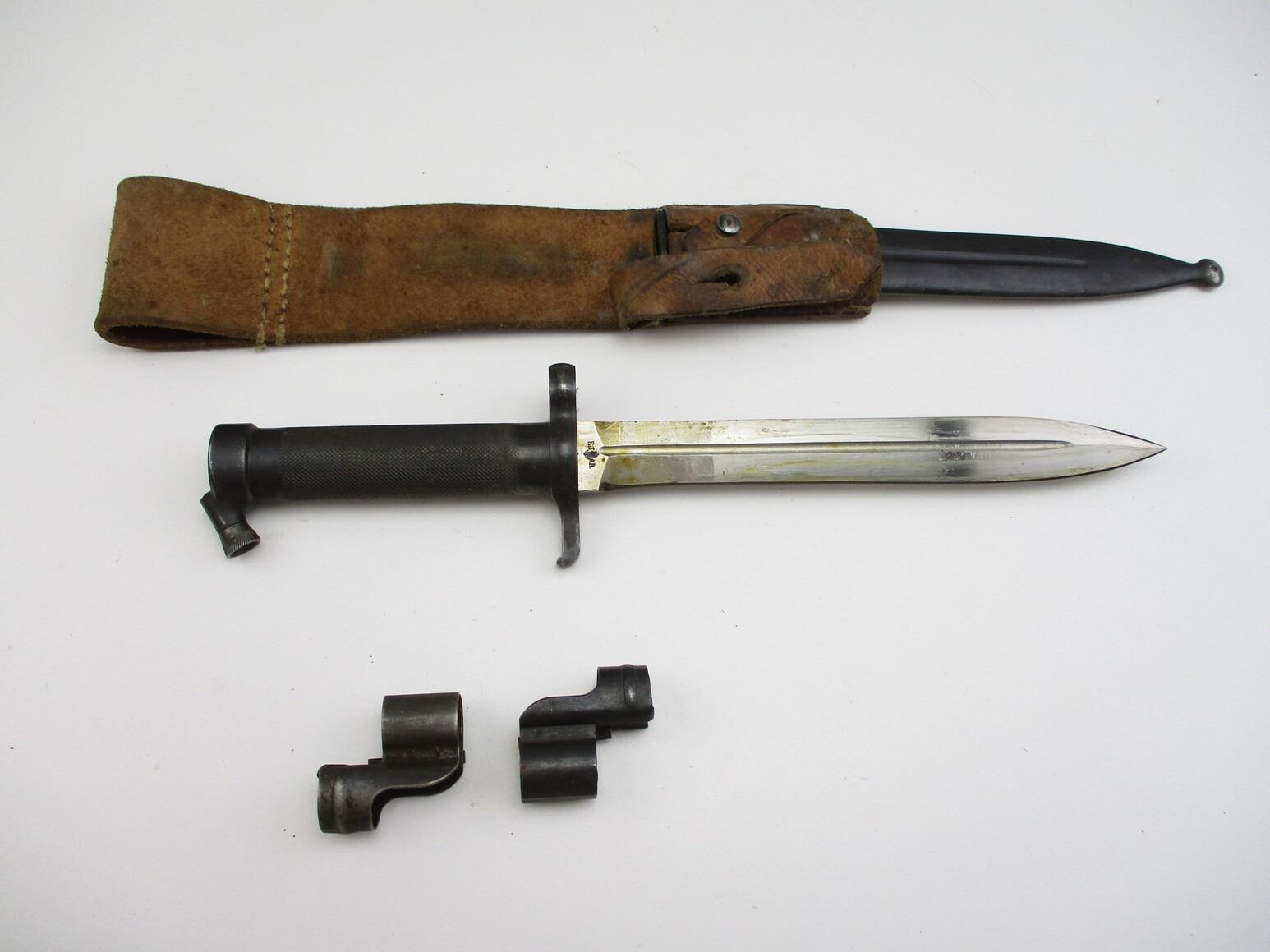 SWEDISH M1896 RIFLE BAYONET AND HOOD LOT, LOT INCLUDES; (1) FITS 1896 M38 RIFLES, RICASSO MARKED: CROWN OVER "016", OTHER SIDE MARKED: "E.J." ANCHOR "A.B.", CROSS-PIECE HAS CROWN, METAL GRIP/POMMEL, NO VISIBLE MARKINGS, METAL SCABBARD MARKED: "085" & CROWN, BROWN LEATHER FROG MARKED "I.28, 1916, 66" & CROWN, BLADE APPROX. 8.5" & OAL APPROX. 13.25" & (2) FRONT COVERS. SEE PHOTOS.