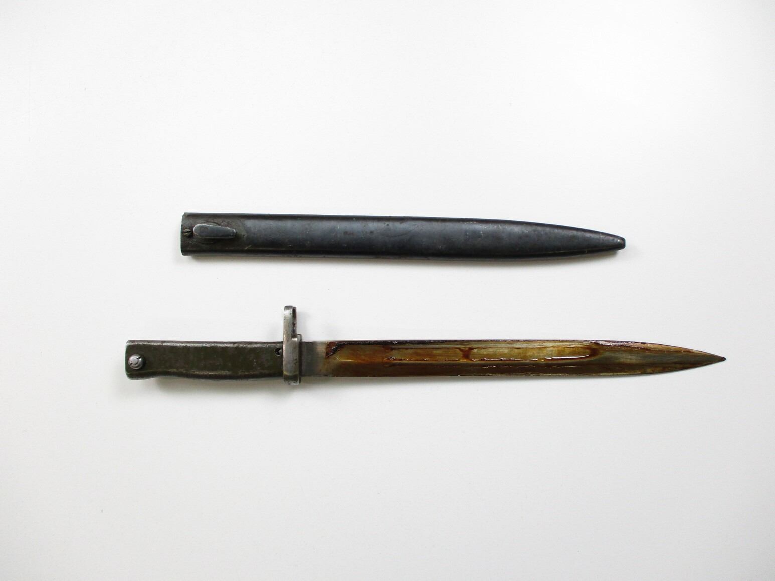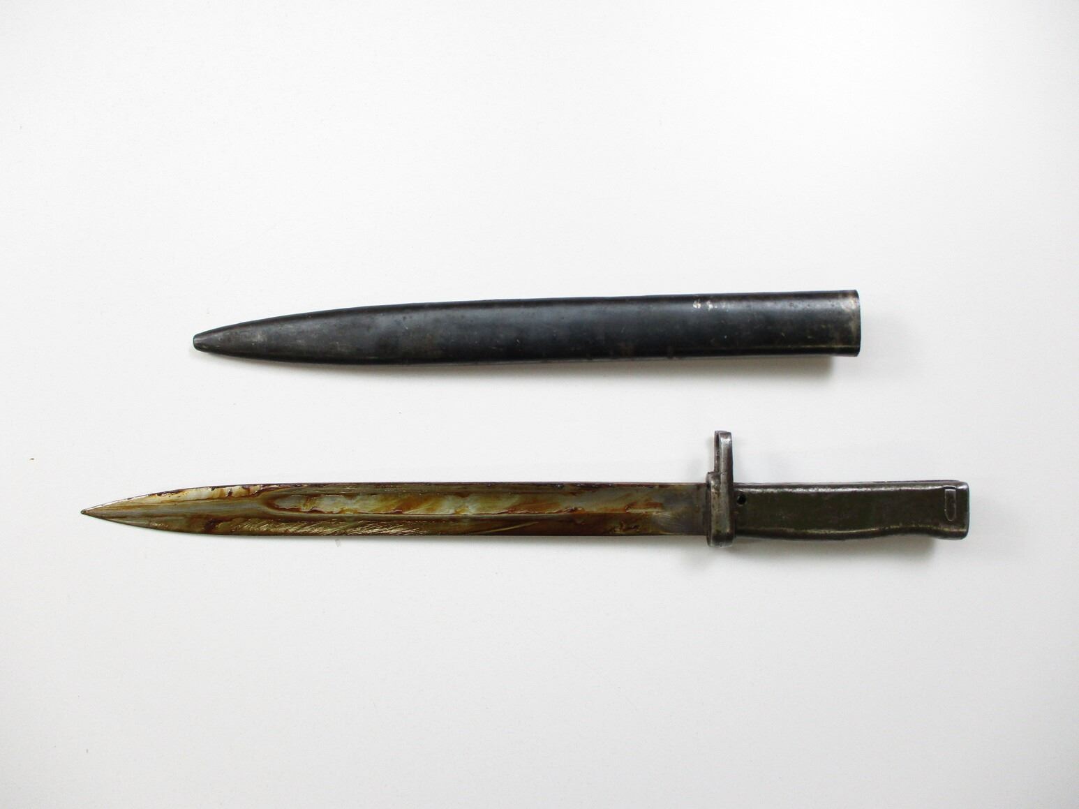 WWI TURKISH ERSATZ BAYONET, (1) POSSIBLE GERMAN MANUFACTURER, TURKISH SHORTENED BLADE, NO VISIBLE MARKINGS, METAL GRIP / POMMEL, NO VISIBLE MARKINGS, METAL SCABBARD, NO VISIBLE MARKINGS, BLADE APPROX. 12 5/8" & 17.25".