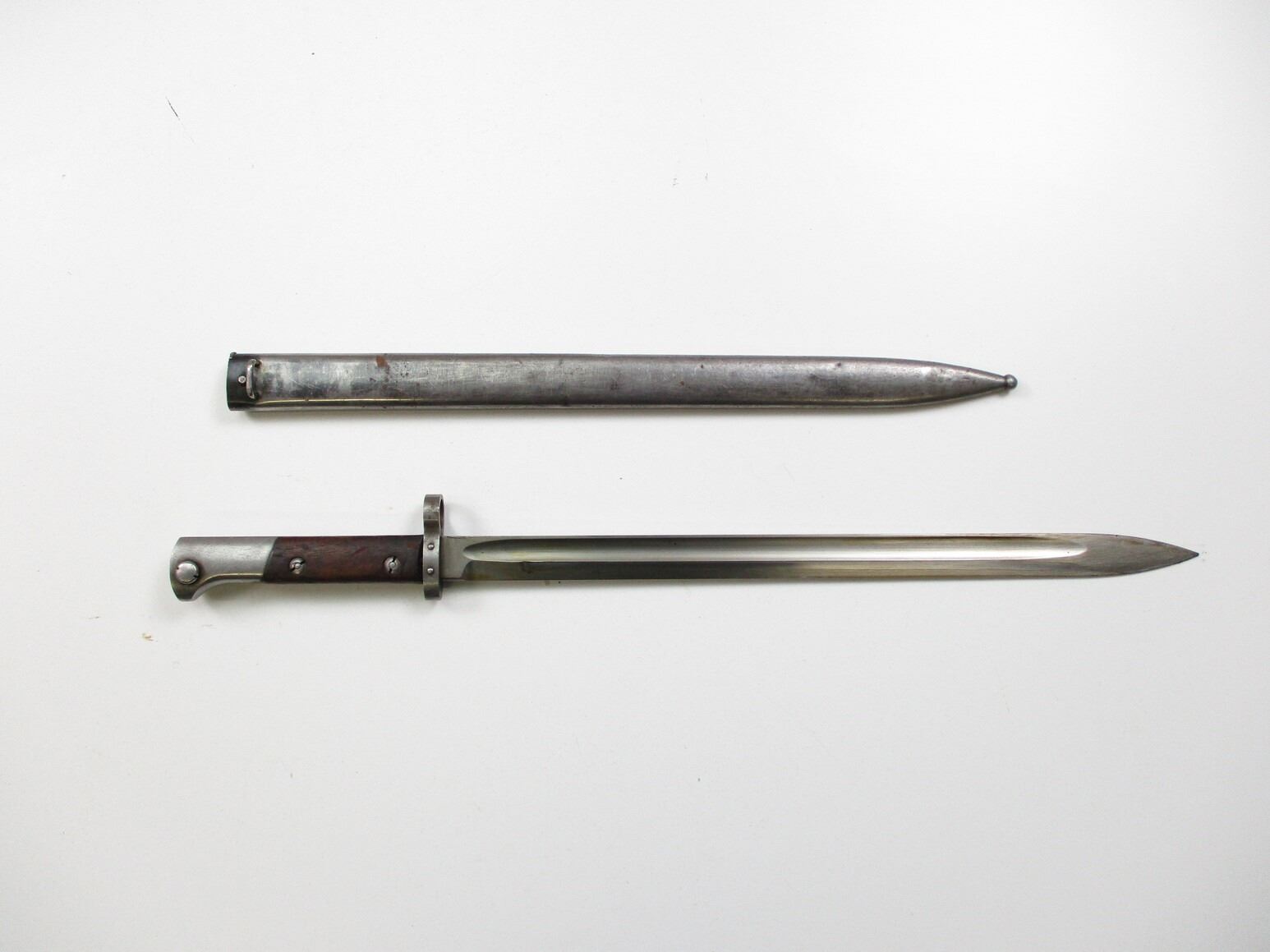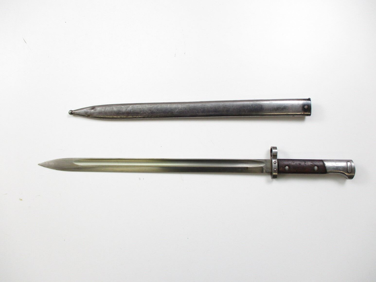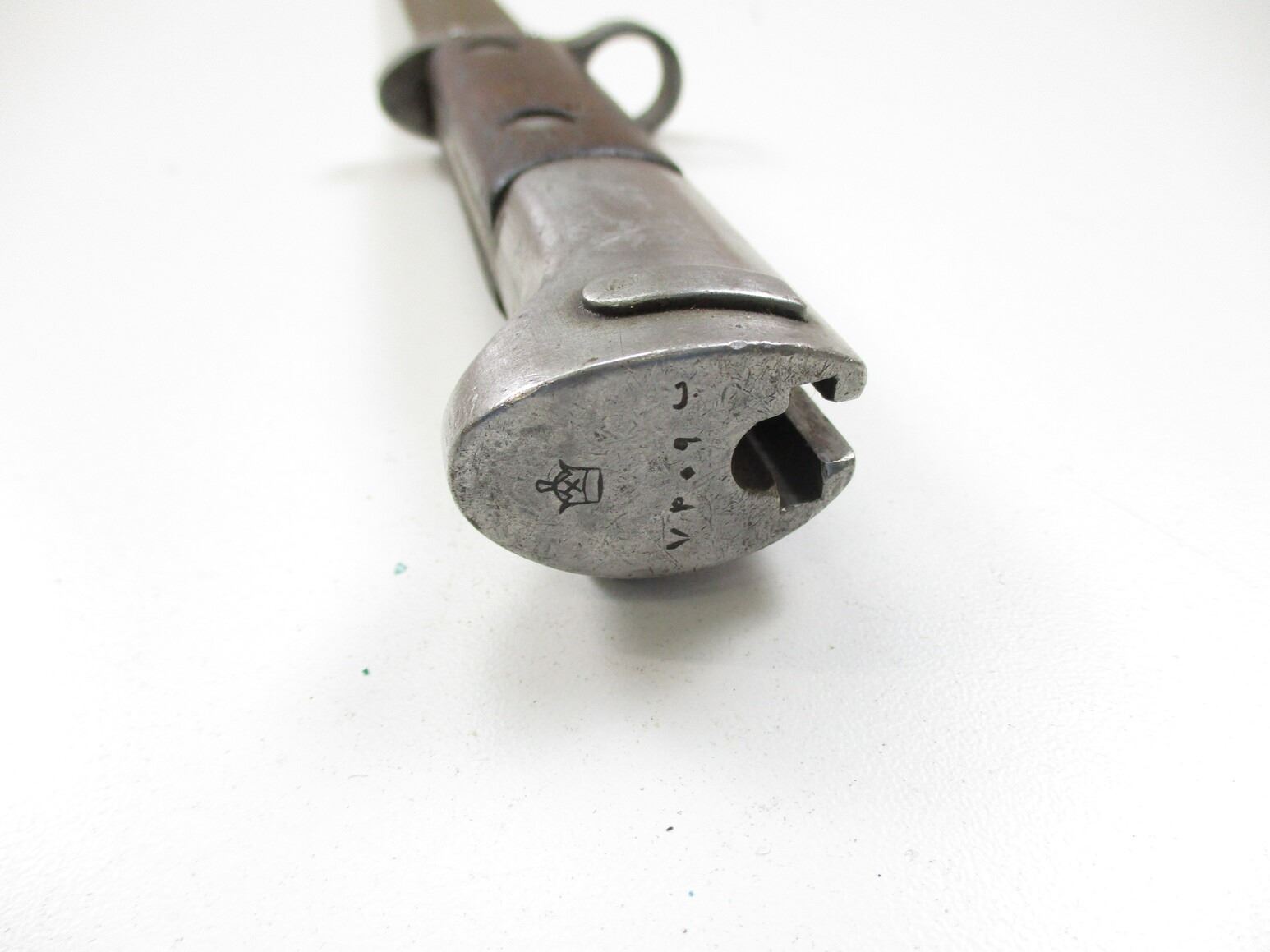 CZECH / PERSIAN VZ23 BAYONET, (1) FITS 8MM MAUSER VZ 23 RIFLES, NO VISIBLE MARKINGS, 2-PIECE WOOD GRIP, METAL POMMEL WITH CROWN & FARSI MARKINGS, STEEL SCABBARD, NO VISIBLE MARKINGS, BLADE APPROX. 15.75" & OAL APPROX. 20 7/8".