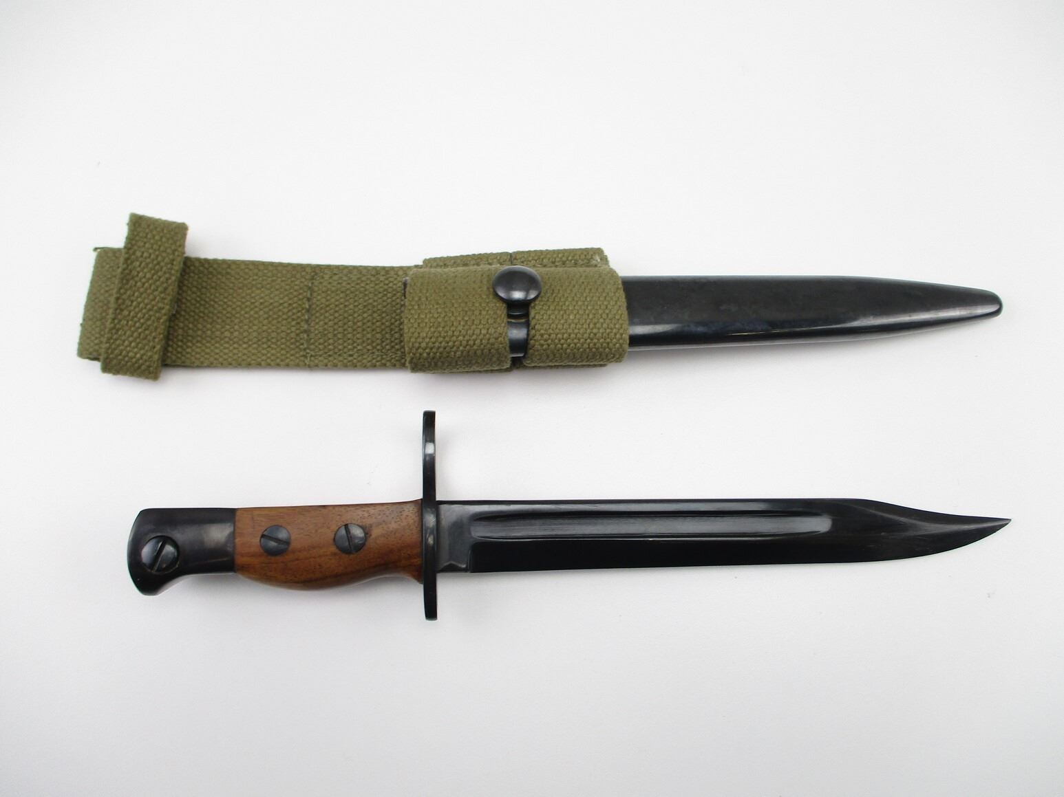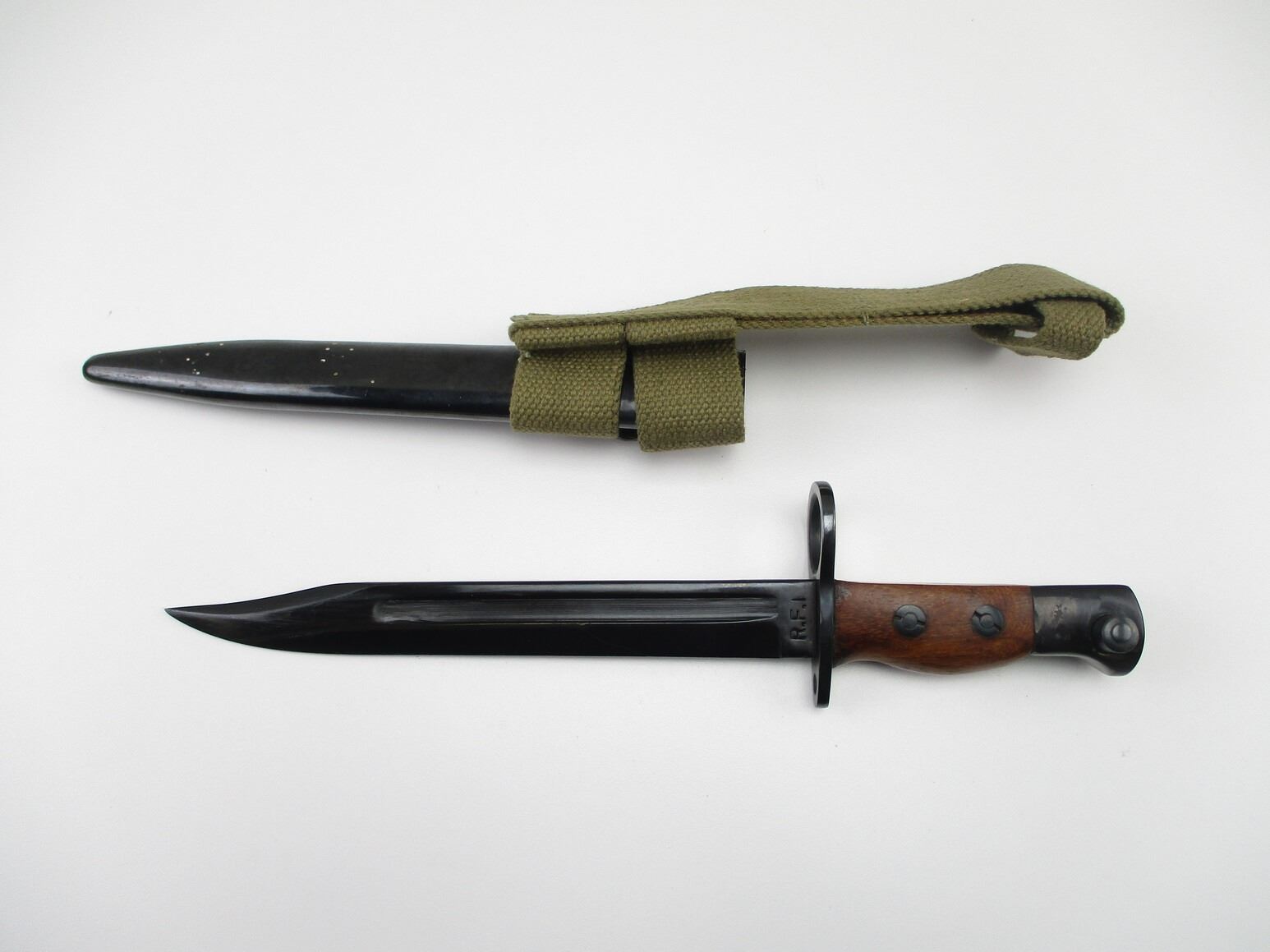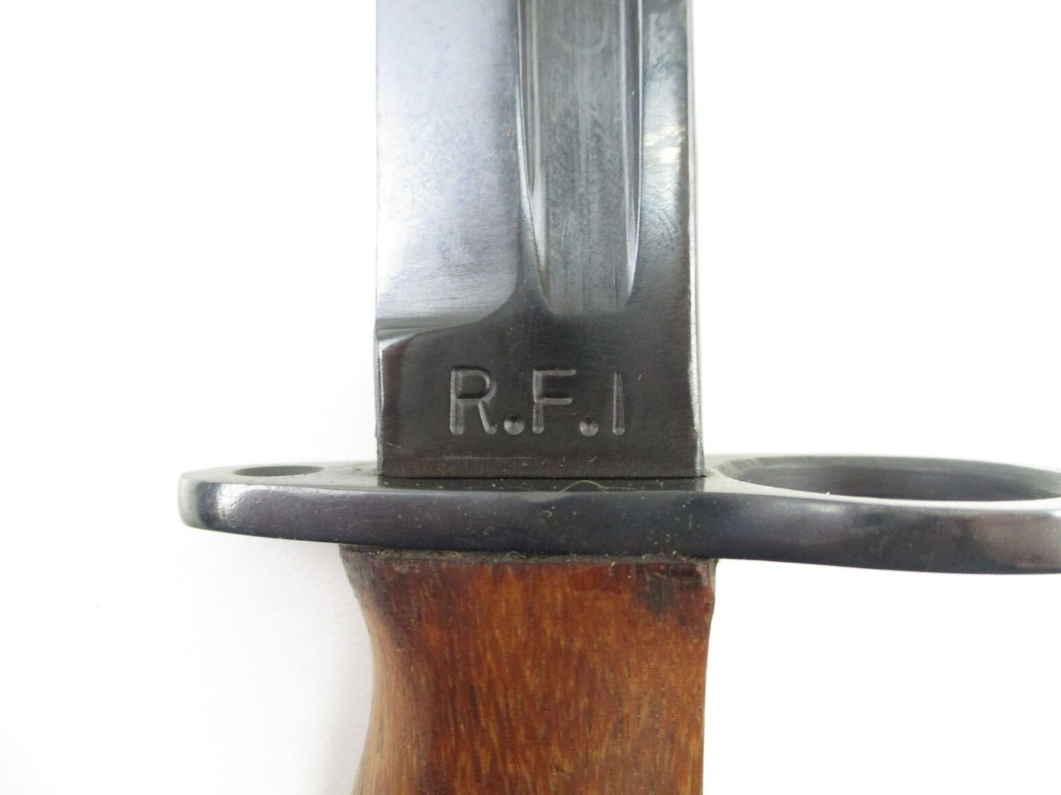 REPRODUCTION LEE ENFIELD CARBINE BAYONET, (1) FITS NO.5 MKI RIFLES, POLISHED BLUED FINISH RICASSO MARKED: "R.F.I.", 2-PIECE WOOD GRIP, METAL POMMEL, NO VISIBLE MARKINGS, STEEL SCABBARD, NO VISIBLE MARKINGS, GREEN WEB FROG, NO VISIBLE MARKINGS, BLADE APPROX. 8" & OAL APPROX. 11.75".