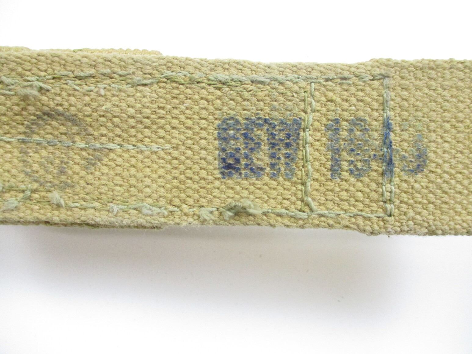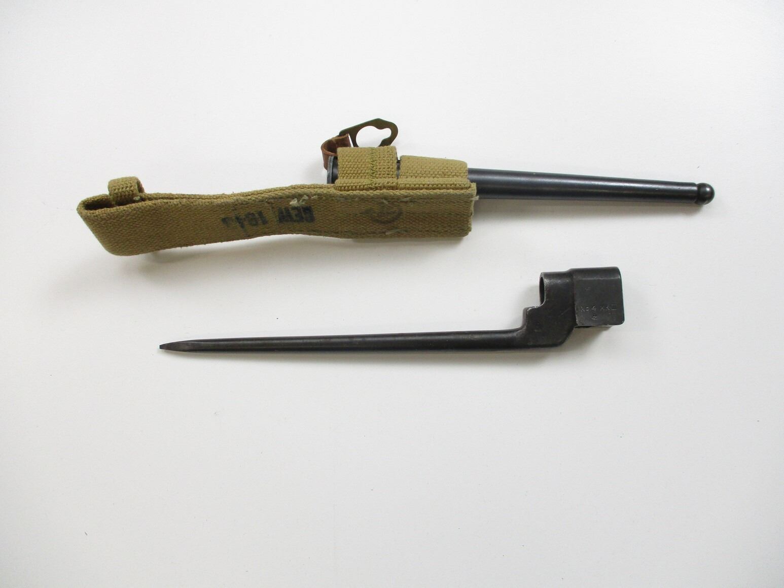CANADIAN LEE ENFIELD NO.4 MK II SOCKET BAYONET, (1) SOCKET MARKED: "NO4 MKII" OVER "LB" & C-BROAD ARROW, METAL SCABBARD, NO VISIBLE MARKINGS, GREEN CANVAS FROG MARKED: "GEW 1943" & C-BROAD ARROW, BLADE APPROX. 8" & OAL APPROX. 9.75".