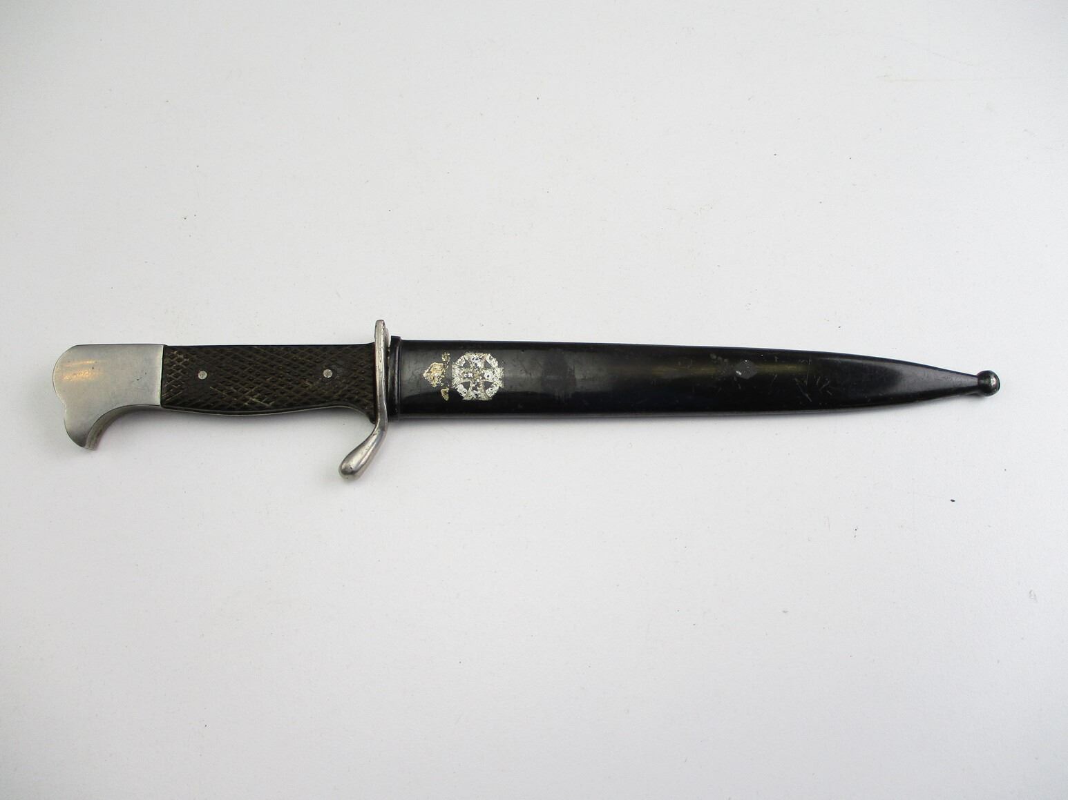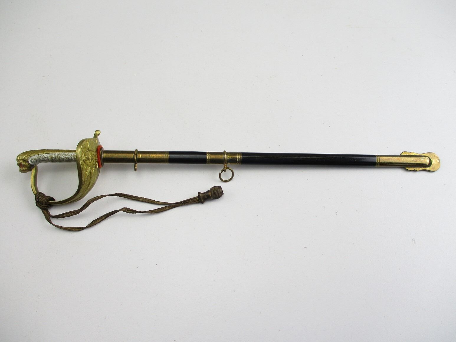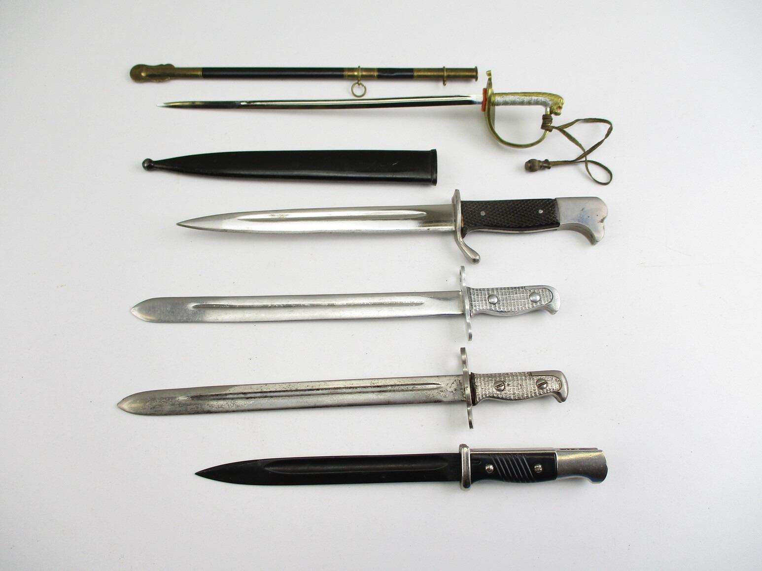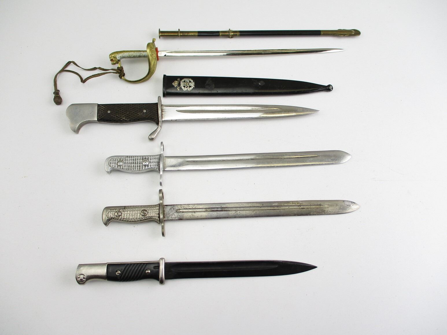ASSORTED GERMAN MINI-DAGGER / SWORD LOT, LOT INCLUDES; (1) K98 DRESS DAGGER WITH SCABBARD, SCABBARD FAINT / UN-CLEAR MARKINGS, BLADE APPROX. 5 5/8" & OAL APPROX. 9.75", (1) 1884/98 DAGGER, RICASSO MARKED: "4015, N", OTHER-SIDE MARKED: "E.U.F. HORSTER", BLADE APPROX. 4.75" & OAL APPROX. 7 3/8", (1) SWORD, BRASS HILT WITH ANCHOR SYMBOL, LION HEAD HANDLE / POMMEL, PORTAPEE, SCABBARD WITH ONE HANGER, BLADE APPROX. 7 1/8" & OAL APPROX. 8 7/8" & (2) UNKNOWN DAGGERS, METAL GRIP WITH POSSIBLE FEATHER TYPE DESIGN, ONE HAS LOOSE CROSS-PIECE, BOTH BLADES APPROX. 6.5" & OAL APPROX. 8 3/8".