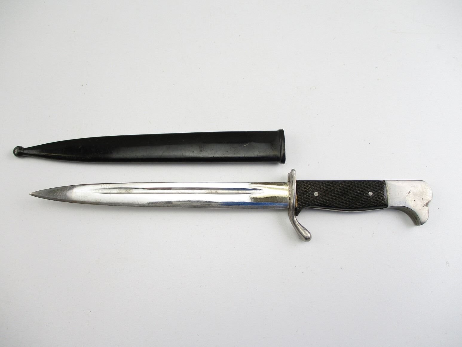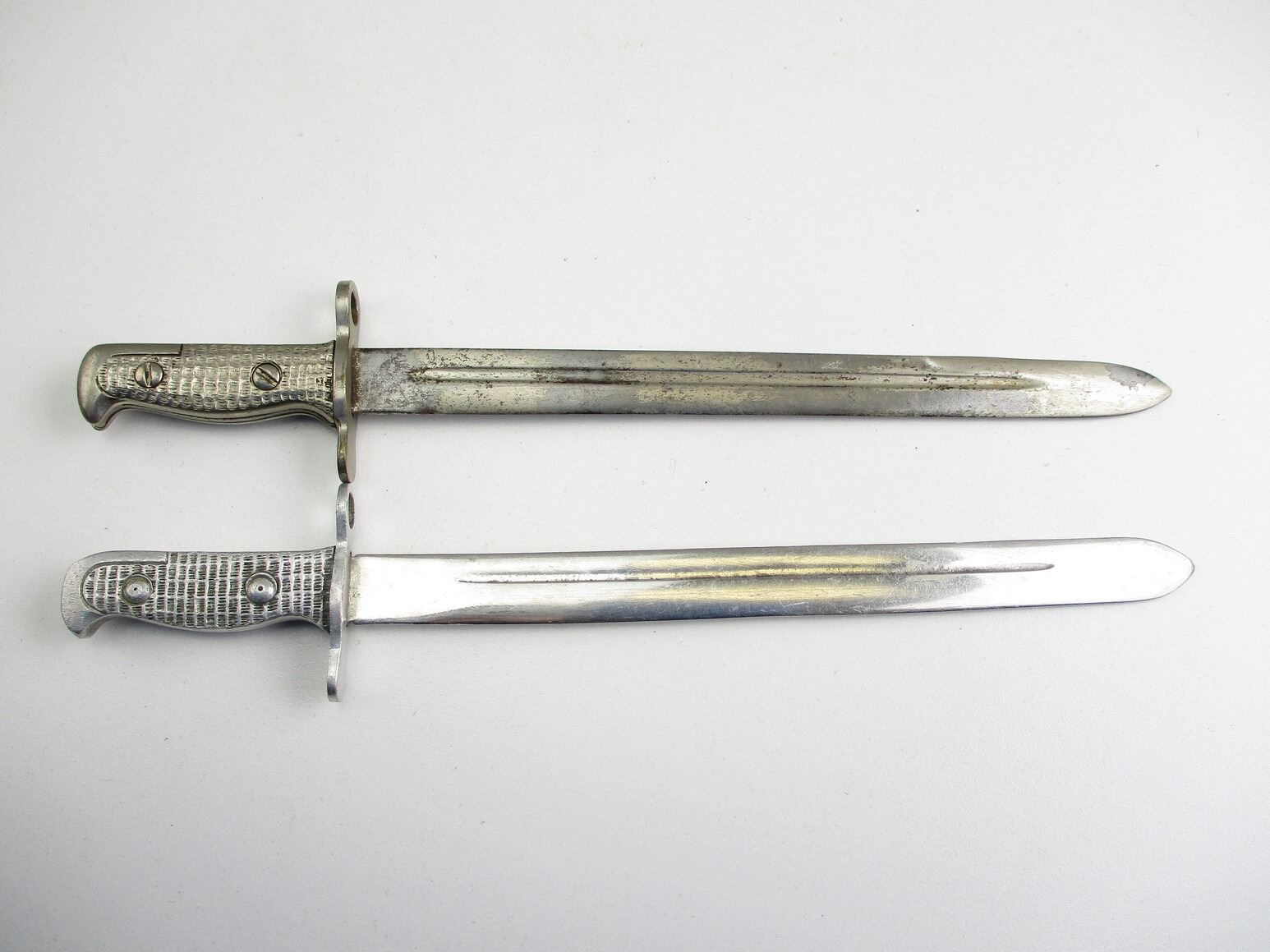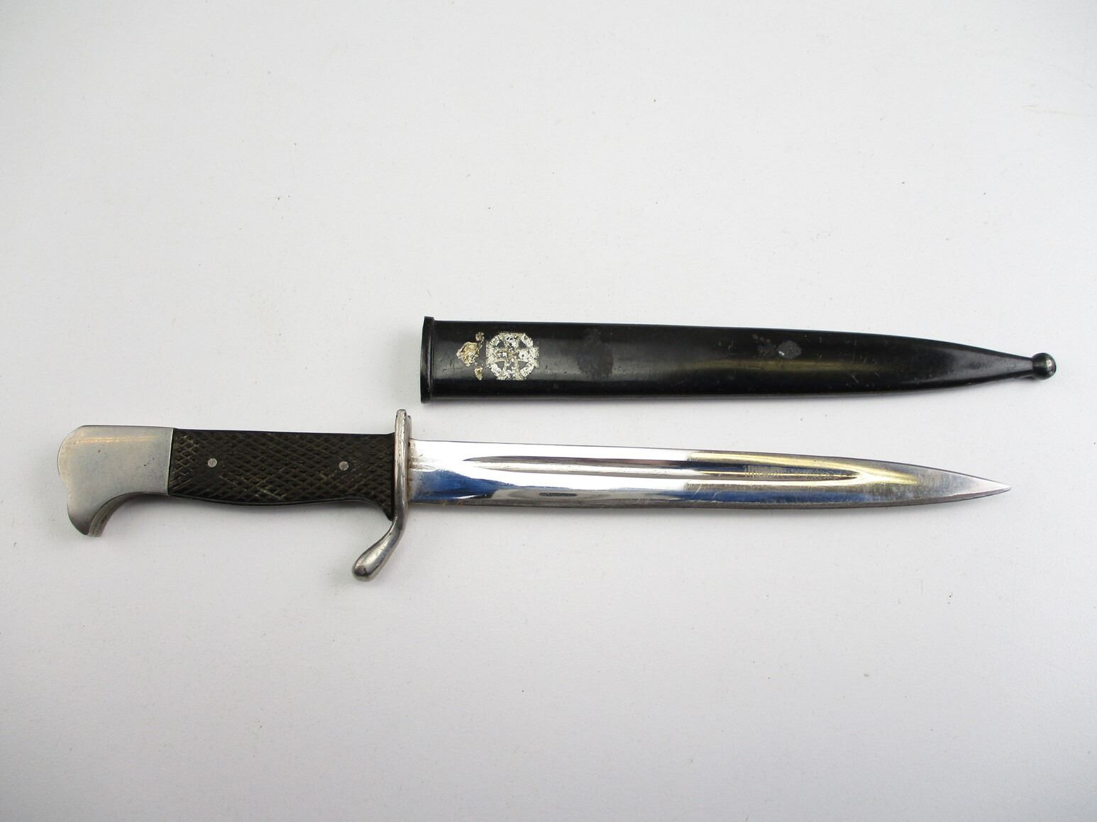 ASSORTED GERMAN MINI-DAGGER / SWORD LOT, LOT INCLUDES; (1) K98 DRESS DAGGER WITH SCABBARD, SCABBARD FAINT / UN-CLEAR MARKINGS, BLADE APPROX. 5 5/8" & OAL APPROX. 9.75", (1) 1884/98 DAGGER, RICASSO MARKED: "4015, N", OTHER-SIDE MARKED: "E.U.F. HORSTER", BLADE APPROX. 4.75" & OAL APPROX. 7 3/8", (1) SWORD, BRASS HILT WITH ANCHOR SYMBOL, LION HEAD HANDLE / POMMEL, PORTAPEE, SCABBARD WITH ONE HANGER, BLADE APPROX. 7 1/8" & OAL APPROX. 8 7/8" & (2) UNKNOWN DAGGERS, METAL GRIP WITH POSSIBLE FEATHER TYPE DESIGN, ONE HAS LOOSE CROSS-PIECE, BOTH BLADES APPROX. 6.5" & OAL APPROX. 8 3/8".