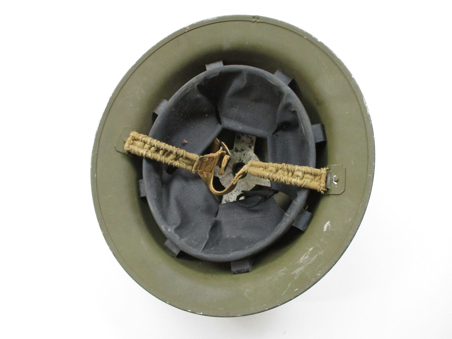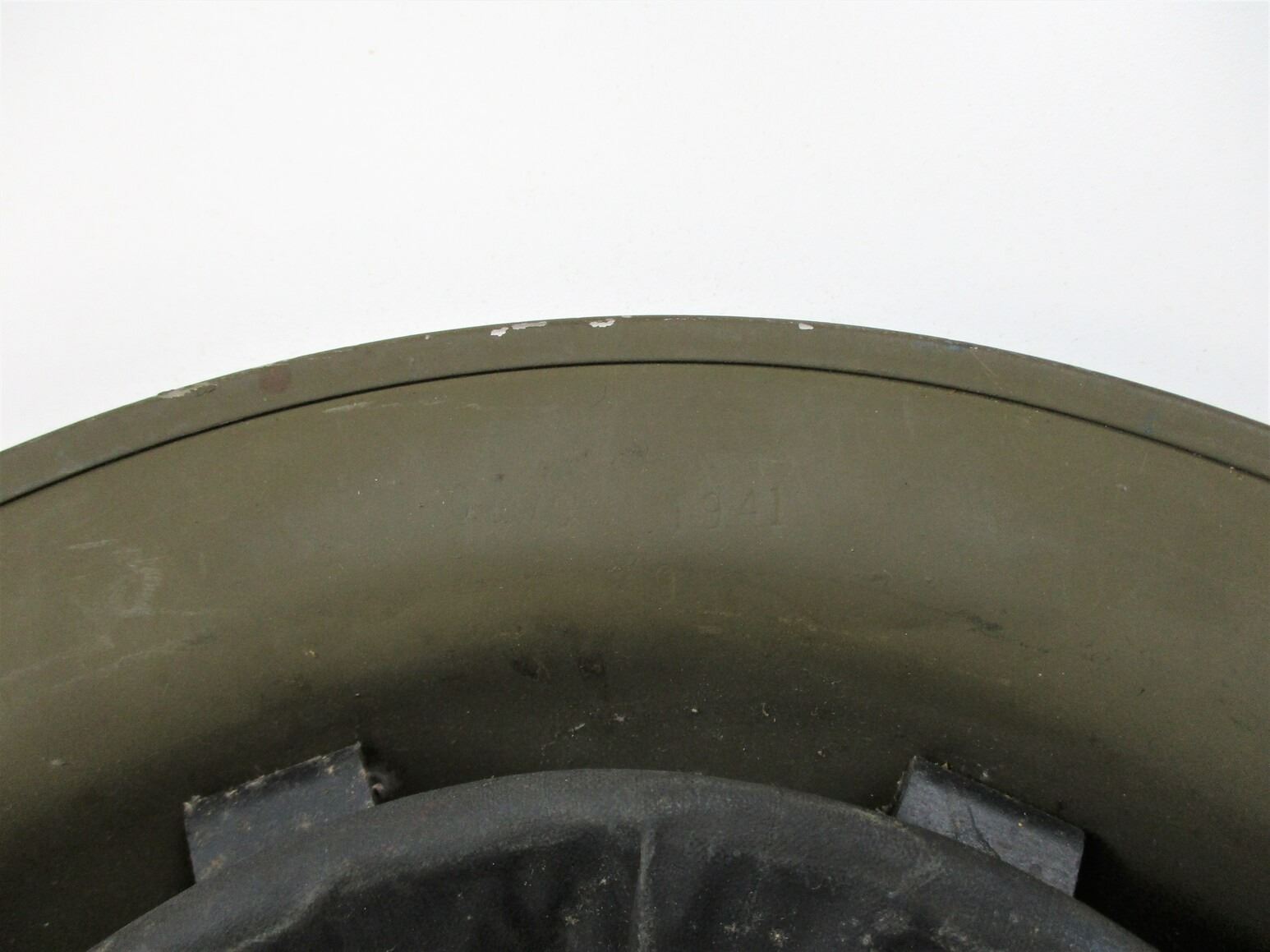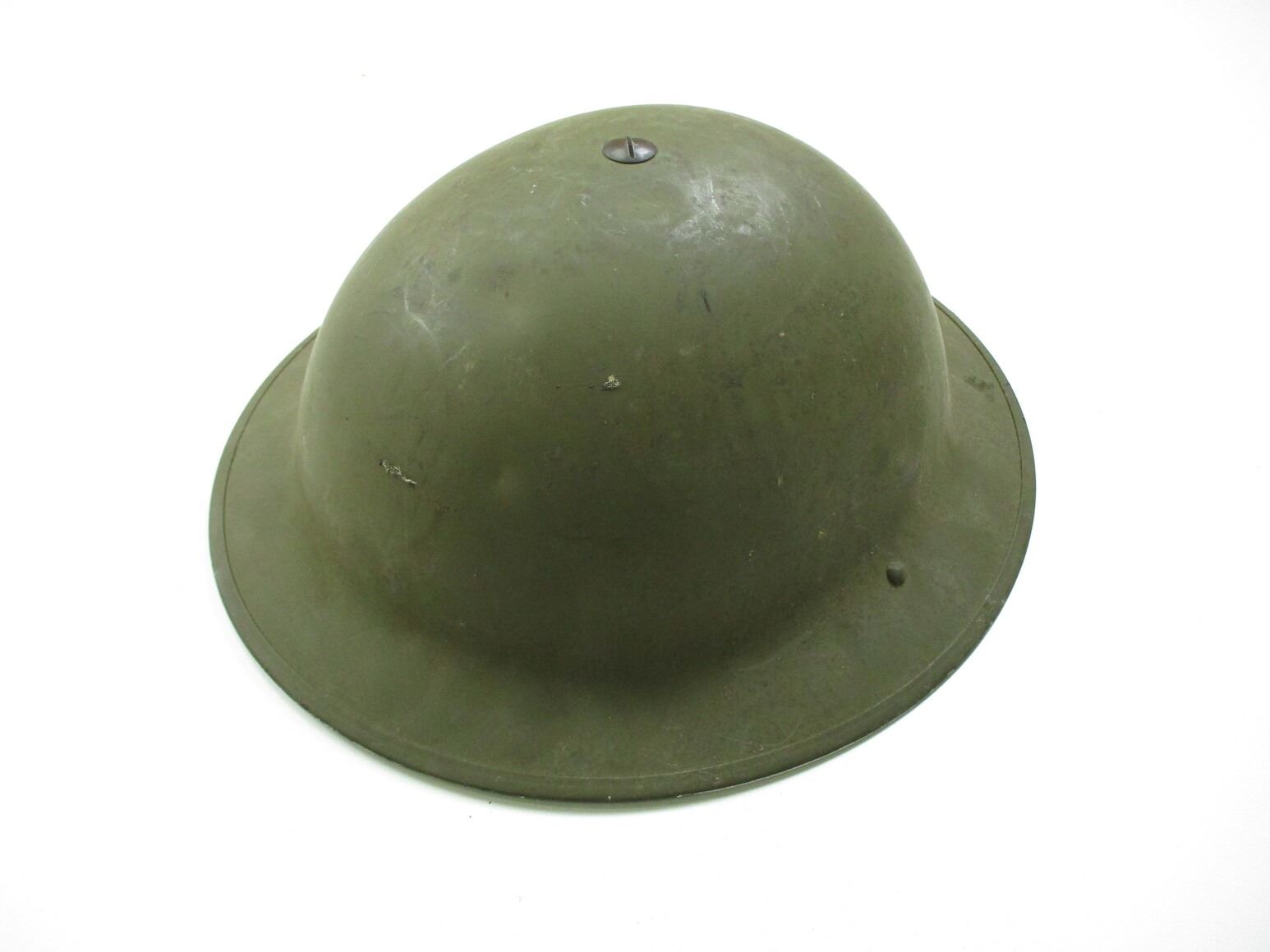 WWII CANADIAN MKII HELMET, (1) GREEN PAINTED STEEL WITH BLACK HEAD LINER, CANVAS & METAL CHIN STRAP, HELMET MARKED: "C.L./C. (CANADIAN LAMP CO.) 1941, 69" ON REAR SKIRT, HEAD LINER HAS NO MARKINGS. SEE PHOTOS.