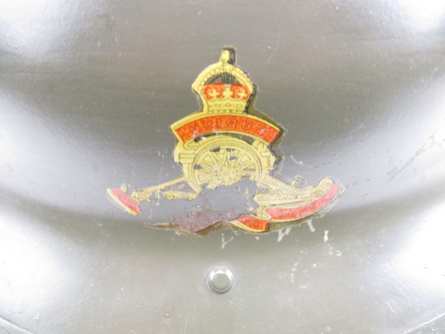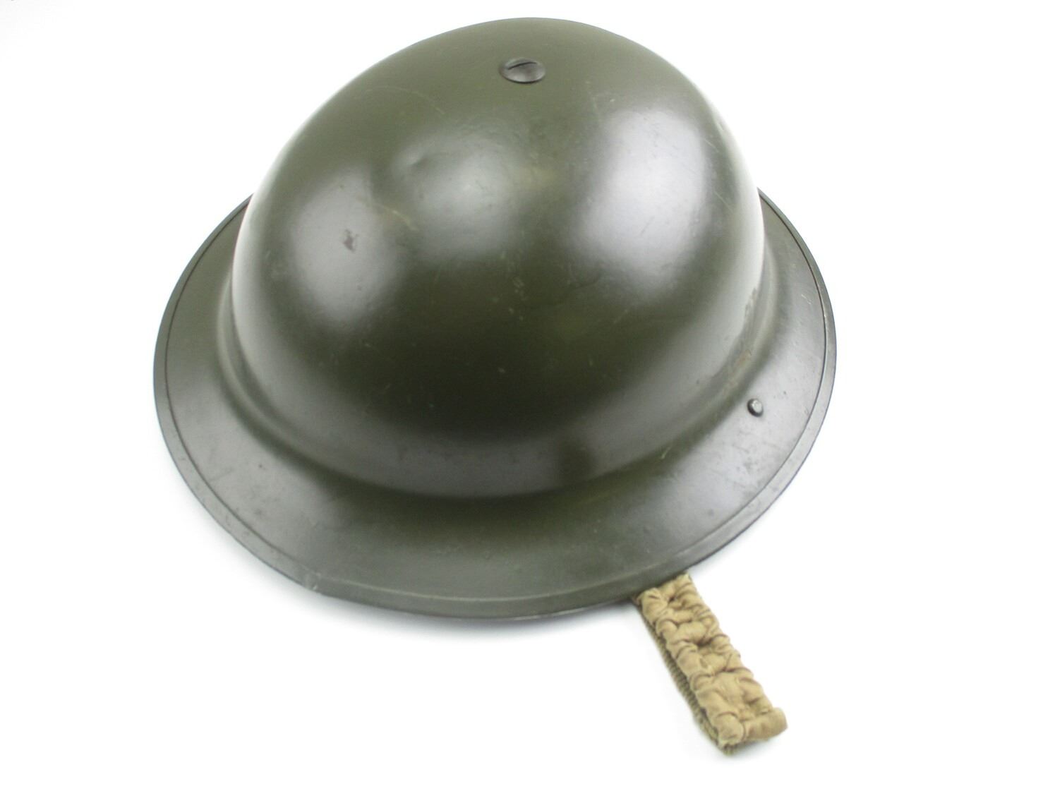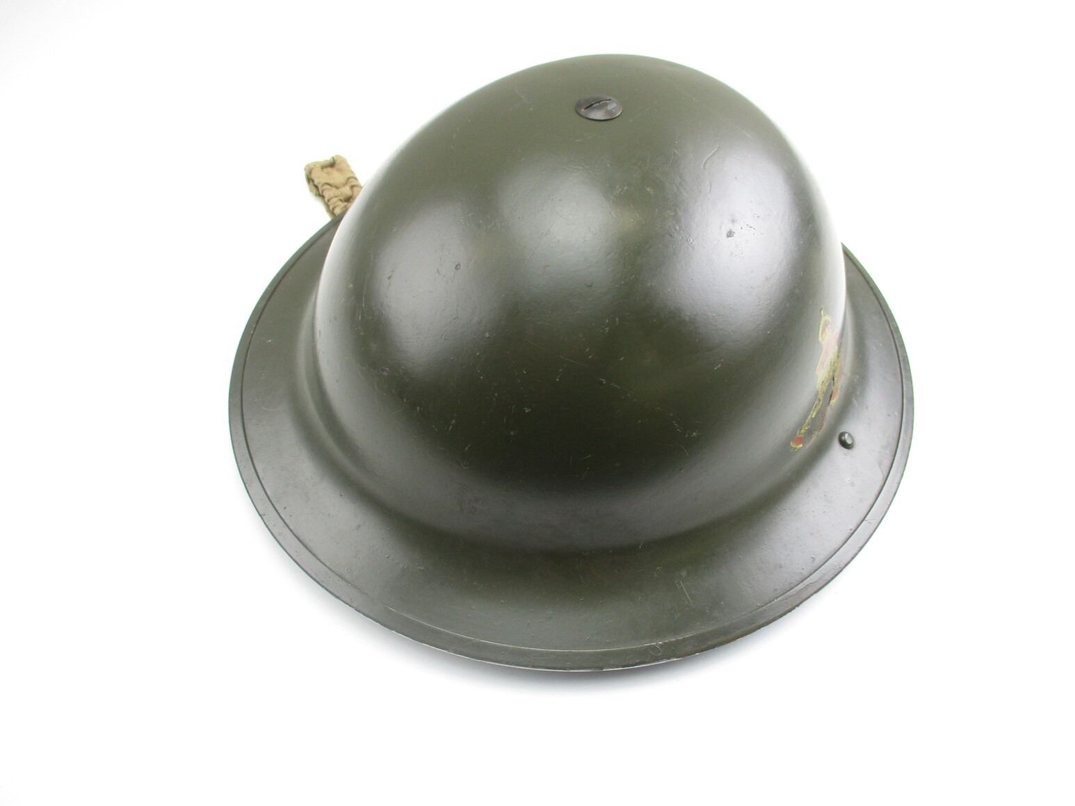WWII CANADIAN MKII HELMET, (1) GREEN PAINTED STEEL WITH BLACK HEAD LINER, CANVAS & METAL CHIN STRAP, PARTIAL ROYAL CANADIAN ARTILLERY STICKER ON ONE SIDE, HELMET MARKED: "G.S.W. (GENERAL STEEL WARES) A.G, MKII 1941" ON REAR SKIRT, NO VISIBLE MARKINGS ON HEAD LINER. SEE PHOTOS.