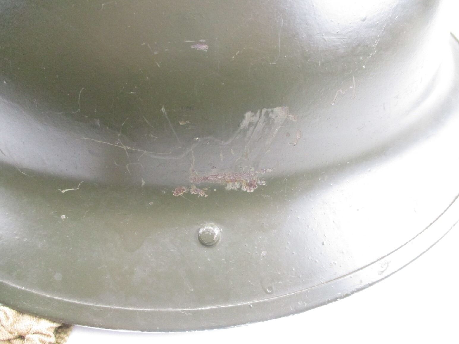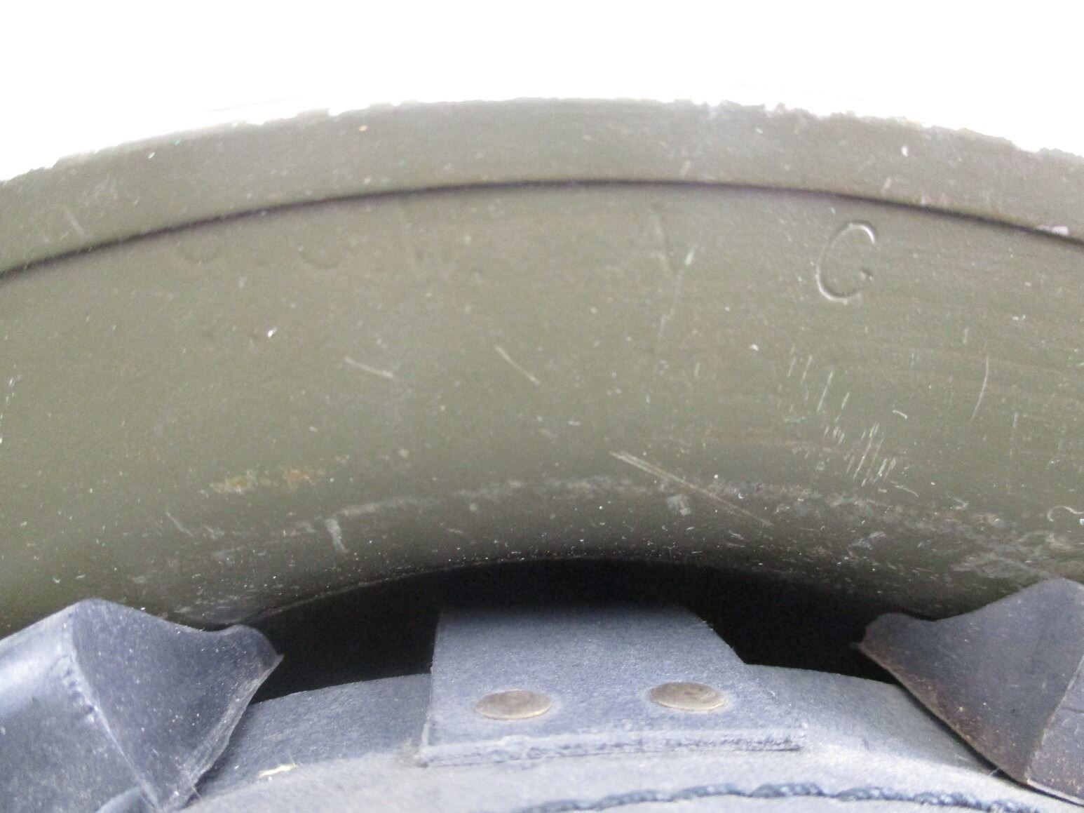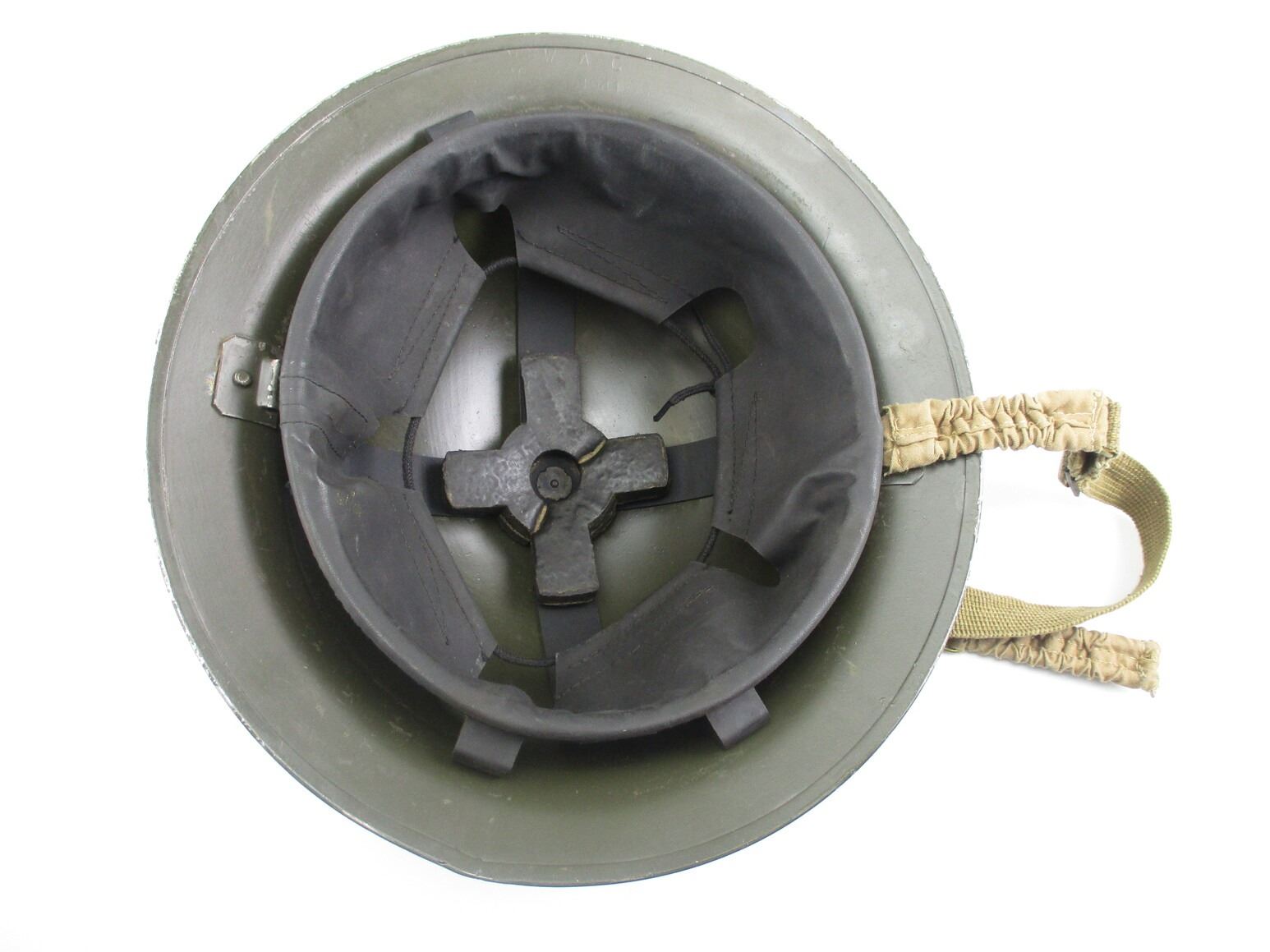 WWII CANADIAN MKII HELMET, (1) GREEN PAINTED STEEL WITH BLACK HEAD LINER, CANVAS & METAL CHIN STRAP, PARTIAL ROYAL CANADIAN ARTILLERY STICKER ON ONE SIDE, HELMET MARKED: "G.S.W. (GENERAL STEEL WARES) A.G, MKII 1941" ON REAR SKIRT, NO VISIBLE MARKINGS ON HEAD LINER. SEE PHOTOS.