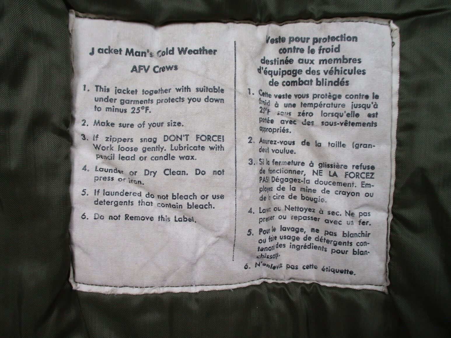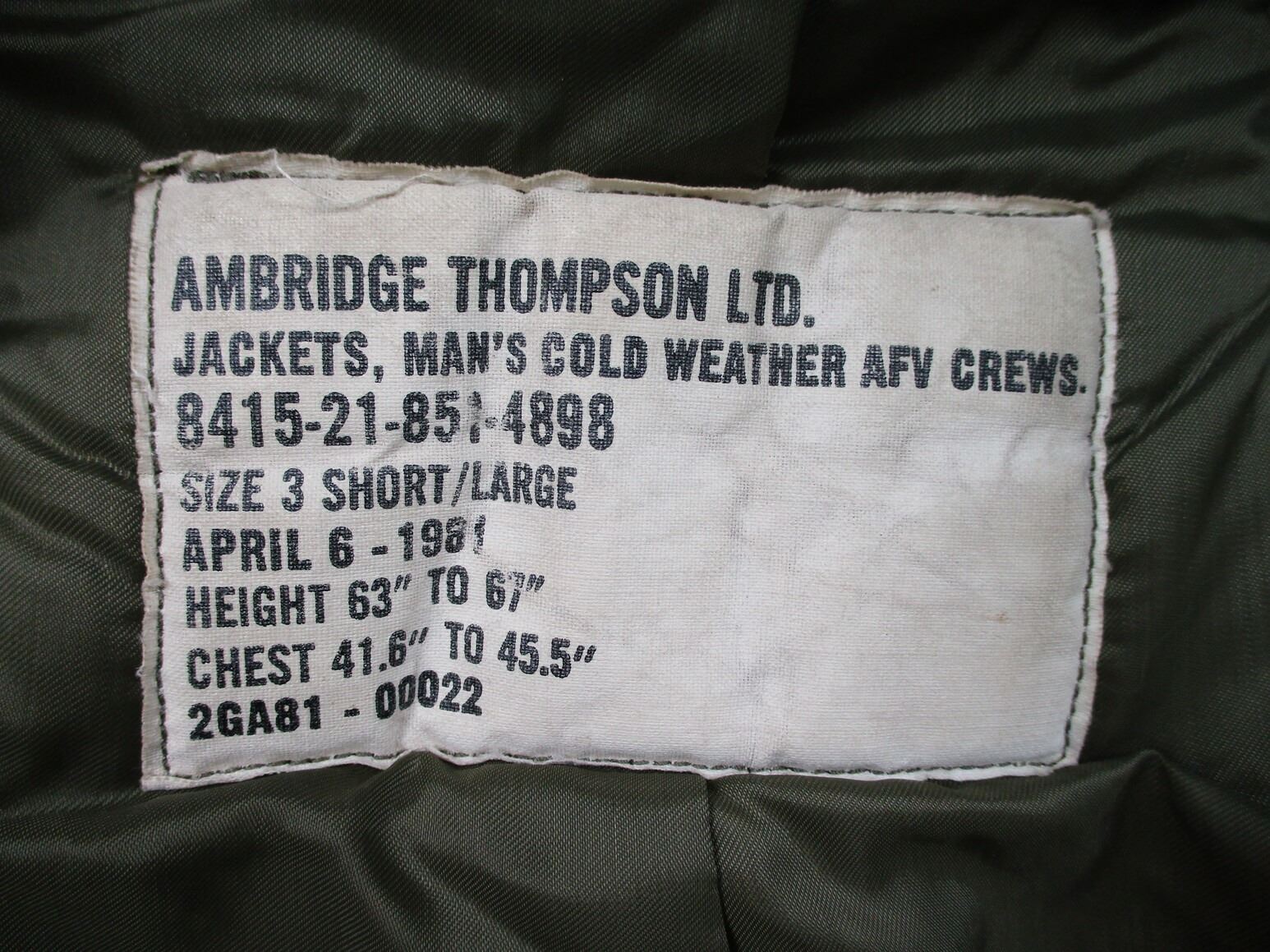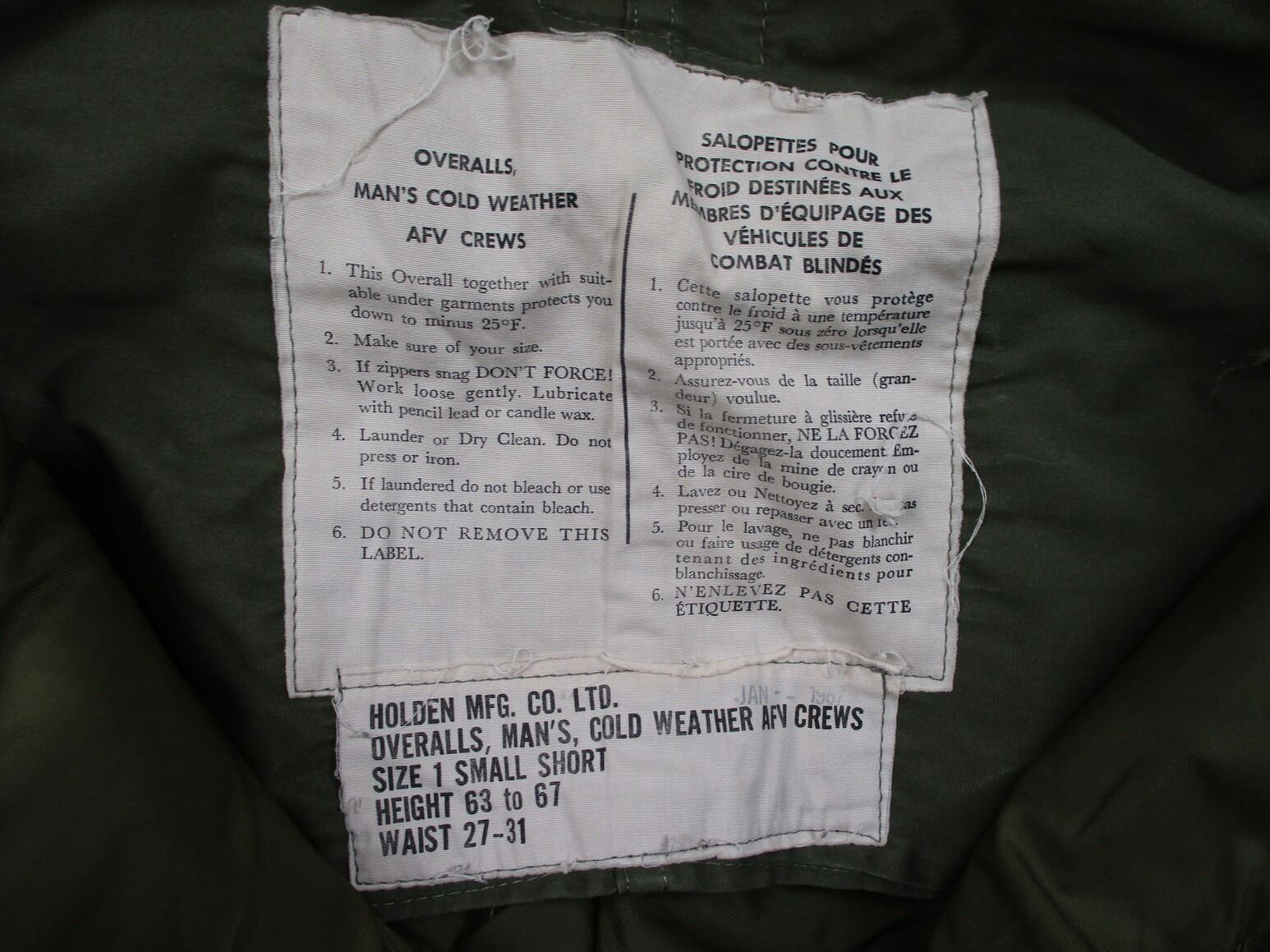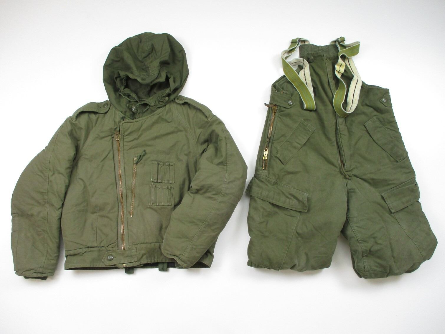 AFV CREWMAN CLOTHING LOT, LOT INCLUDES; (1) AFV CREWMAN'S JACKET, SIZE 3 SHORT LARGE & (1) AFV CREWMAN'S PANTS / OVERALLS, SIZE 1 SMALL SHORT. SEE PHOTOS.