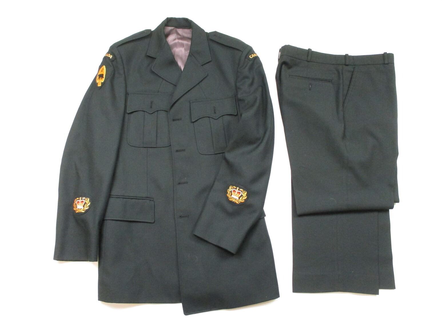 CANADIAN DRESS UNIFORM, DARK GREEN, LOT INCLUDES; (1) JACKET, SIZE: 7642 & (1) PAIR OF PANTS, SIZE: 7036. SEE PHOTOS.
