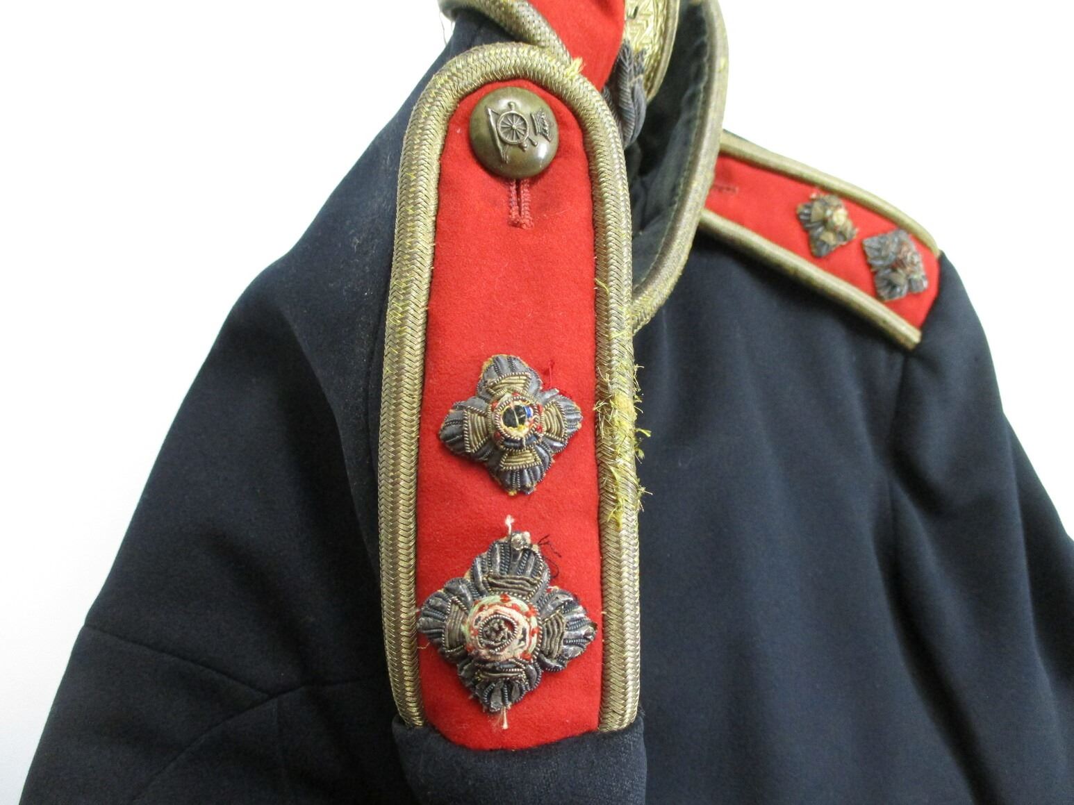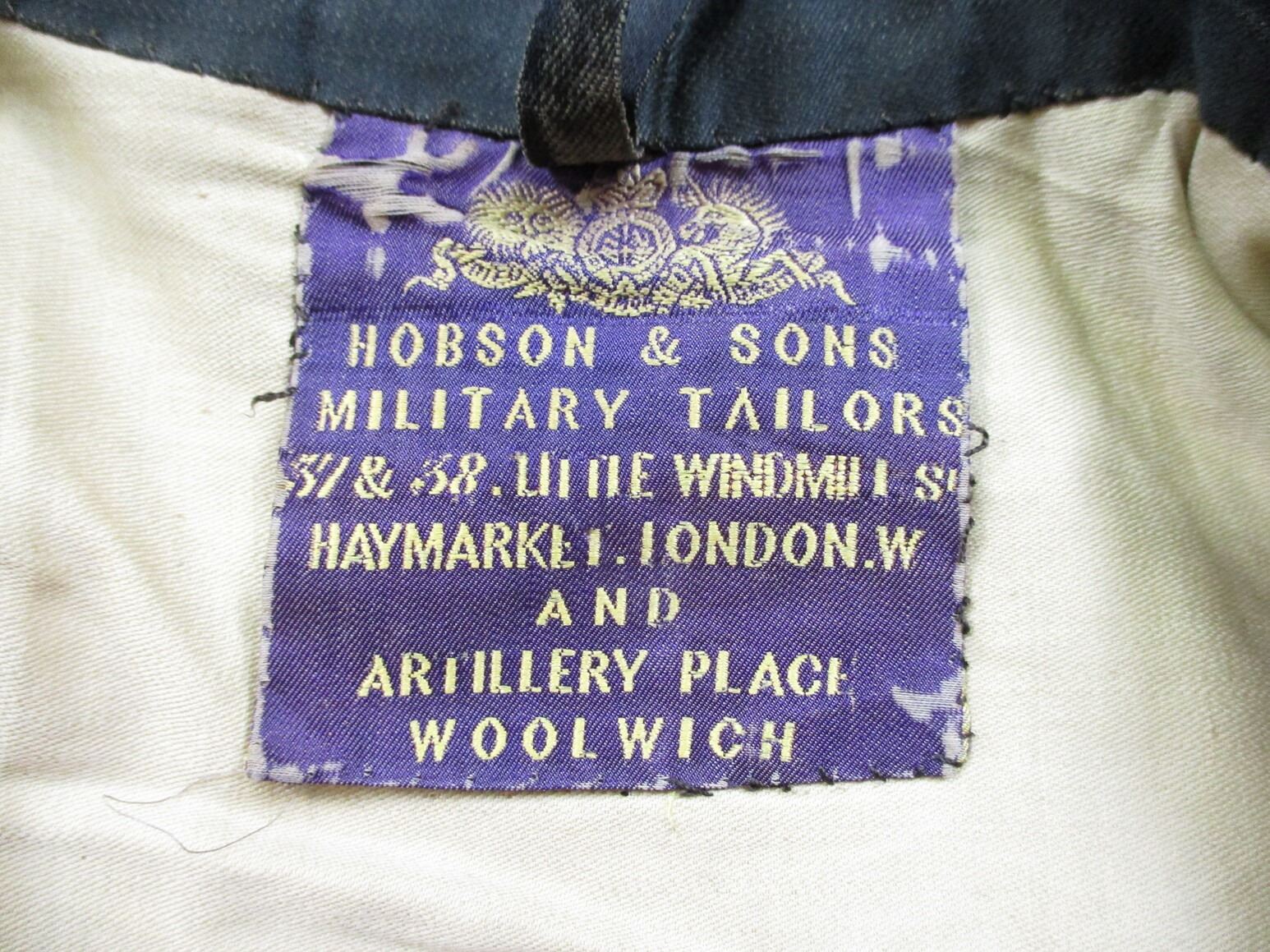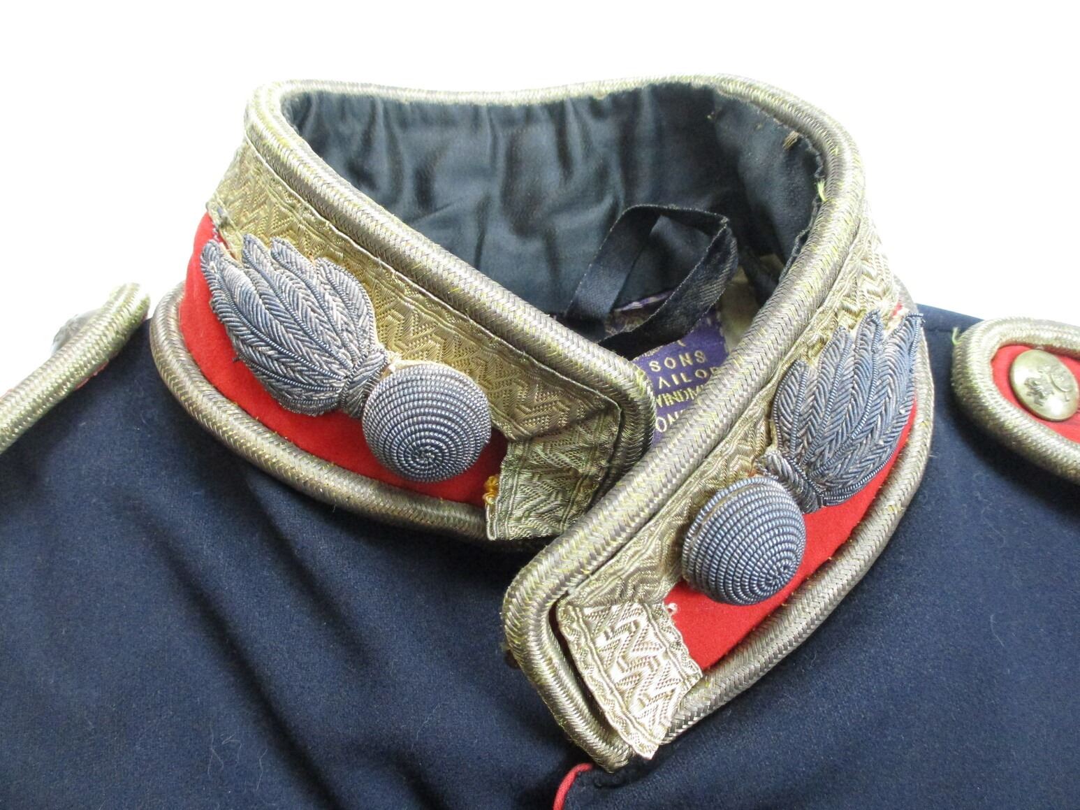 PRE-BOER / BOER WAR CANADIAN MILITARY DRESS TUNIC, (1) BLACK WITH QUILTED LINING, 5TH REGIMENT CANADIAN ARTILLERY, CAPTAIN'S RANKING, CONSIGNOR STATES: "ATTRIBUTED TO CAPTAIN M.G. BLANCHARD", GOLD ROPE TRIM, WIRE SHOULDER / NECK INSIGNIA, MARKED: "HOBSON & SONS MILITARY TAILORS, 37 & 38 LITTLE WINDMILL S?, HAYMARKET LONDON W AND ARTILLERY PLACE, WOOLWICH", SHOULDER WIDTH APPROX 15". SEE PHOTOS.