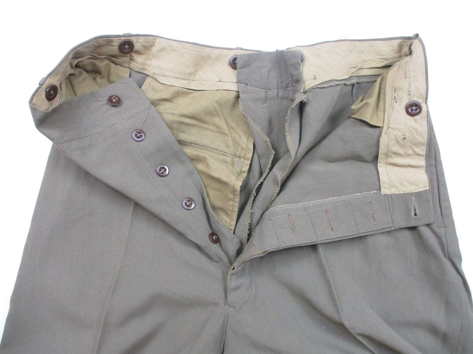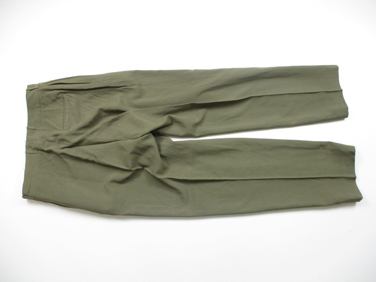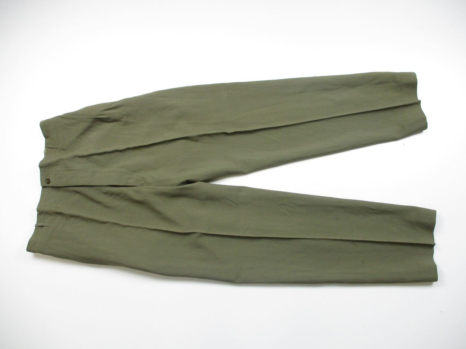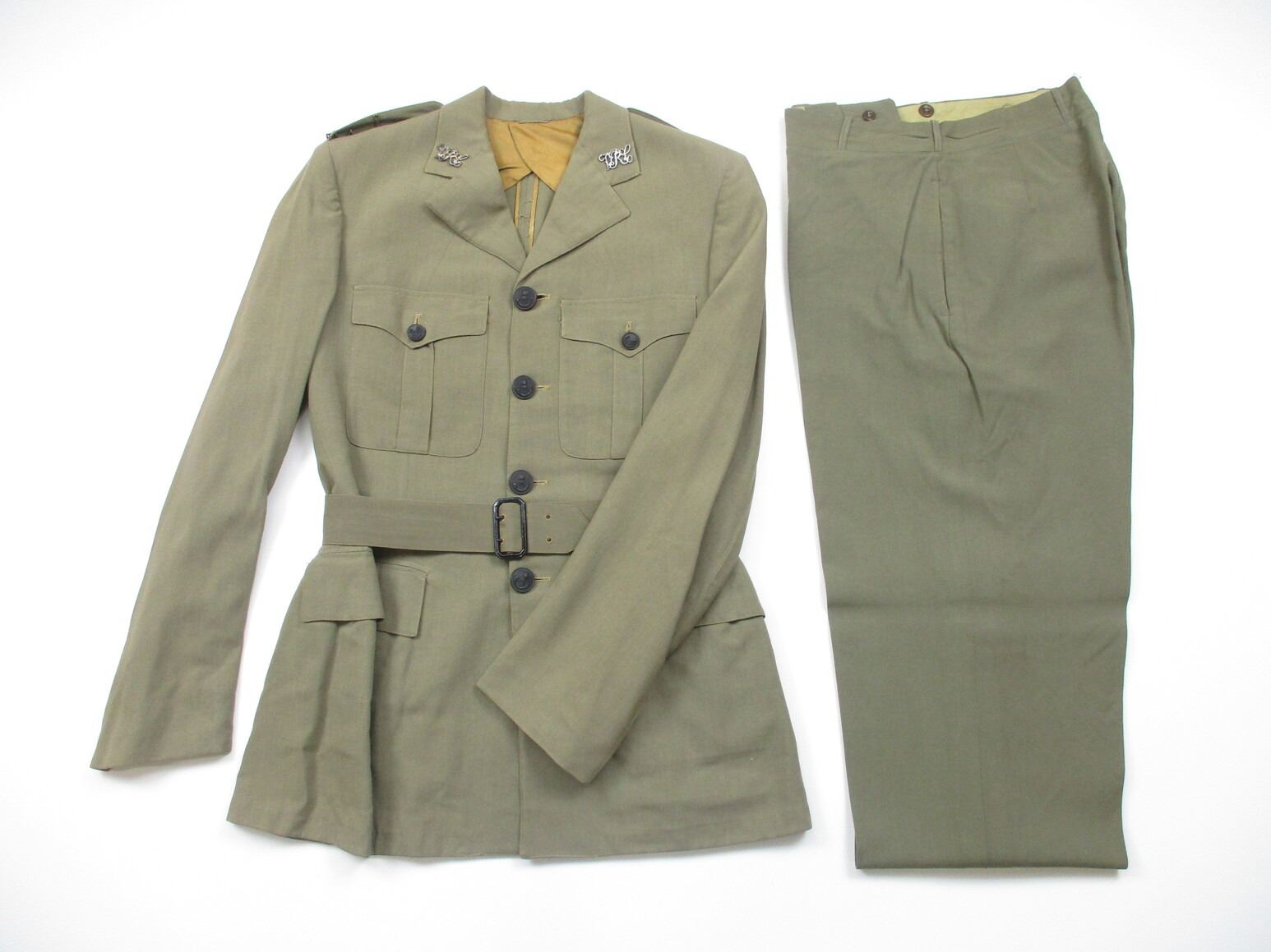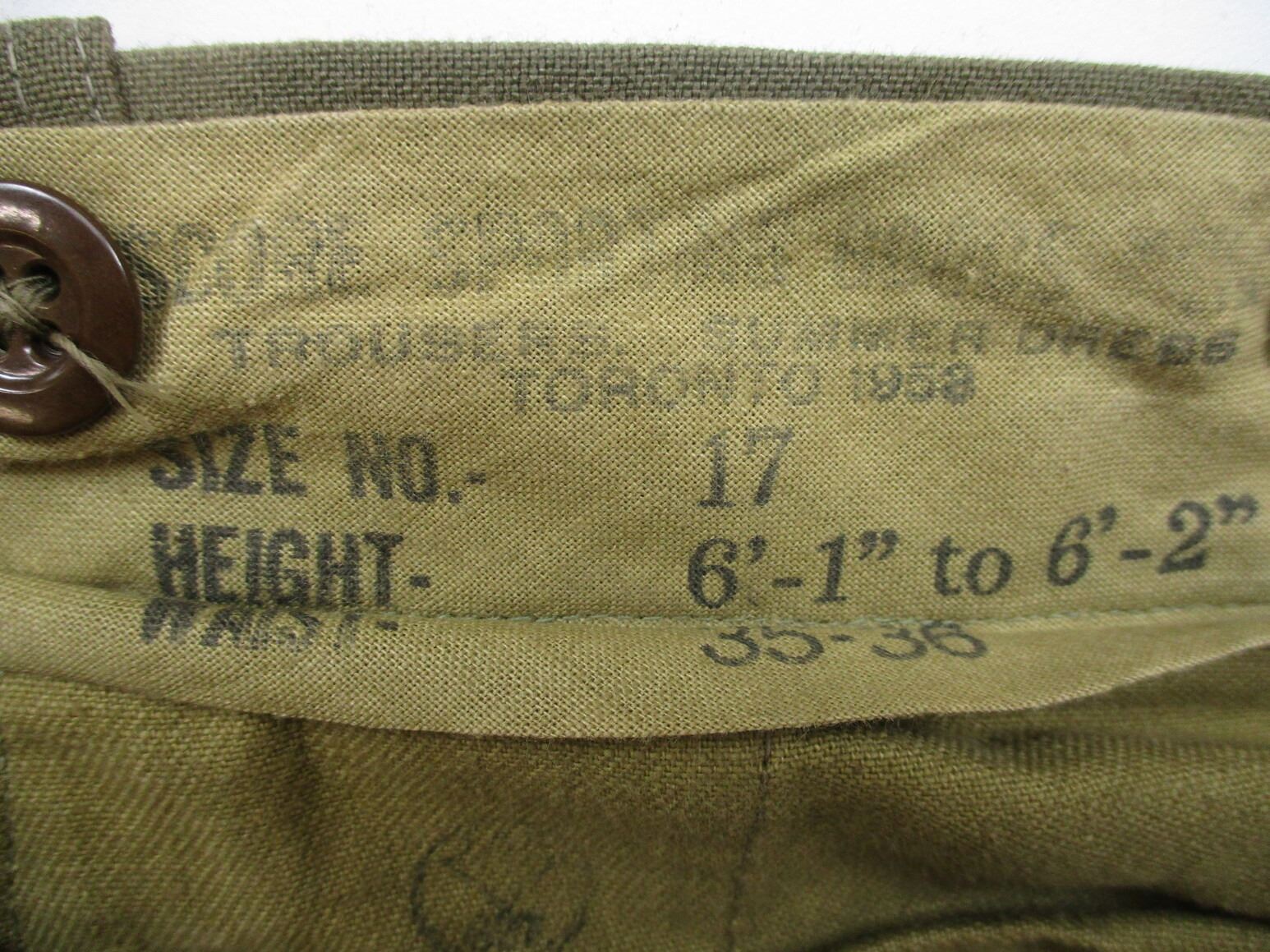 CANADIAN MILITARY TROPICAL DRESS UNIFORM, LOT INCLUDES; (1) GREEN JACKET, VICTORIA RIFLE CORPS., LIEUTENANT COLONEL RANK WITH BELT, NO VISIBLE MARKINGS, SHOULDER WIDTH APPROX. 18.5" & (1) PAIR OF GREEN DRESS PANTS, BUTTON FLY FRONT, MARKED: "TROUSERS, SUMMER DRESS, TORONTO 1958, SIZE: 36-36" & MAPLE LEAF PROOF. SEE PHOTOS.