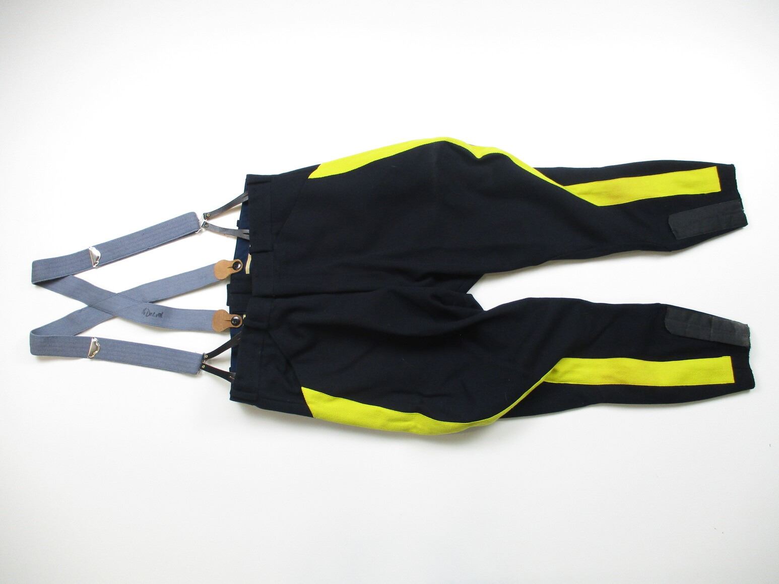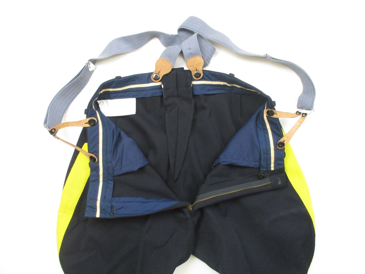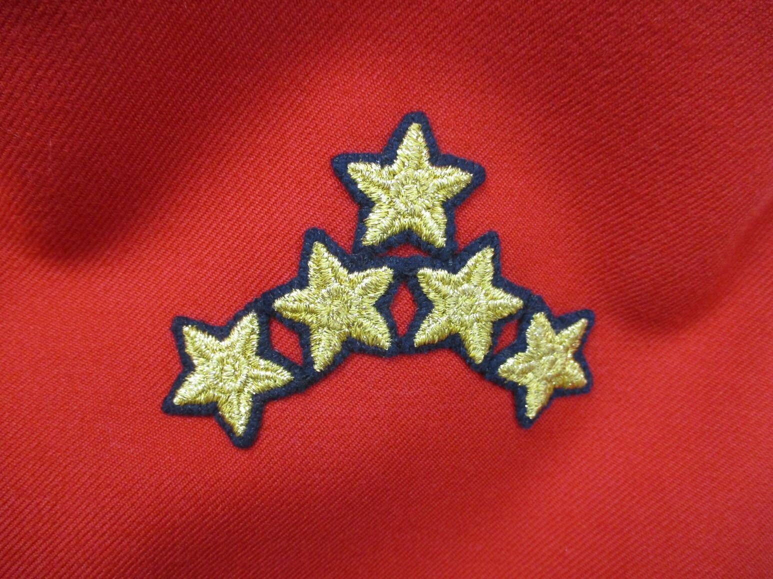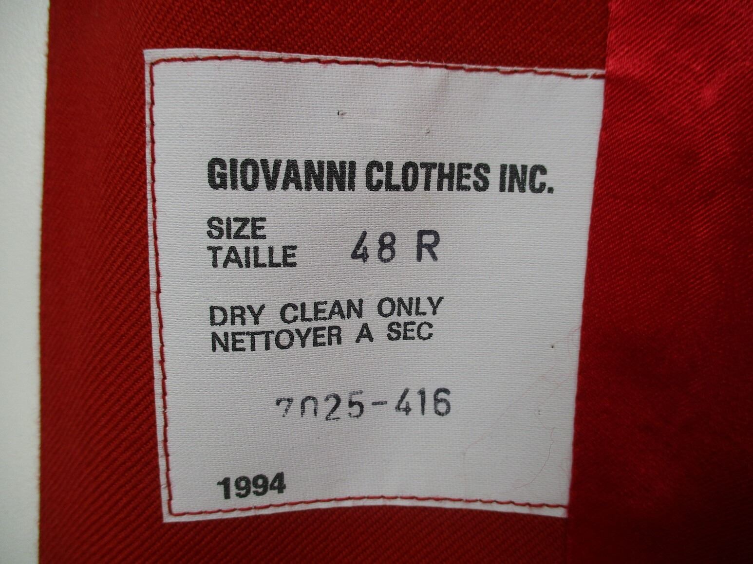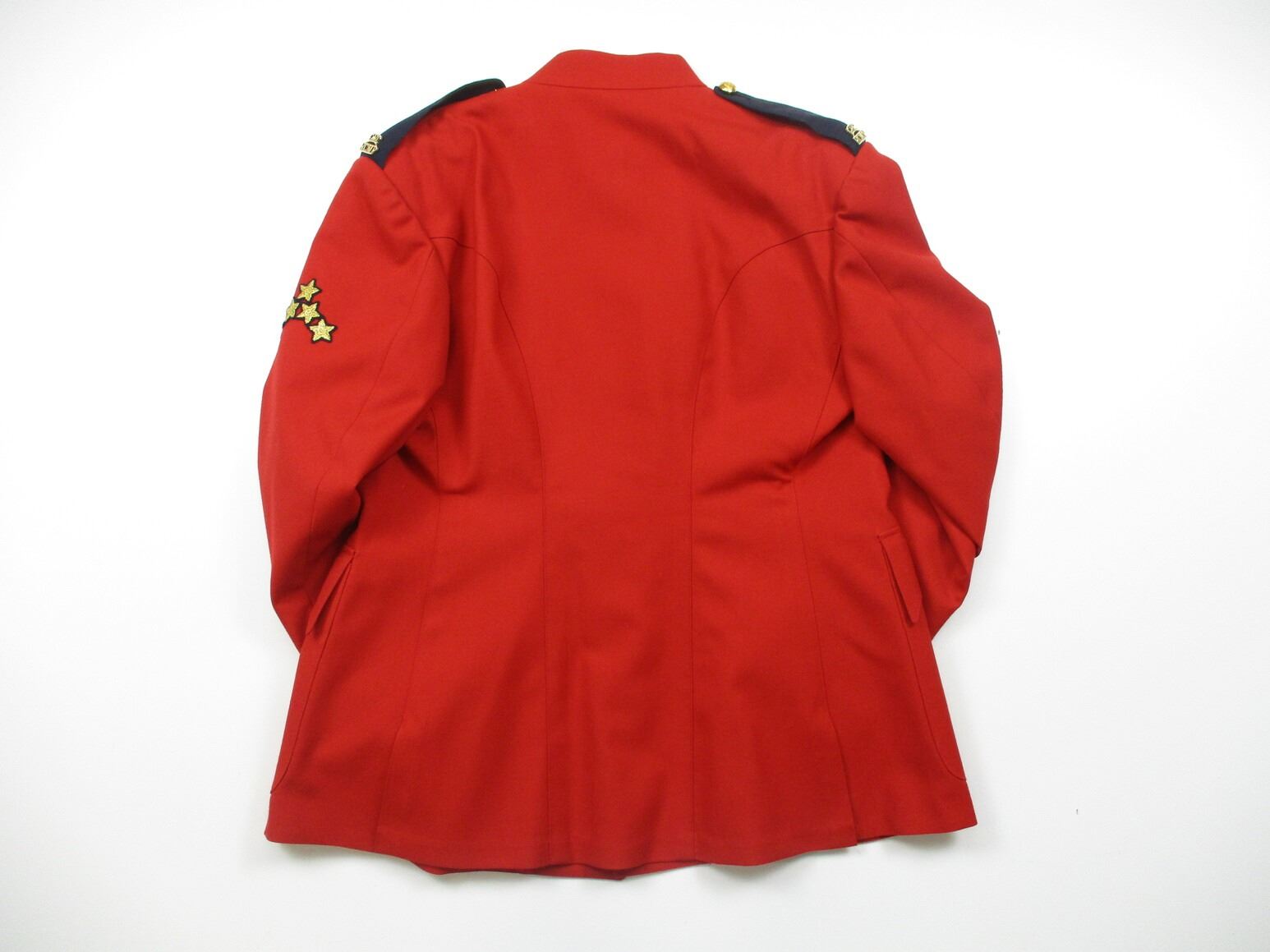 R.C.M.P. DRESS UNIFORM, LOT INCLUDES; (1) RED JACKET WITH 5-SERVICE STARS, CROSSED PISTOLS APPOINTMENT & CROSSED RIFLES APPOINTMENT, MARKED: "GIOVANNI CLOTHES INC., SIZE 48 R, 7025-416, 1994" & (1) PAIR OF BLUE PANTS WITH YELLOW STRIPE & SUSPENDERS, FAINT / UN-CLEAR MARKINGS & 1985, WAIST APPROX. 33". SEE PHOTOS. PLEASE CHECK YOUR PROVINCIAL LAWS/RESTRICTIONS BEFORE BIDDING ON THIS ITEM. WE WILL NOT SHIP THIS ITEM TO NOVA SCOTIA.