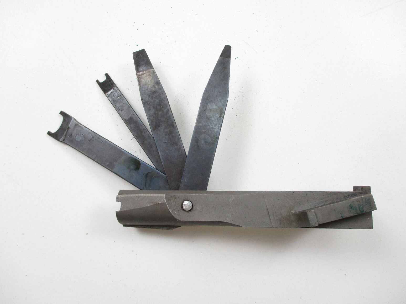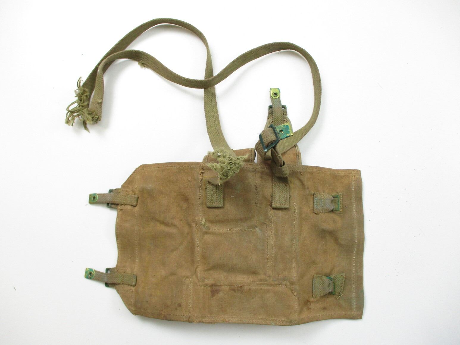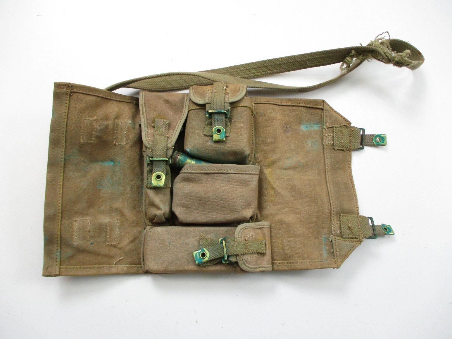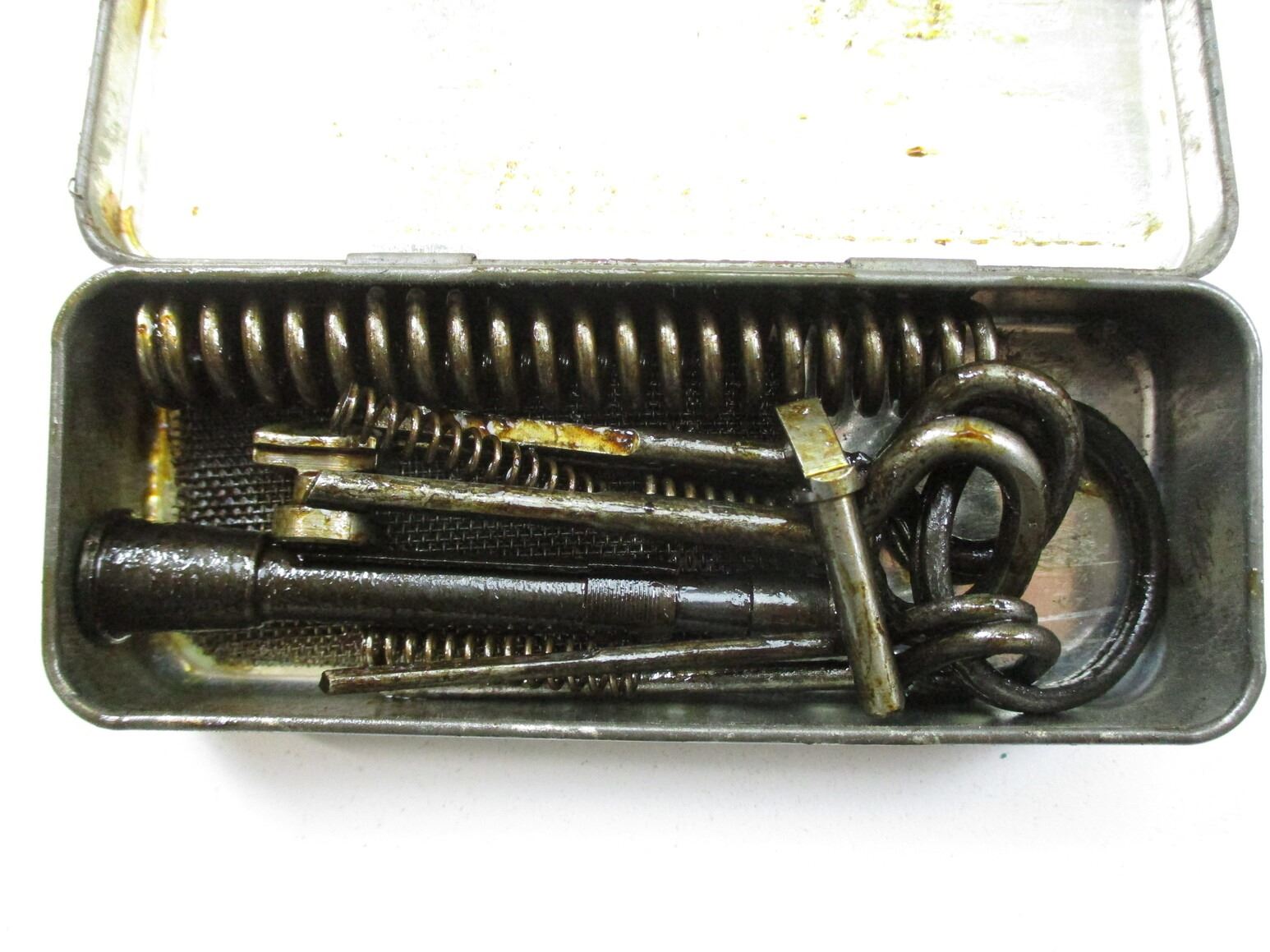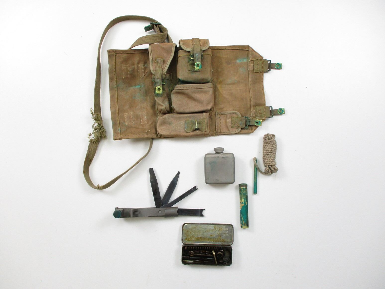 WWII BRITISH BREN LMG GUNNERS KIT, (1) P37 WEB POUCH WITH FRAYED STRAP, STEEL & BRASS OILER, MK I TOOL WITH VARIOUS BLADES, SPARE PARTS KIT WITH EXTRACTOR, FIRING PIN & OTHER PARTS, GAS REAMER KEYS, VARIOUS MARKINGS & BROAD ARROWS ON ITEMS. SEE PHOTOS.