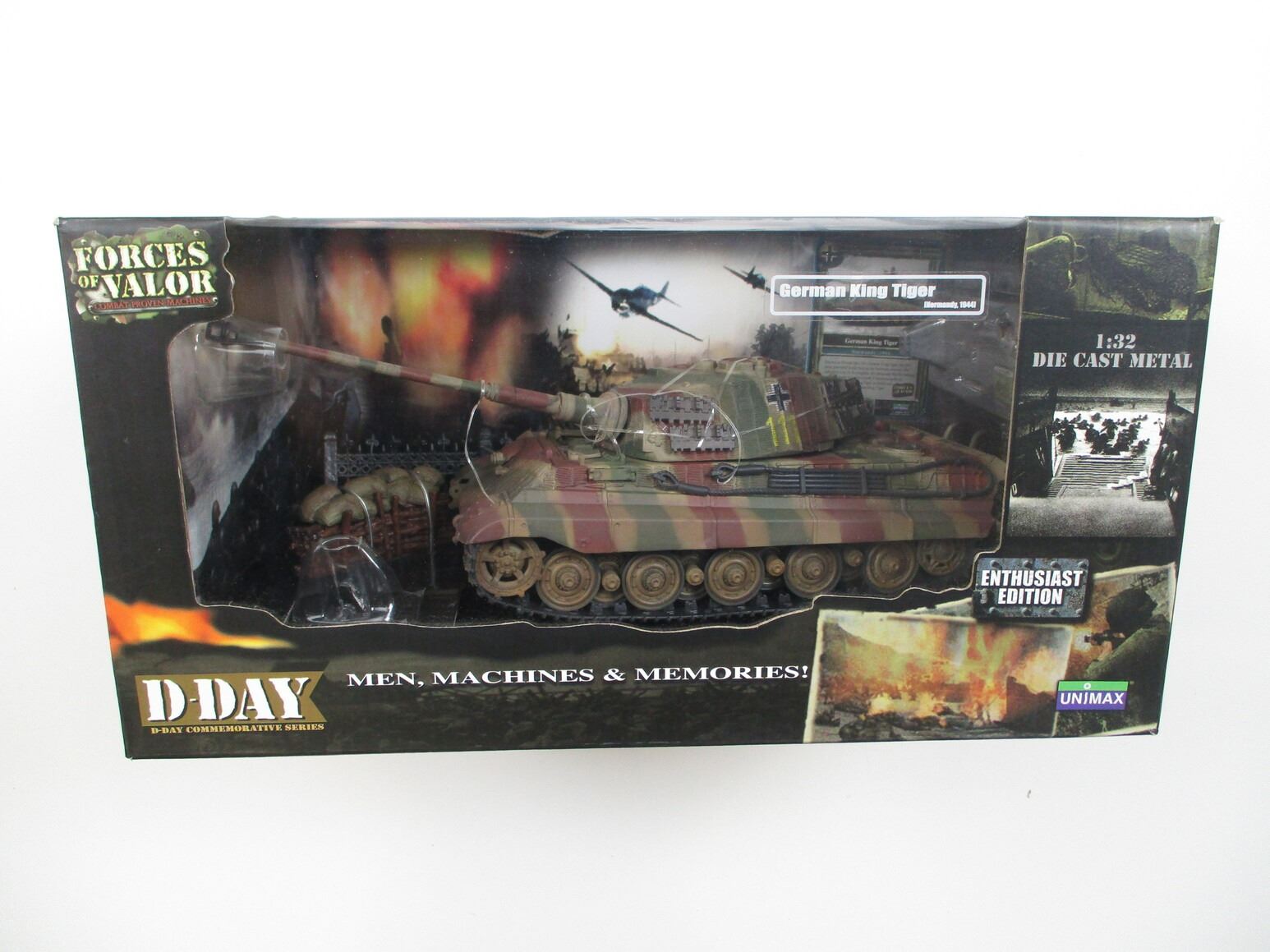 FORCES OF VALOR, D-DAY, GERMAN KING TIGER TOY, (1) 1:32 DIE CAST METAL, "NORMANDY 1944", "ENTHUSIAST EDITION", "D-DAY COMMEMORATIVE SERIES", "MEN, MACHINES & MEMORIES", IN ORIGINAL PACKAGING, NOS, APPROX. 14.25" X 8" X 7". SEE PHOTOS.