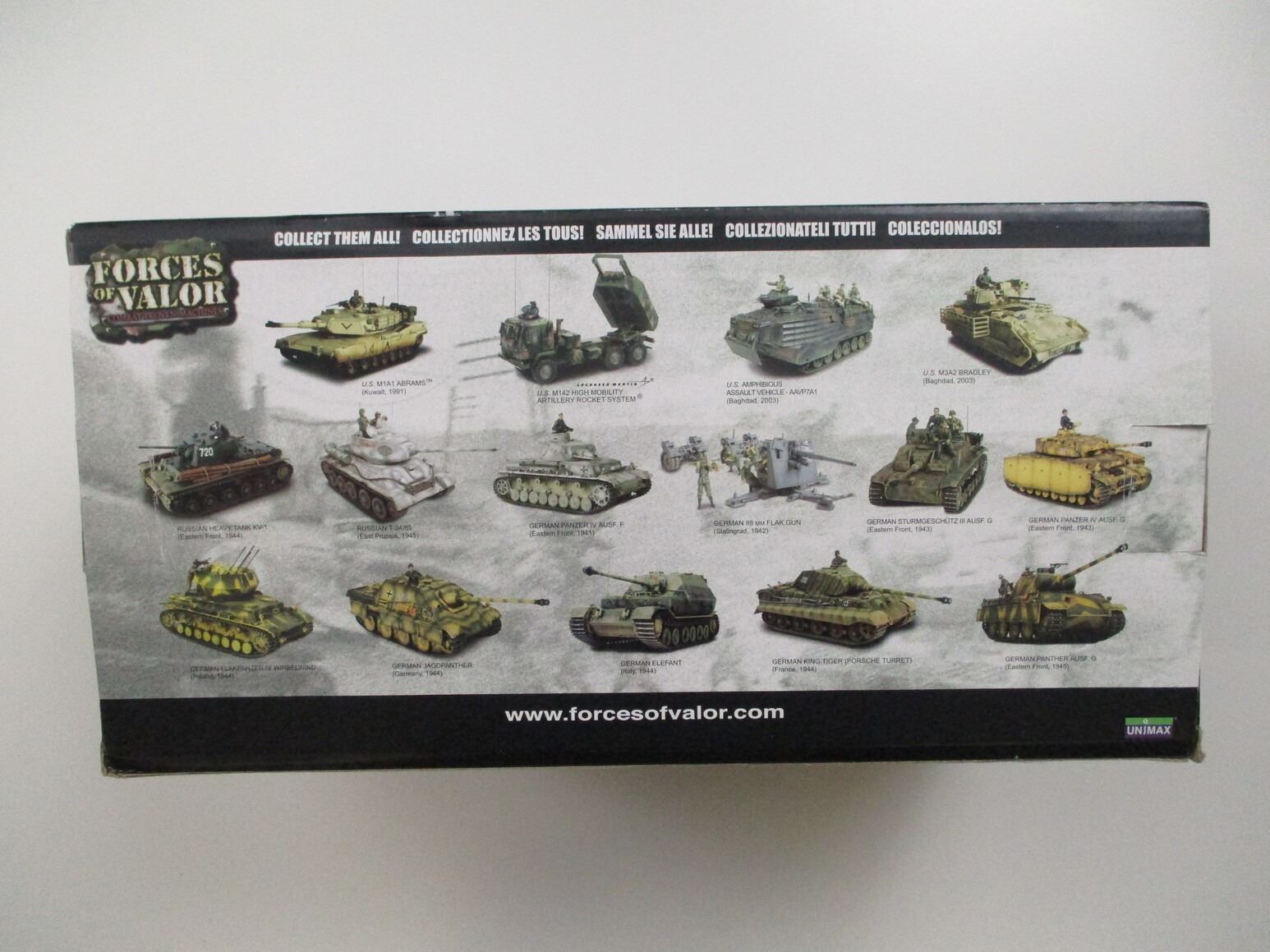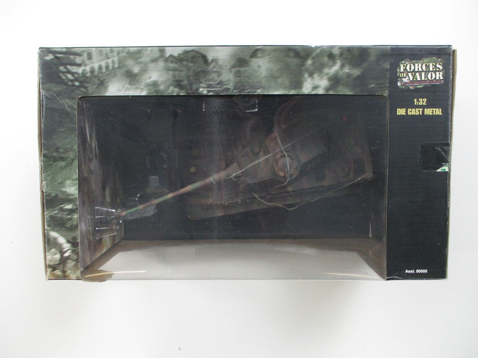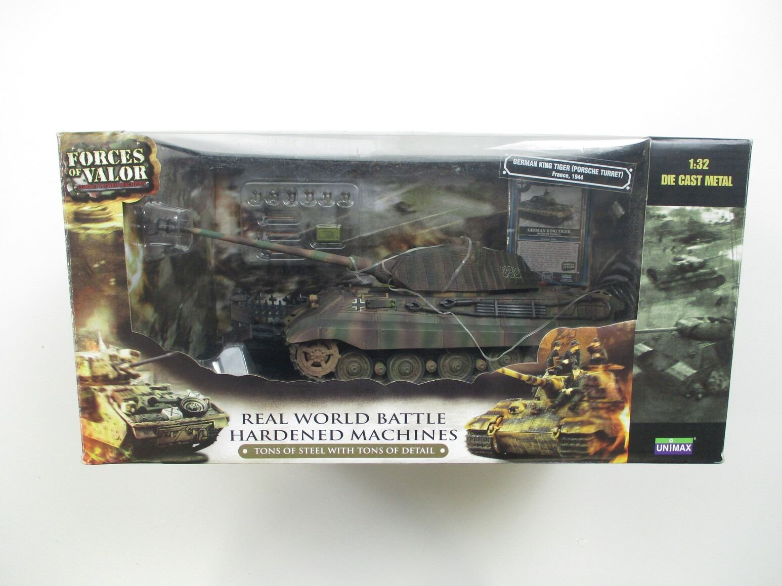 FORCES OF VALOR, GERMAN KING TIGER (PORSCHE TURRET) TOY, (1) 1:32 DIE CAST METAL, "FRANCE 1944", "REAL WORLD BATTLE HARDENED MACHINES", "TONS OF STEEL WITH TONS OF DETAIL", IN ORIGINAL PACKAGING, NOS, APPROX. 14.25" X 8" X 7". SEE PHOTOS.