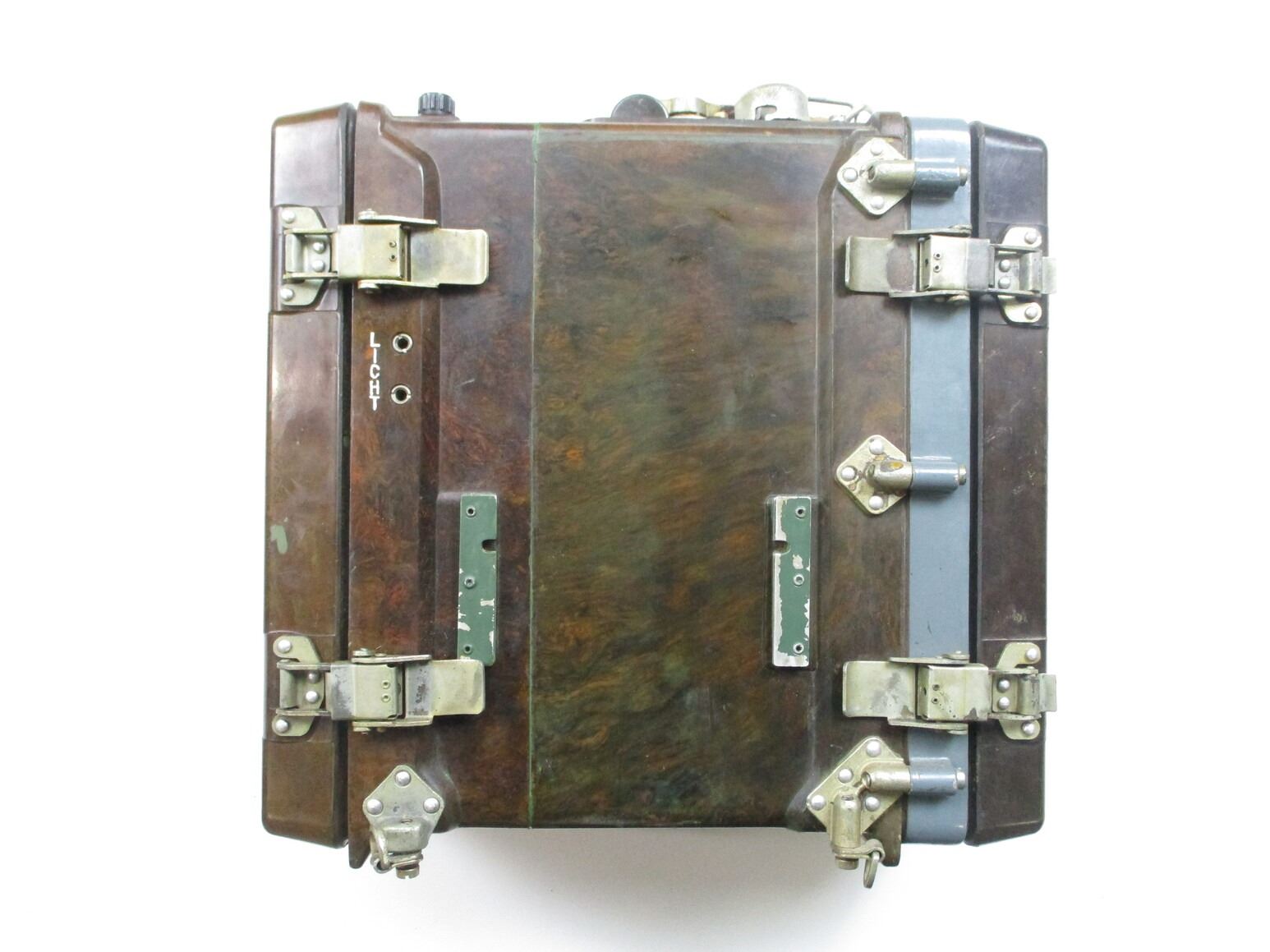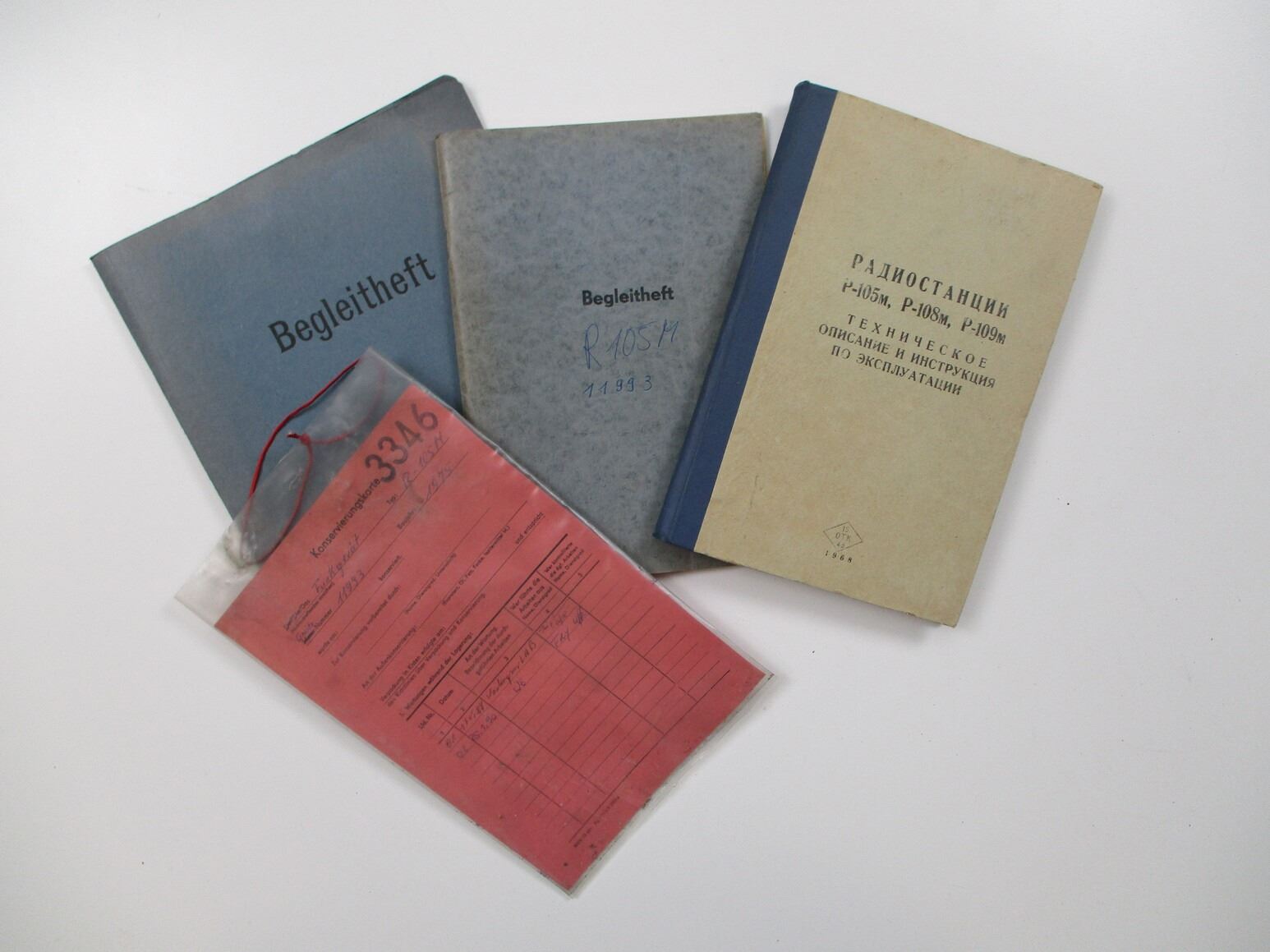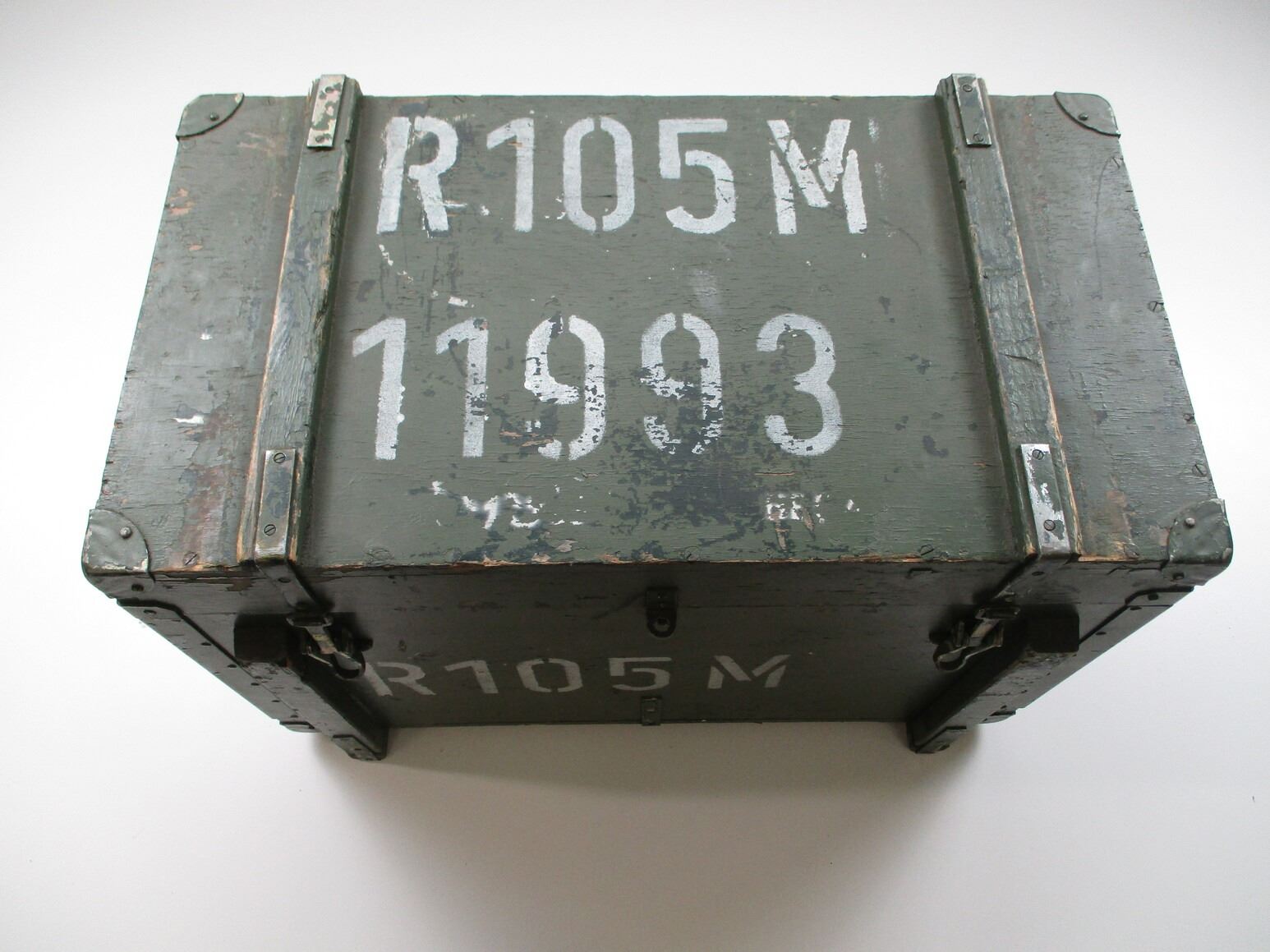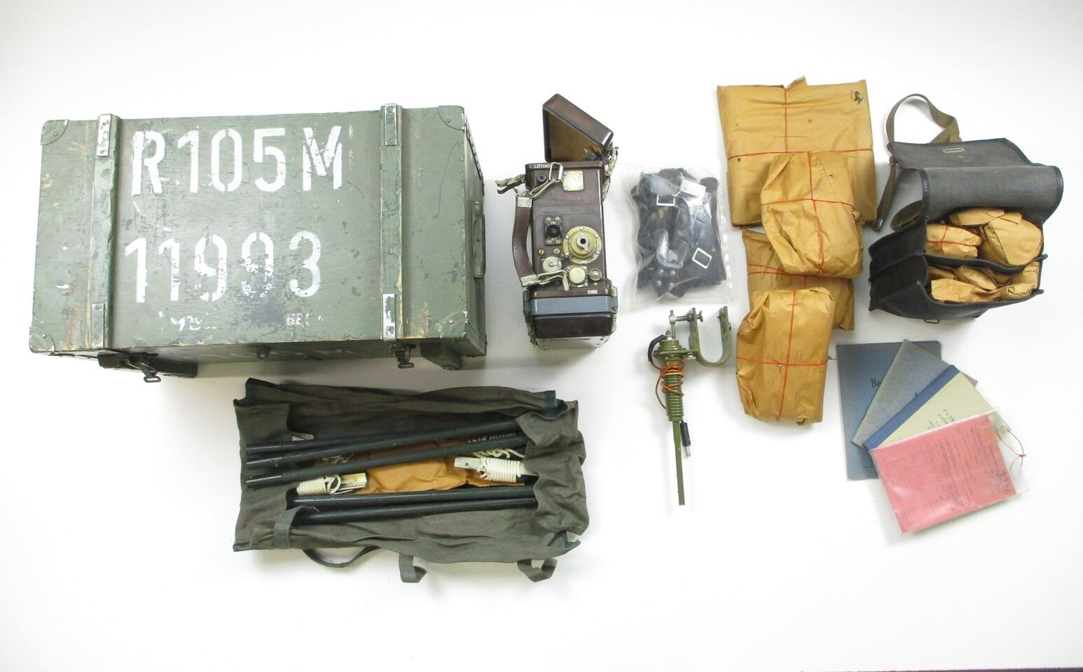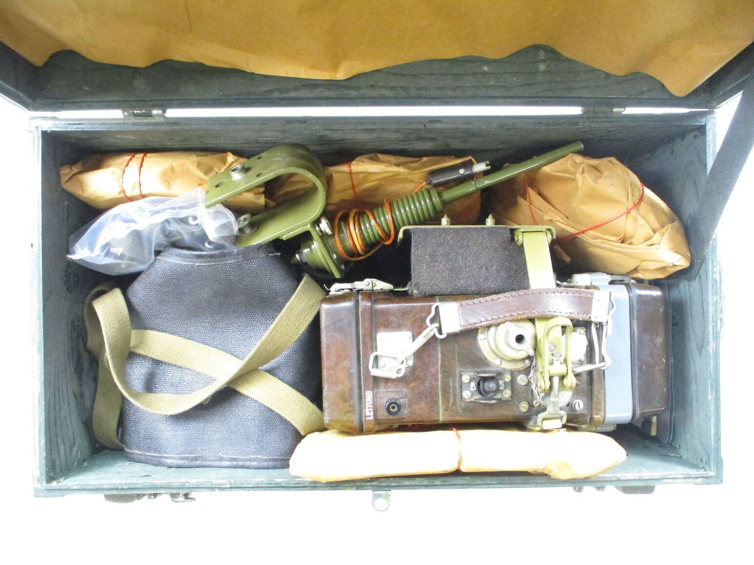 GERMAN RADIO BACKPACK KIT WITH CARRY CASE, LOT INCLUDES; (1) RADIO WITH ANTENNA, STRAPS, INSTRUCTIONS, EXTRA PIECES, APPEARS NOS, BUILT IN 1975, WOOD CARRY CASE FOR KIT WITH METAL LATCHES & HANDLES, MARKED: "R105M, 11993", APPROX. 23.5" X 12.75" X 16". SEE PHOTOS.