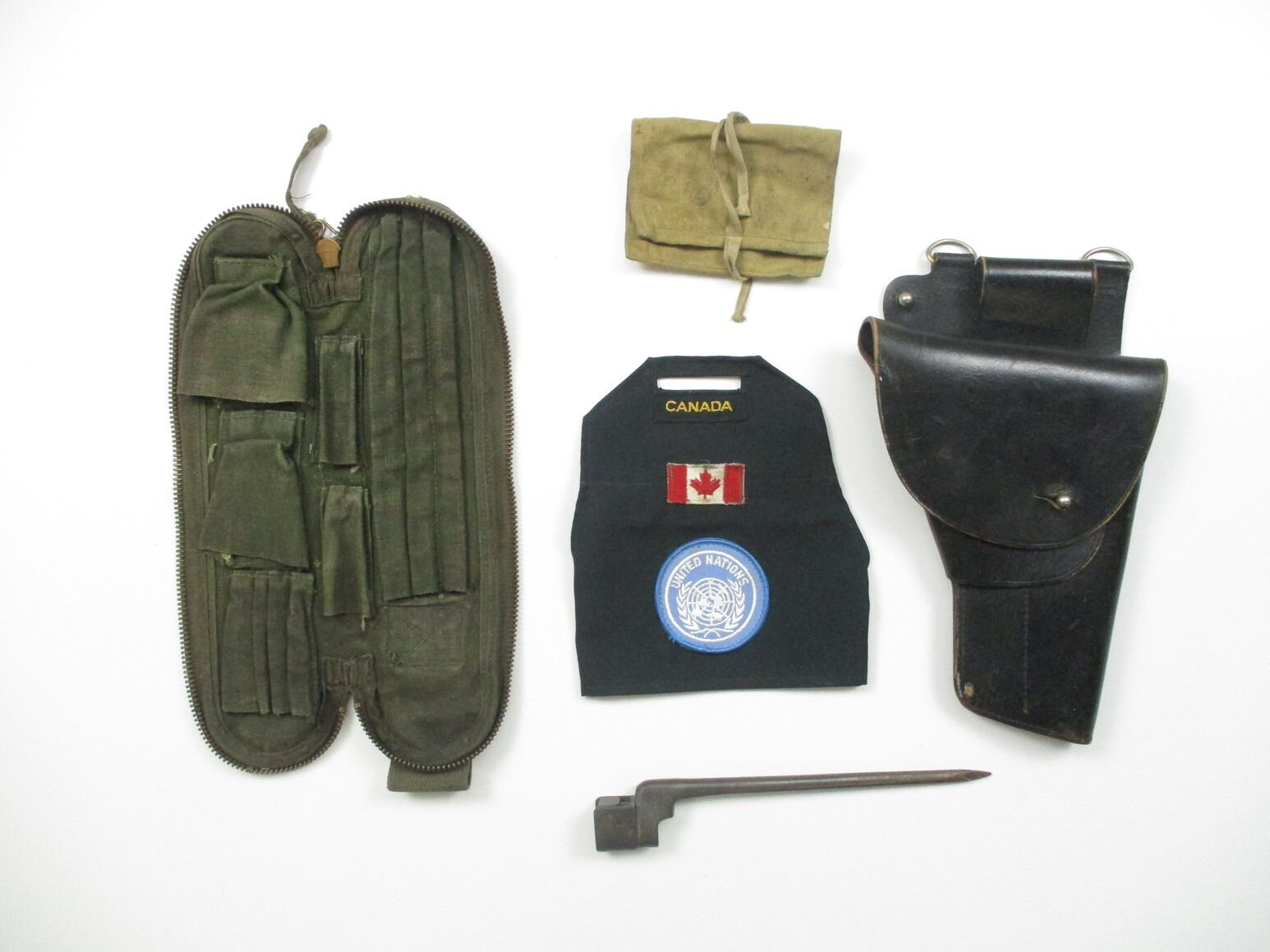 WWII / POST-WAR CANADIAN MILITARY ACCESSORIES LOT, LOT INCLUDES; (1) NO.4 MK II SOCKET BAYONET, FITS LEE ENFIELD NO.4 MKII RIFLES, SOCKET MARKED: "NO4 MKII" OVER "LB" & CROWN, NO SCABBARD, BLADE APPROX. 8" & OAL APPROX. 9.75", (1) P37 POUCH, MARKED: "S.S. HOLDEN LTD., OTTAWA, CANADA 1942" & C-BROAD ARROW, (1) COLD WAR C1 CLEANING KIT POUCH (EMPTY), NO VISIBLE MARKINGS, (1) COLD WAR MILITARY POLICE NO.2, MK I* HOLSTER, FITS 9X19MM PISTOL HOLSTER, WITH BELT LOOP & (1) U.N. PEACEKEEPING OPERATIONS ARM BAND. SEE PHOTOS.