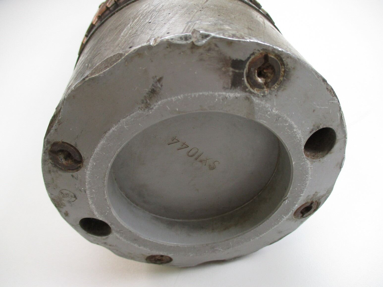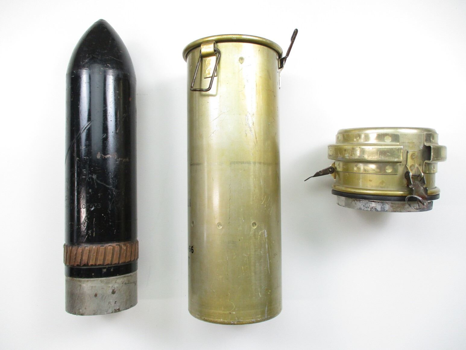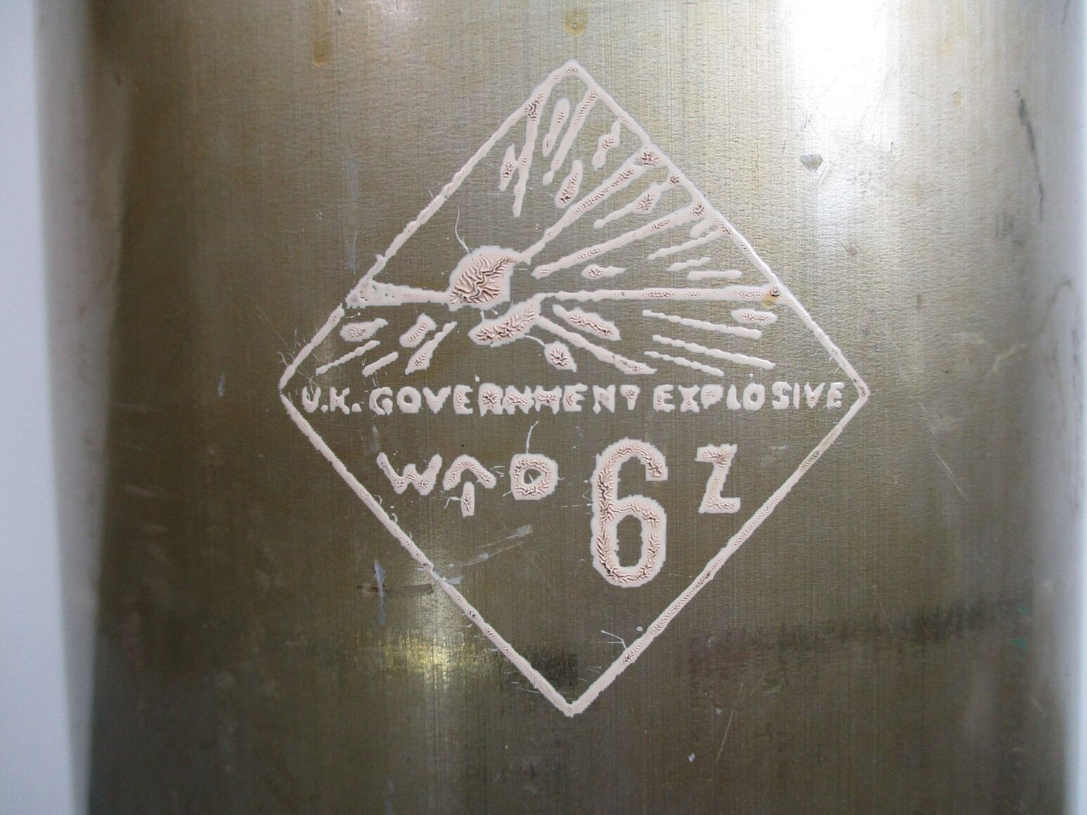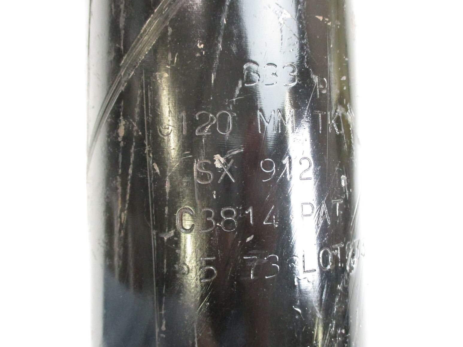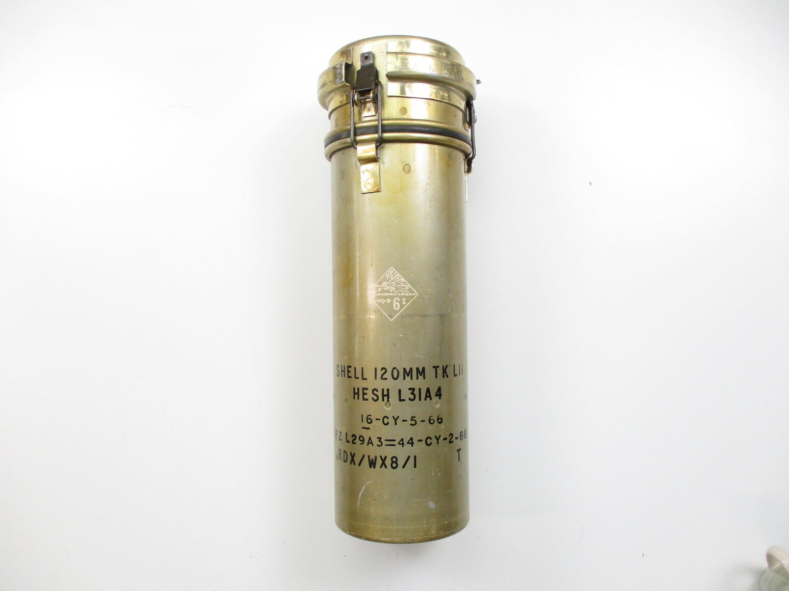 BRITISH 120MM TK LII SHELL INERT AND CANNISTER LOT, LOT INCLUDES; (1) STEEL SHELL WITH INTACT COPPER DRIVING BAND, SHELL MARKED: "SX1044", APPROX. 4 5/8" DIA. & OAL APPROX. 20" & (1) ALUMINIUM CANNISTER, MARKED: "U.K. GOVERNMENT EXPLOSIVE", "W" BROAD ARROW "D", "6 Z" & VARIOUS OTHER MARKINGS, APPROX. 7" DIA. & OAL APPROX. 21.5". SEE PHOTOS. *SHELL IS HEAVY & WILL REQUIRE EXTRA FEES FOR SHIPPING*, THESE CAN ONLY BE SHIPPED BY CORPORATE UPS COVERED AREAS. PLEASE GO TO LOT 0 IN THE AMMUNITION SESSION, TO SEE IF YOUR POSTAL CODE IS A VALID AREA. THESE CAN NOT BE SHIPPED TO THE USA, OR INTERNATIONALLY. NO REFUNDS WILL BE ISSUED, OR BIDS RETRACTED.