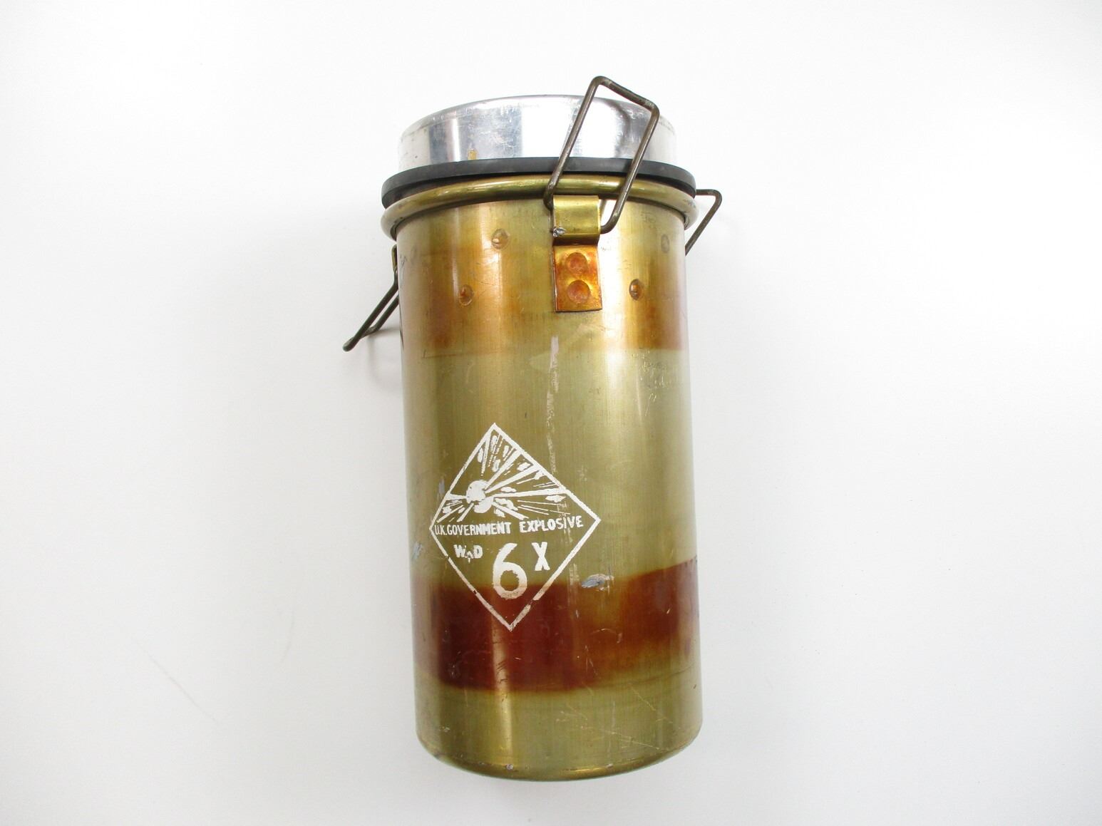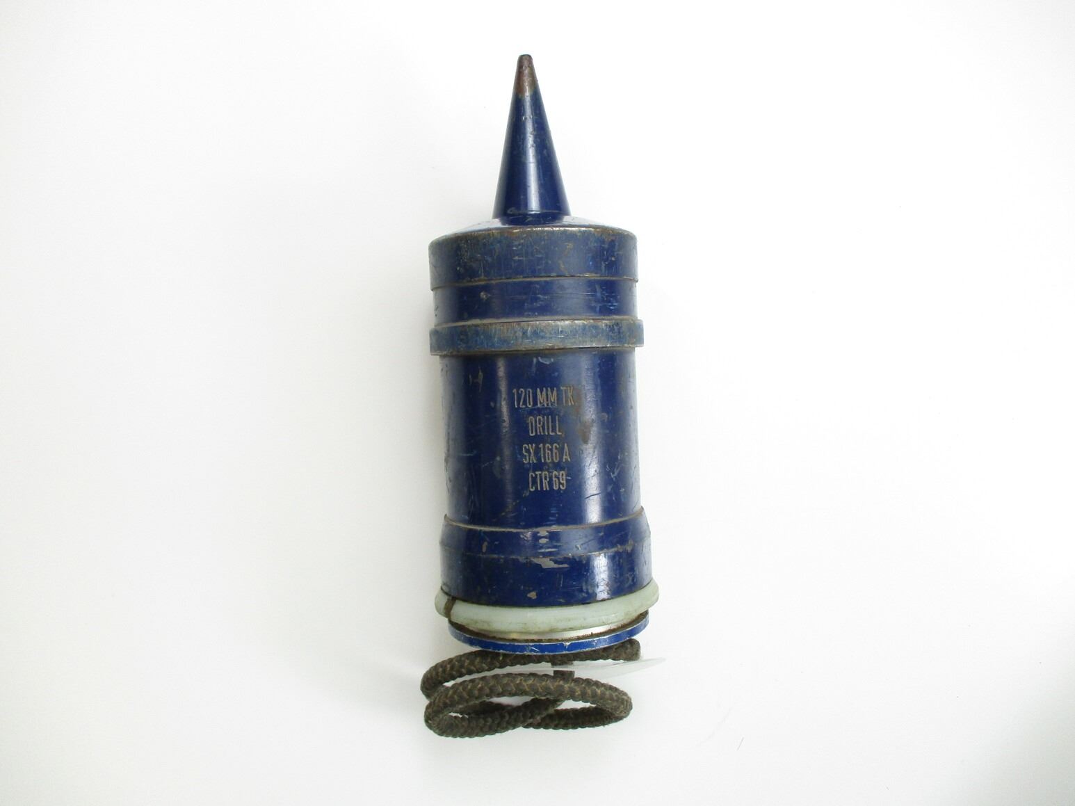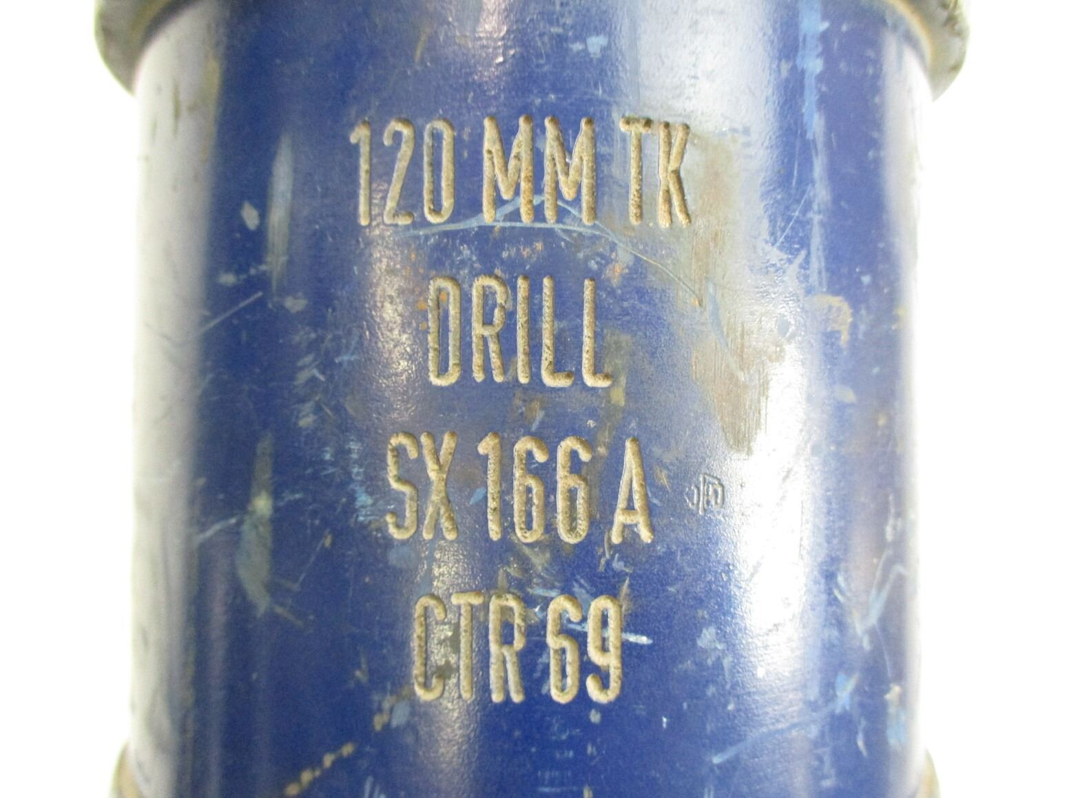 BRITISH 120MM TK LII DRILL SHELL INERT AND CANNISTER LOT, LOT INCLUDES; (1) BLUE PAINTED STEEL SHELL WITH ROPE ATTACHED, MARKED: "120MM TK LII, DRILL L1A1, C.T.R. 69", APPROX. 4.75" DIA. & OAL APPROX. 13.25" & (1) ALUMINIUM CANNISTER, MARKED: "U.K. GOVERNMENT EXPLOSIVE", "W" BROAD ARROW "D", "6 X" & VARIOUS OTHER MARKINGS, APPROX. 7" DIA. & OAL APPROX. 21.5". SEE PHOTOS. *SHELL IS HEAVY & WILL REQUIRE EXTRA FEES FOR SHIPPING*, THESE CAN ONLY BE SHIPPED BY CORPORATE UPS COVERED AREAS. PLEASE GO TO LOT 0 IN THE AMMUNITION SESSION, TO SEE IF YOUR POSTAL CODE IS A VALID AREA. THESE CAN NOT BE SHIPPED TO THE USA, OR INTERNATIONALLY. NO REFUNDS WILL BE ISSUED, OR BIDS RETRACTED.