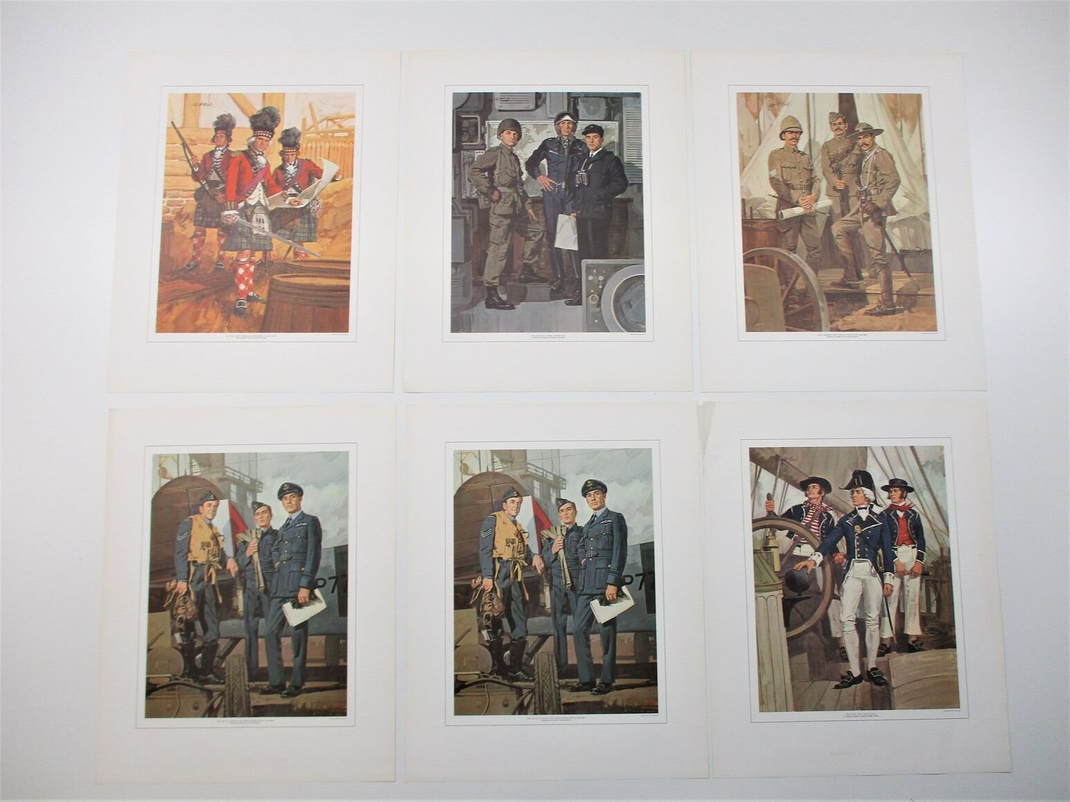ASSORTED MILITARIA PRINT LOT, (6) PRINTS BY TOM MCNEELY, PRINTED BY RALPH-CLARK-STONE LIMITED, APPROX. 16" W X 20" H, INCLUDING; "THE ROYAL NAVY (WAR OF 1812)", "THE ROYAL CANADIAN AIR FORCE (WORLD WAR II, 1939-1945), "THE CANADIAN ARMY (SOUTH AFRICAN WAR 1899-1900)", "THE 42ND (ROYAL HIGHLAND) REGIMENT OF FOOT (1782) & "THE CANADIAN ARMED FORCES (1967)". SEE PHOTOS.