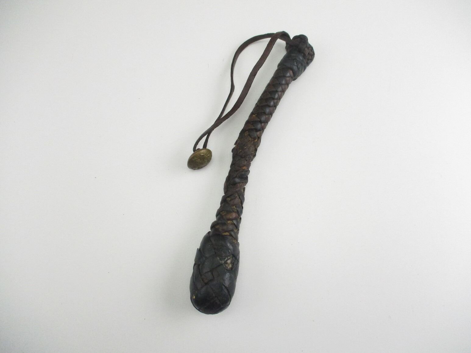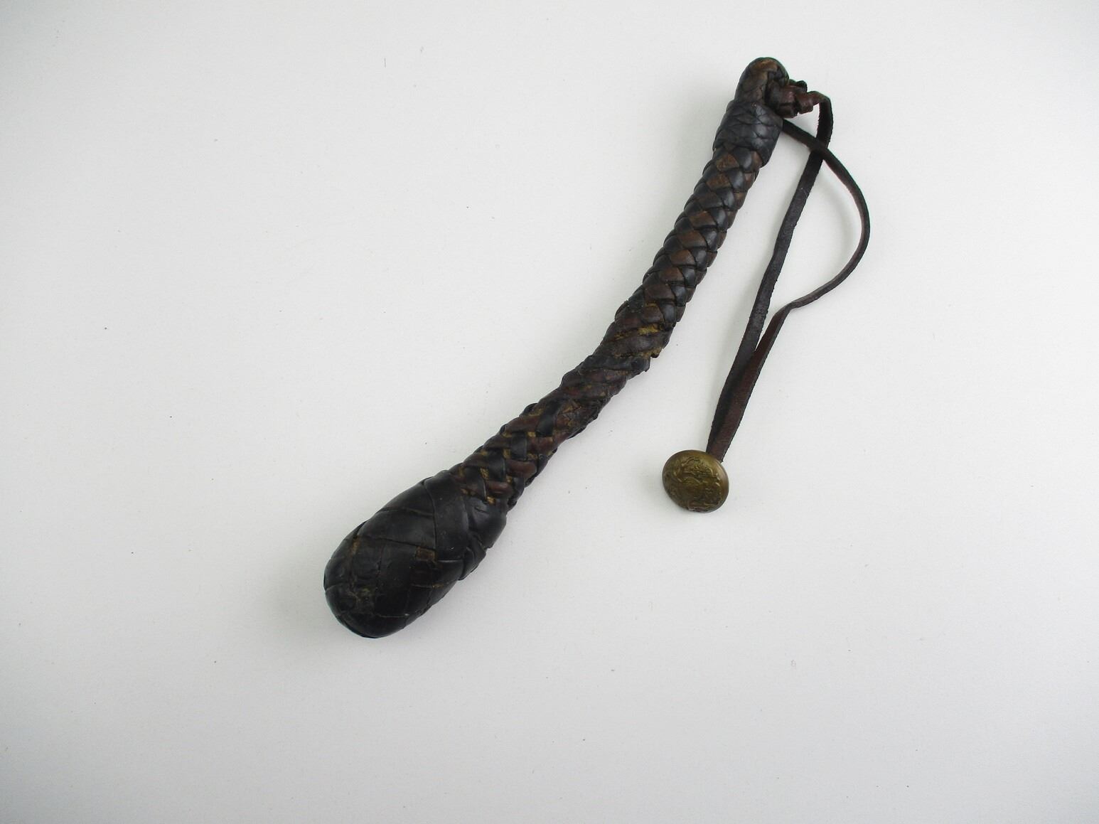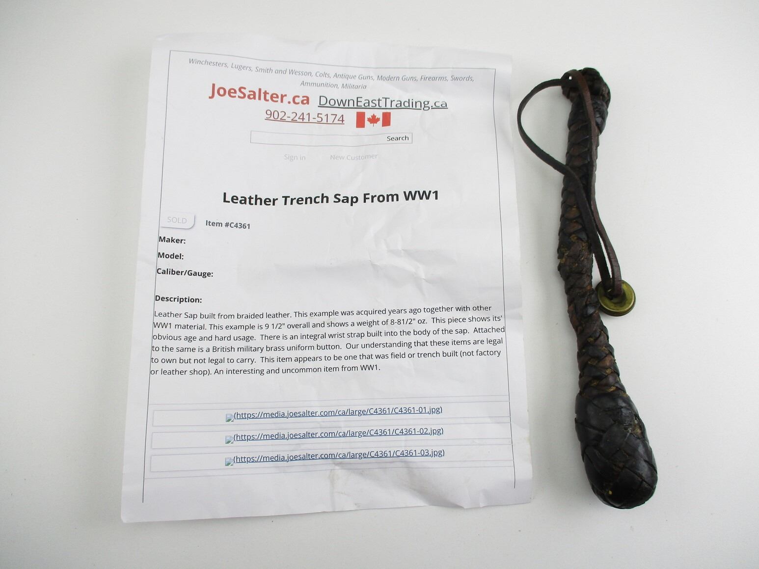 WWI TYPE TRENCH SAP, (1) LEATHER, BRAIDED, PREVIOUSLY SOLD BY DOWNEASTTRADING.CA WITH ORIGINAL LISTING INCLUDED, OAL APPROX. 9.75". SEE PHOTOS.