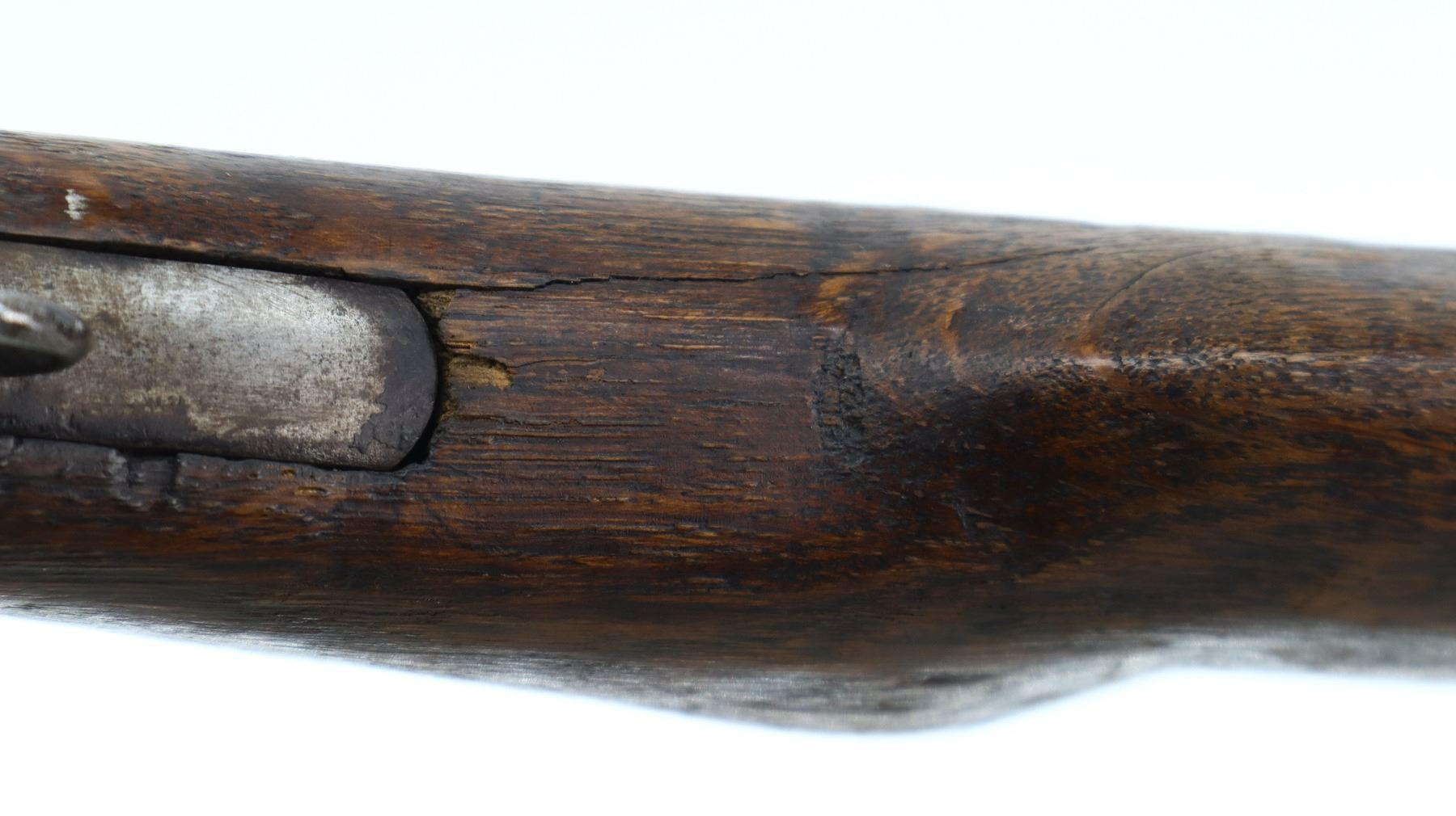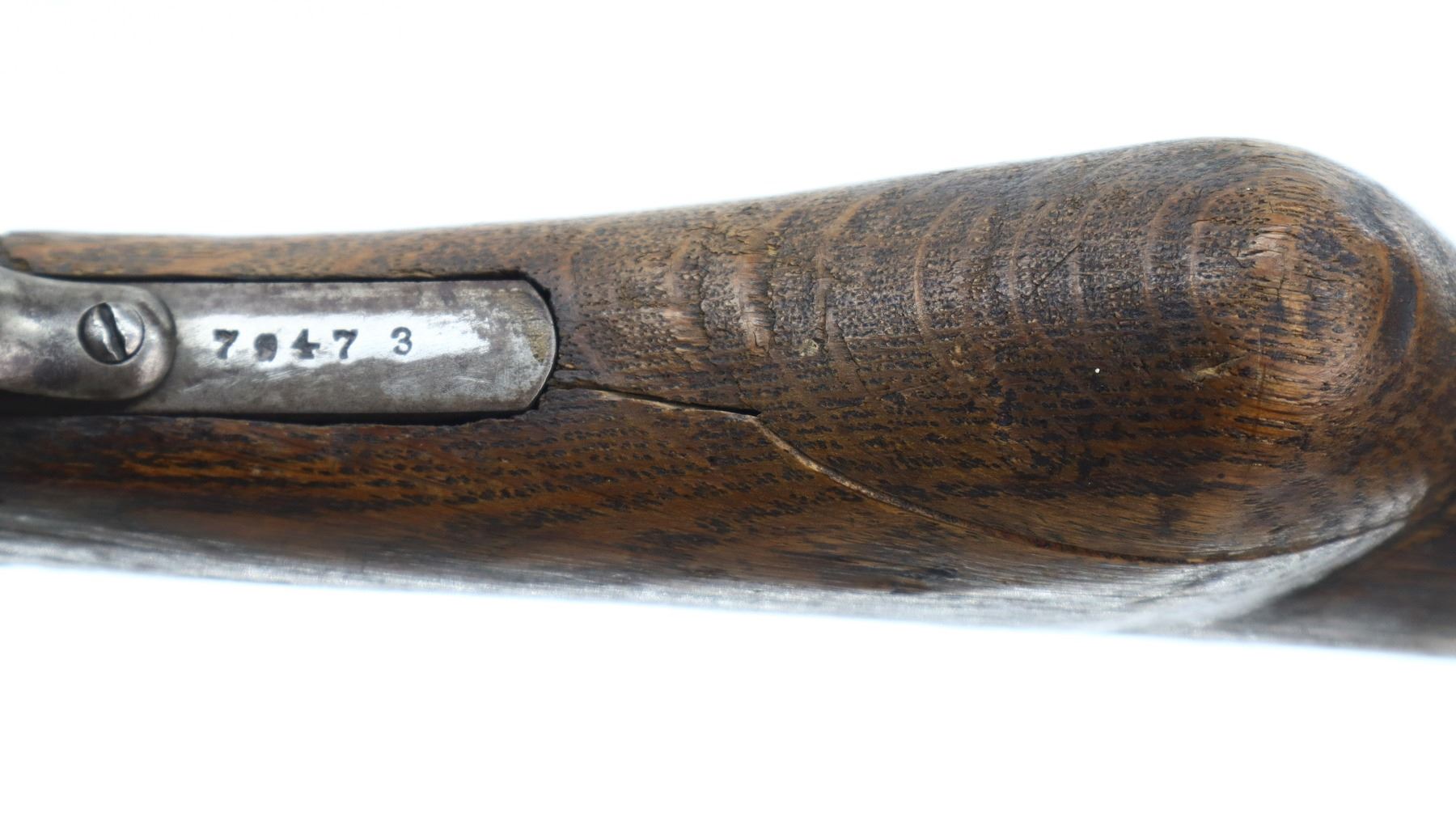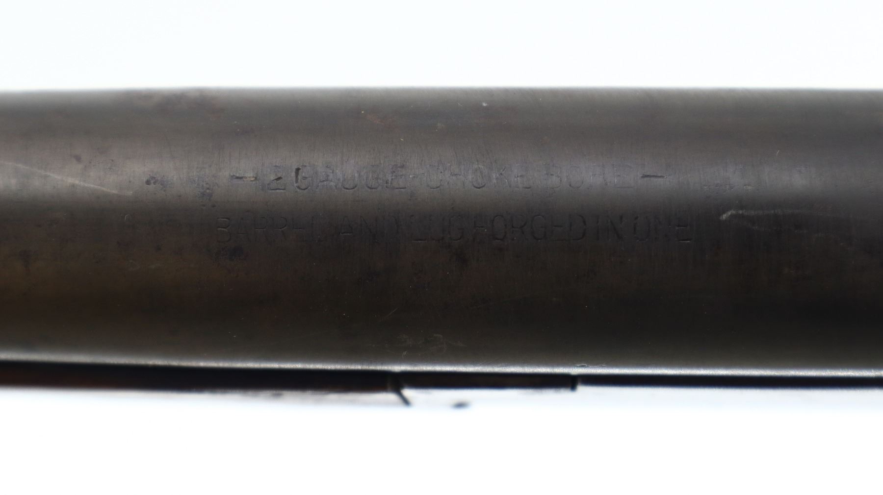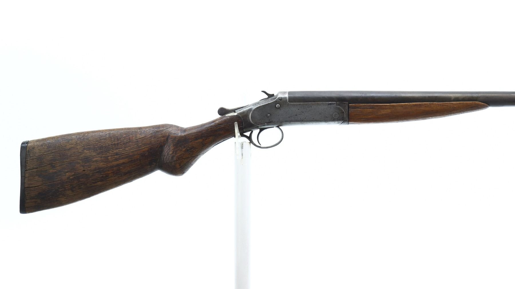 2/10, IVER JOHNSON, MODEL: SINGLE SHOT, CALIBER:12 G X 2 3/4", BORE IS FAIR, PITTED. FIXED FULL CHOKE. BRASS BEAD, ROUND BARREL (LOOSE ON FACE), CHECKERED SPUR HAMMER, EXTRACTOR. TWO PIECE SMOOTH WOOD STOCKS, FOREARM CRACKED, REPLACED BUTT STOCK, PISTOL GRIP, CRACKED AND CHIPPED BEHIND RECEIVER, GROOVED BLACK POLYMER BUTT PLATE, CHIPPED AT HEEL. METAL FINISH SILVER GREY WITH PITTING, LIGHT RUST, HANDLING MARKS AND WEAR. STOCKS SHOW MARKS, SMALL CHIPS, SCRATCHES AND WEAR. , ACTION: HINGED SINGLE SHOT SHOTGUN, BARREL LENGTH: 30", SERIAL # 79473, CONDITION: 2/10, CLASS: CANADIAN NON RESTRICTED