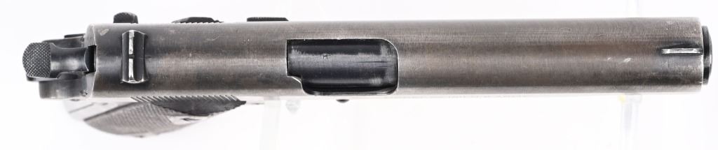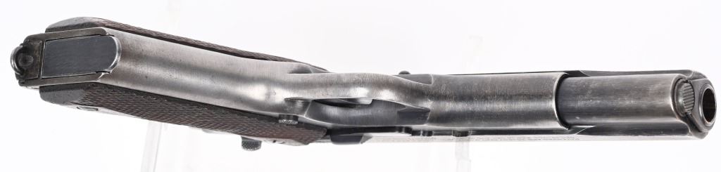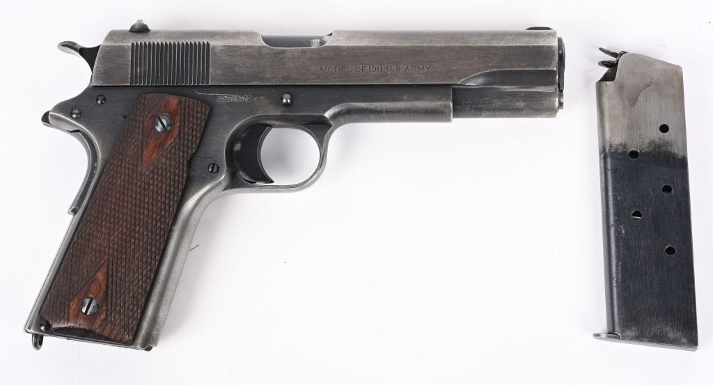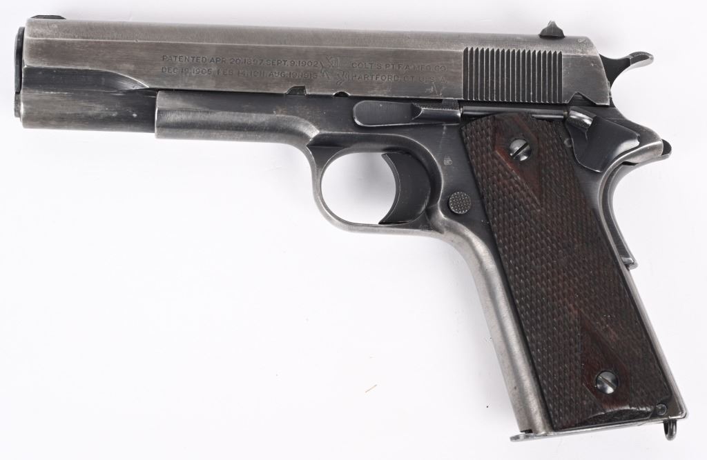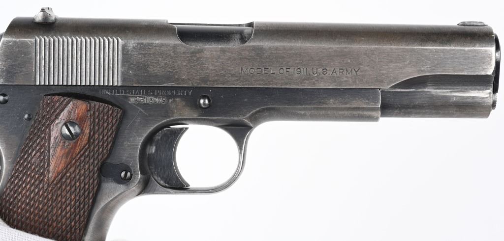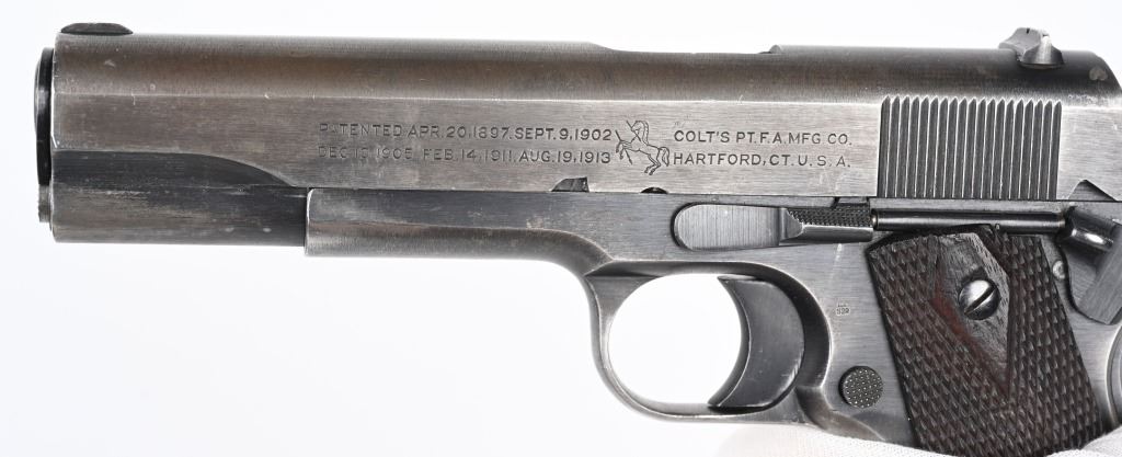 SERIAL NUMBER 613079 BARREL 5" CALIBER .45 ACP MANUFACTURED 1919. Produced by Colt immediately post WW2 with brushed blue finish, 2 line slide address with Rampant Colt in center. Small Springfield acceptance inspection on left side above magazine release. Barrel is blue finish with intertwined "HP" on top of hood of chamber. Checkered diamond pattern walnut grips. Long wide checkered hammer with short spur grips Long smooth trigger. safety and smooth flat mainspring housing. Comes with unmarked 2 tone magazine. CONDITION. Good with the slide having turned mostly grey with blue in protected areas. The frame retains 25% blue with thinning and losses at grip straps. The bore is very good and bright. The action operates properly. The grips are very good with slight wear but no material losses. C&R