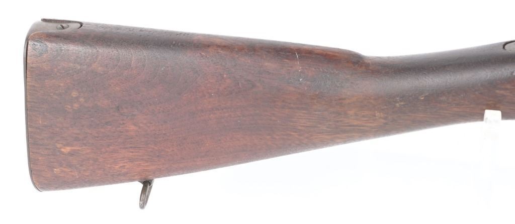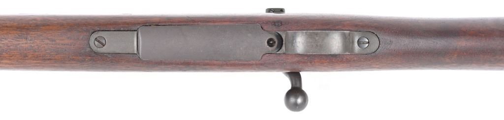 SERIAL NUMBER: 335729. BARREL: 24". CALIBER: .30-06. MANUFACTURED: 1907. Early production receiver, with a later production Springfield barrel, dated "3-28" under a flaming bomb proof. Bolt is "R" marked for Remington. Standard sights. WW2 era parkerized finish. Bolt has been turned down to allow clearance for the scope. Oiled wood stock with a straight grip and no finger grooves. Checkered metal butt plate with trapdoor for cleaning kit. Includes attached Bausch & Lomb Balfor scope, sitting in a Bausch & Lomb single piece mount. Original front sight protector is in place as well. CONDITION: Metal is very good overall, with general wear and some discoloration. Wood has handling marks, scrapes and scratches. Bore is clean overall with strong rifling retained. Mechanically fine. Scope is fogged and has exterior wear. C&R eligible.