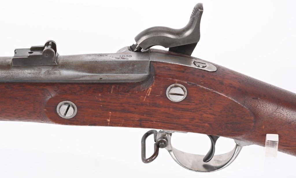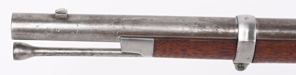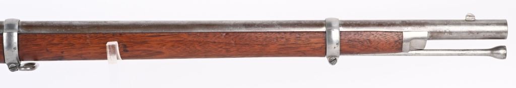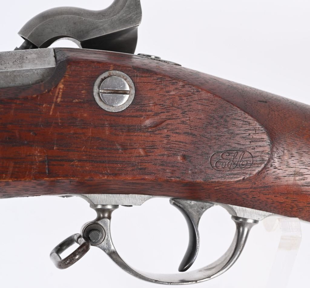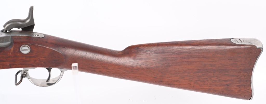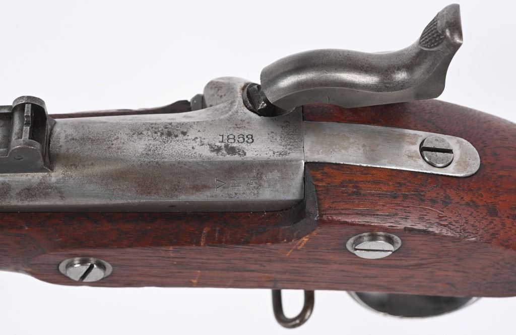 BARREL 40". CALIBER 58. The Type 1 1863 rifle does not have barrel band springs. Lock and barrel are dated 1863. Standard features include 3-bands, ramrod, full length walnut stock with a crisp as new ESA inspector cartouche on left side, two leaf rear sight. Finished in the white. Condition. Bore is bright as new. Barrel has some toning. Stock is near mint with few dings and impressions. Does not appear to have been issued and never saw any service. Would be hard to find a nicer example of a Type 1 rifle. ANTIQUE