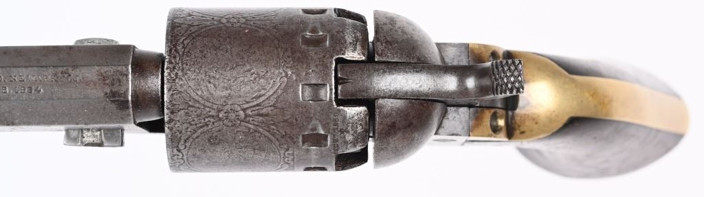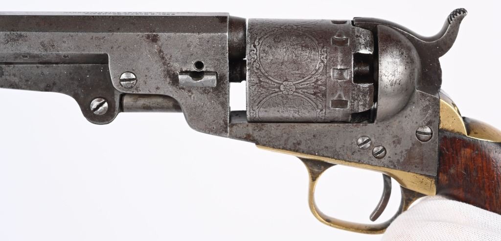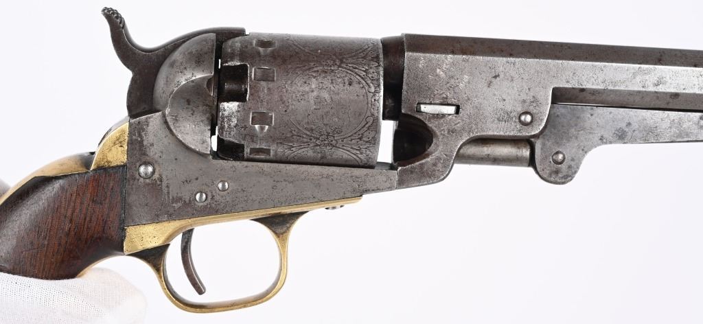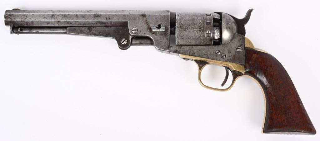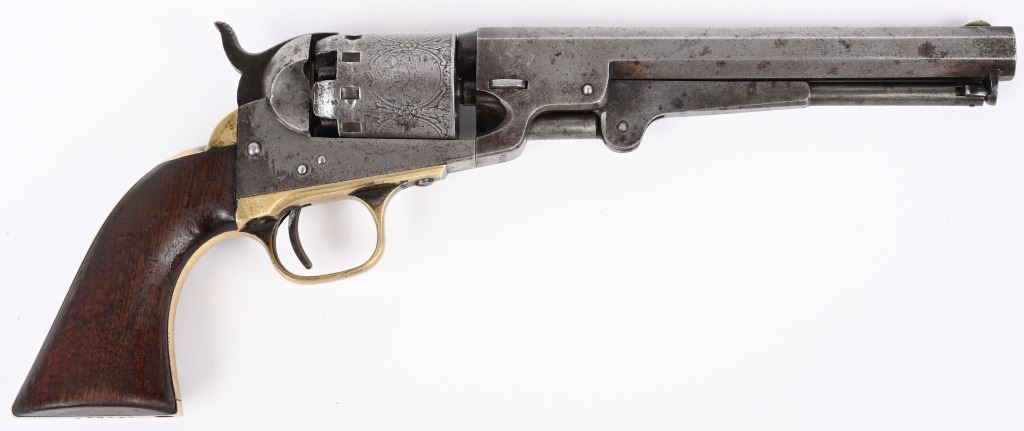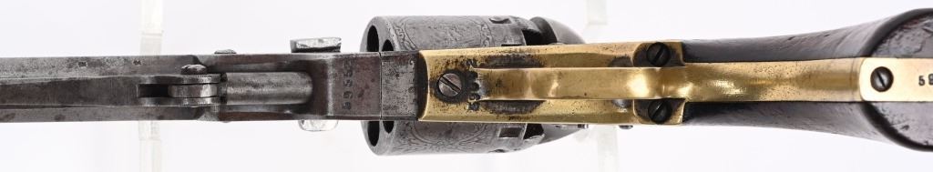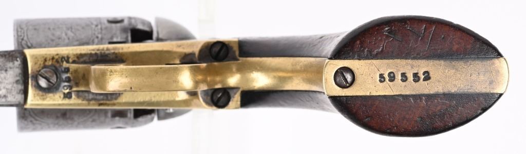 SERIAL 59552. BARREL 6.5". CALIBER .36 / FIVE SHOT, MADE 1860'S. All matching numbers on metal except wedge, which is a "home made" replacement. Features full octagon barrel with legend, brass straps, walnut one piece grips, five shot, single action, etched cylinder. grips barrel address. Condition. All gray with crisp edges and levers. Missing wedge screw and screw. Grips are excellent. Bore is also sharp. Needs a new hand as it does not index. Antique