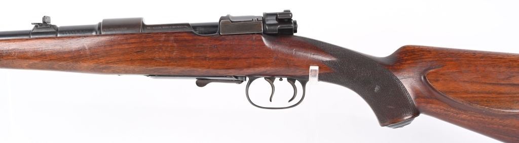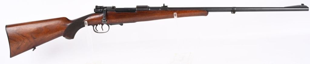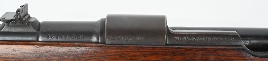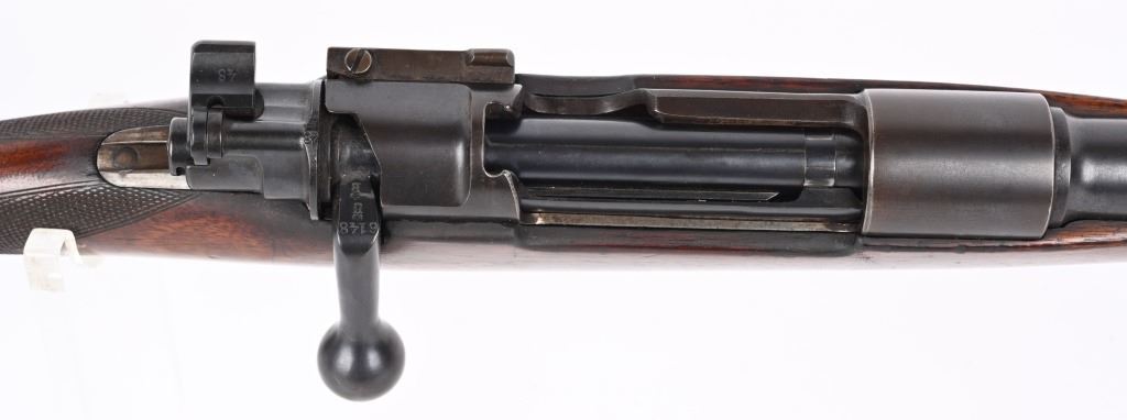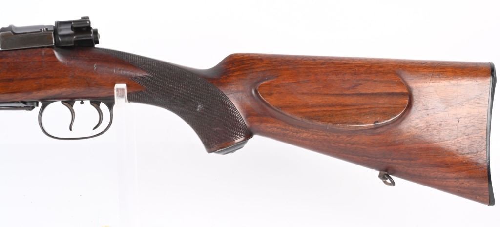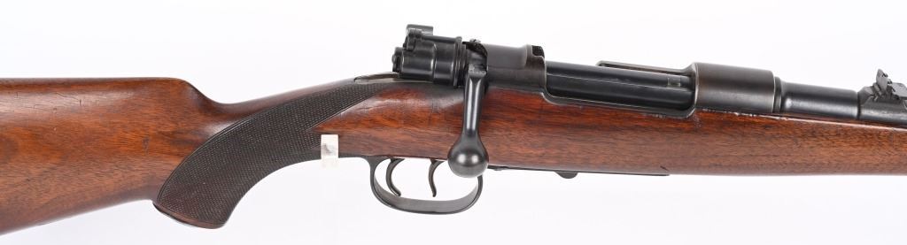 SERIAL NUMBER: 86148. BARREL: 24". CALIBER: 8MM MAUSER. MANUFACTURED: 1920's. Made by Mauser Oberndorf after WW1 for the sporting market. Matching serials on the barrel, receiver, bolt and bolt components. Ramped blade front sight. 3-position express style rear. Original blued finish. Oiled wood stock with checkering on the wrist. Factory checkered plastic butt plate. Metal capped pistol grip. Factory set triggers and sling swivels. CONDITION: Metal is good overall, with most areas forming a brown patina. Wood has minor scrapes, scratches and dents. Bore is clean overall with strong rifling. Mechanically fine. C&R