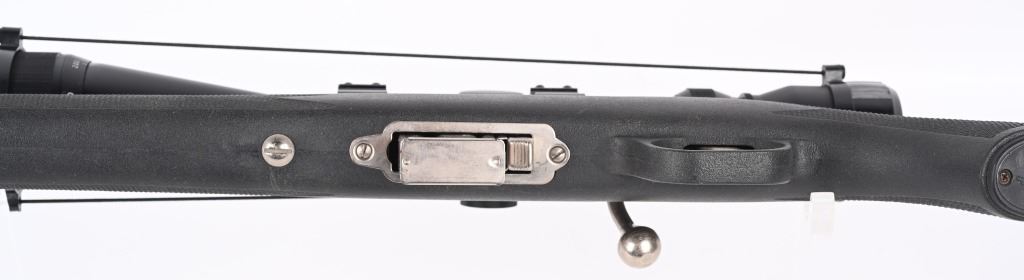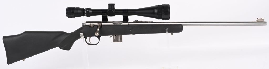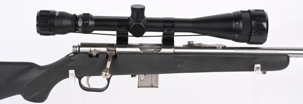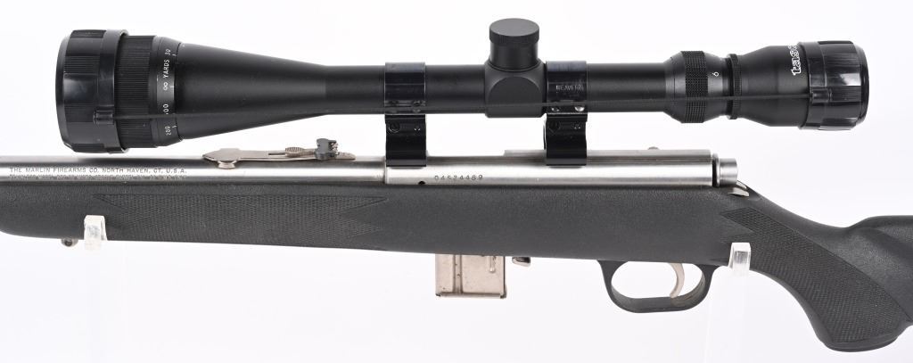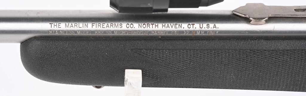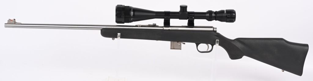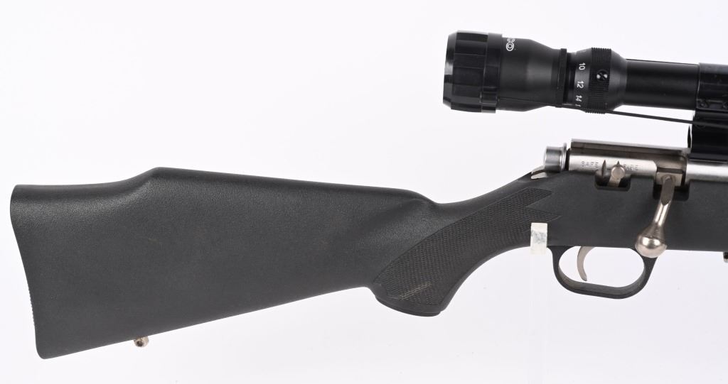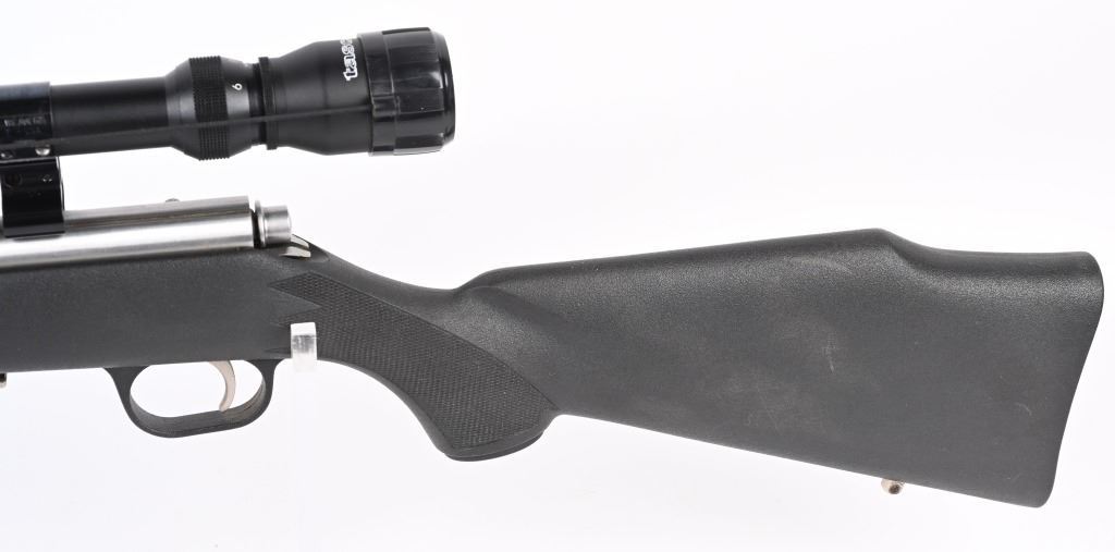 SERIAL NUMBER: 04524469. BARREL: 22". CALIBER: .22 MAG. MANUFACTURED: 1996. Standard blade front sight and folding buckhorn u-notch rear. Grooved receiver. Factory stainless steel finish and synthetic stock. Includes factory 10 round magazine and Tasco SPL 6-18X42 scope. CONDITION: Metal is very good overall, with general wear and light scratches. Stock has minor handling marks. Bore is clean overall with strong rifling. Mechanically fine. Magazine is excellent. Scope has exterior wear. Optic is clear. MODERN