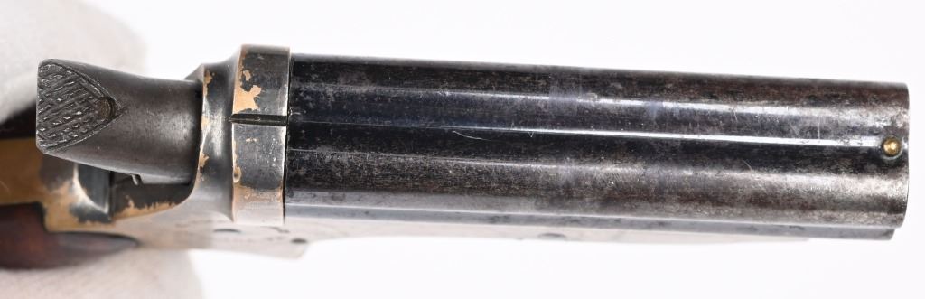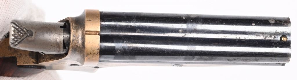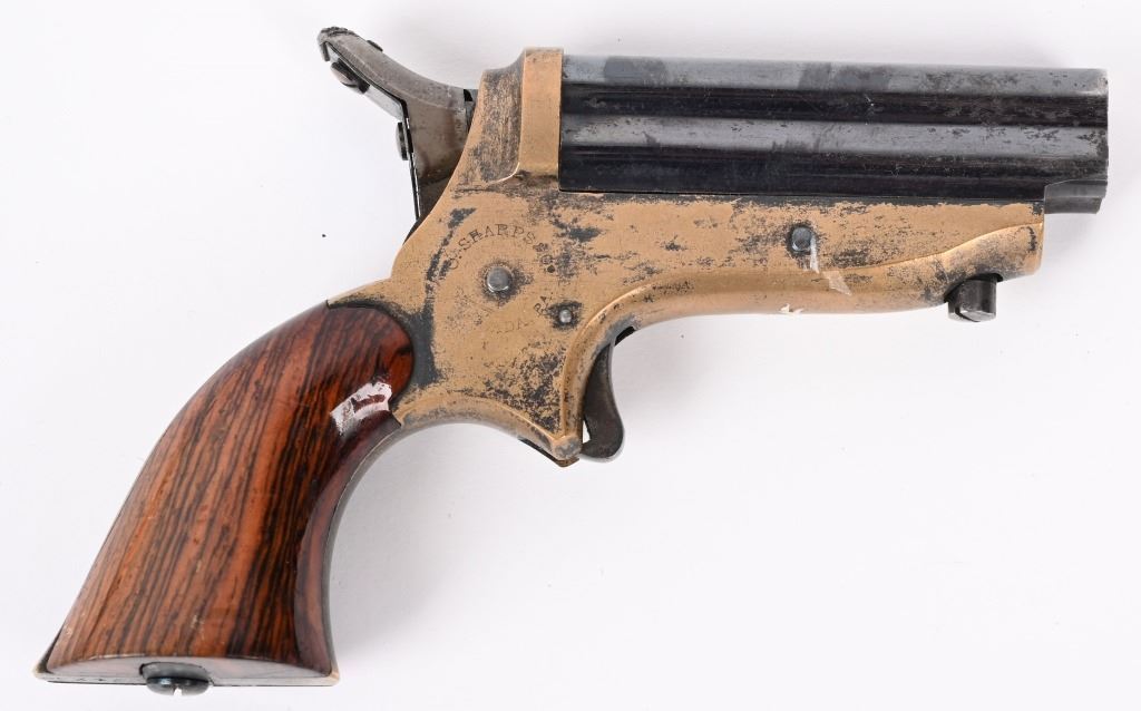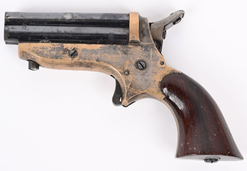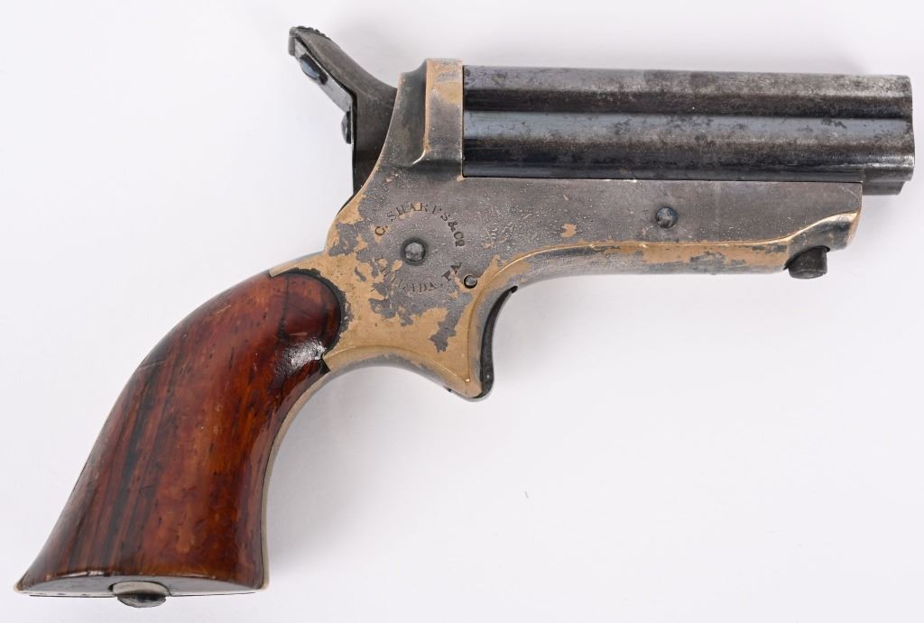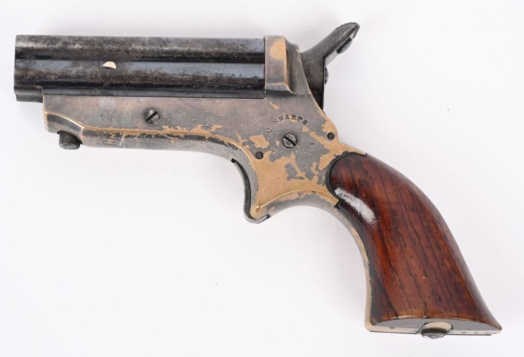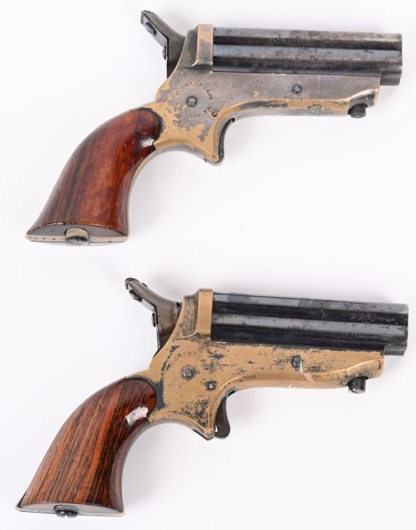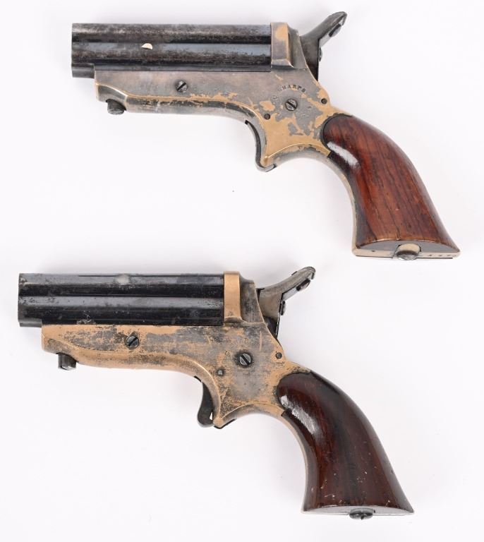 SERIAL NUMBER 24750 / 5370 BARREL 2 1/2" CALIBER 22 RIM FIRE MANUFACTURED 1859-1874. Blue finished 4 shot barrel cluster with brass frame amd varnished walnut grips. Standard Sharps markings on frame and matching numbers. Barrel release on bottom of frame. CONDITION, Good with good bores with visible rifling. Good grips with most finish remaining. Both pistols have 30% silver plate remaining on frames and 70% blue on barrels. Both operate properly. ANTIQUE