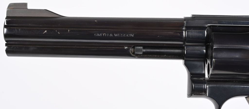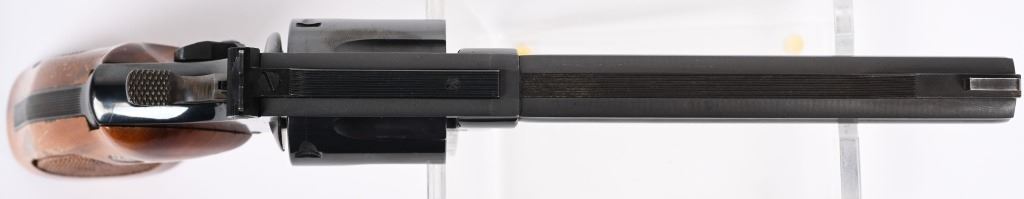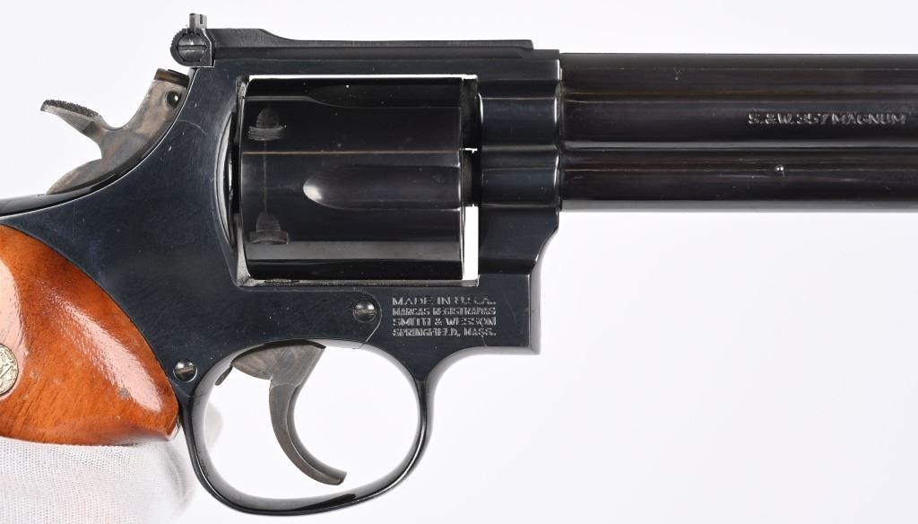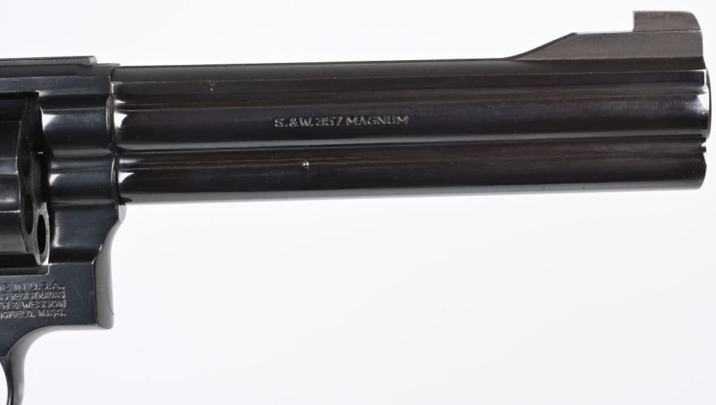 SERIAL NUMBER: ABT3308. BARREL: 6". CALIBER: .357 MAGNUM. MANUFACTURED: 1980'S. Standard markings and features. Six shot fluted cylinder. Blade front sight and adjustable u-notch rear. Original blued finish. Case colored smooth face trigger and spurred hammer. Square butt frame. Checkered wood grips, with an oil finish and gold medallions. CONDITION: Metal is very good overall, with light scratches. Grips are excellent. Bore is shiny with crisp rifling. Sharp mechanics. MODERN