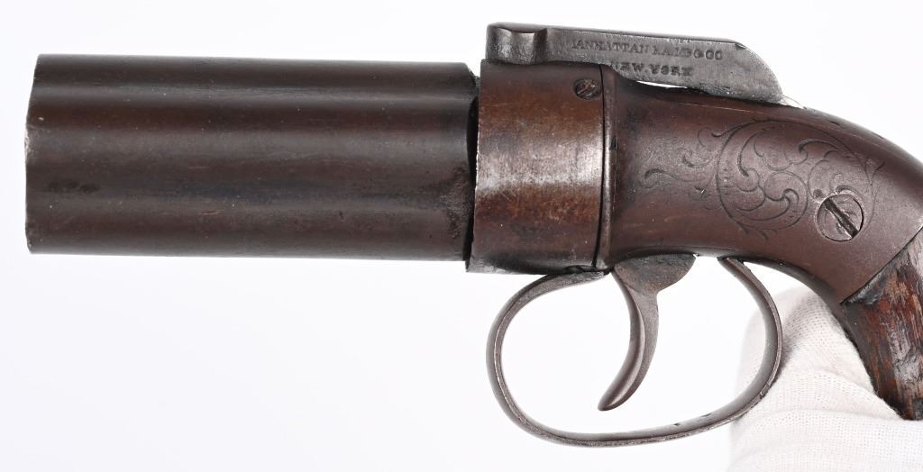 A. ALLEN THURBER NORWICH CT. 6-shot, 3 1/4" barrel, .32 caliber. Engraved frame, walnut stocks, double action. B. MANHATTEN ARMS CO. 2.5" BARREL. 28 caliber. 5-shot. engraved frame, smooth patina. Both guns need some tuning or springs to work properly. ANTIQUE