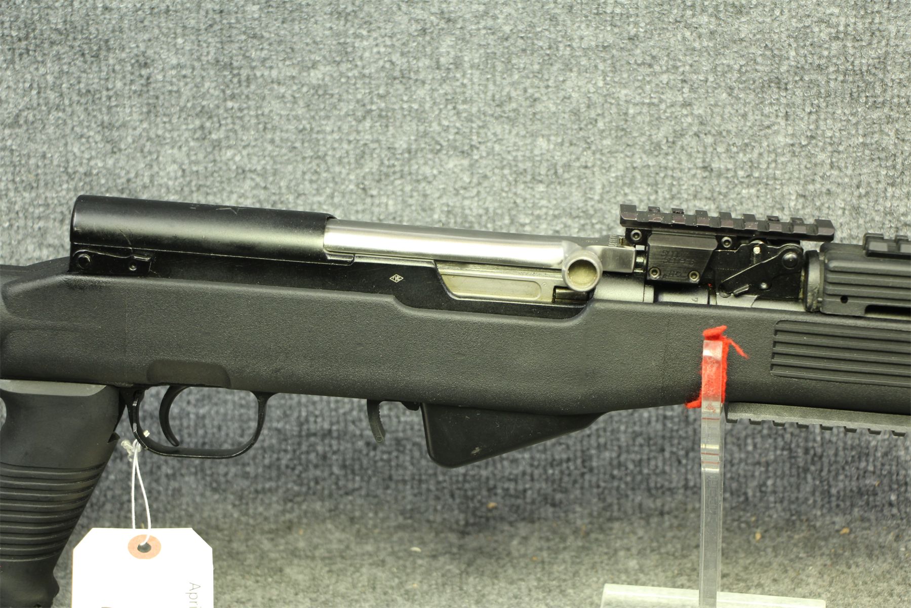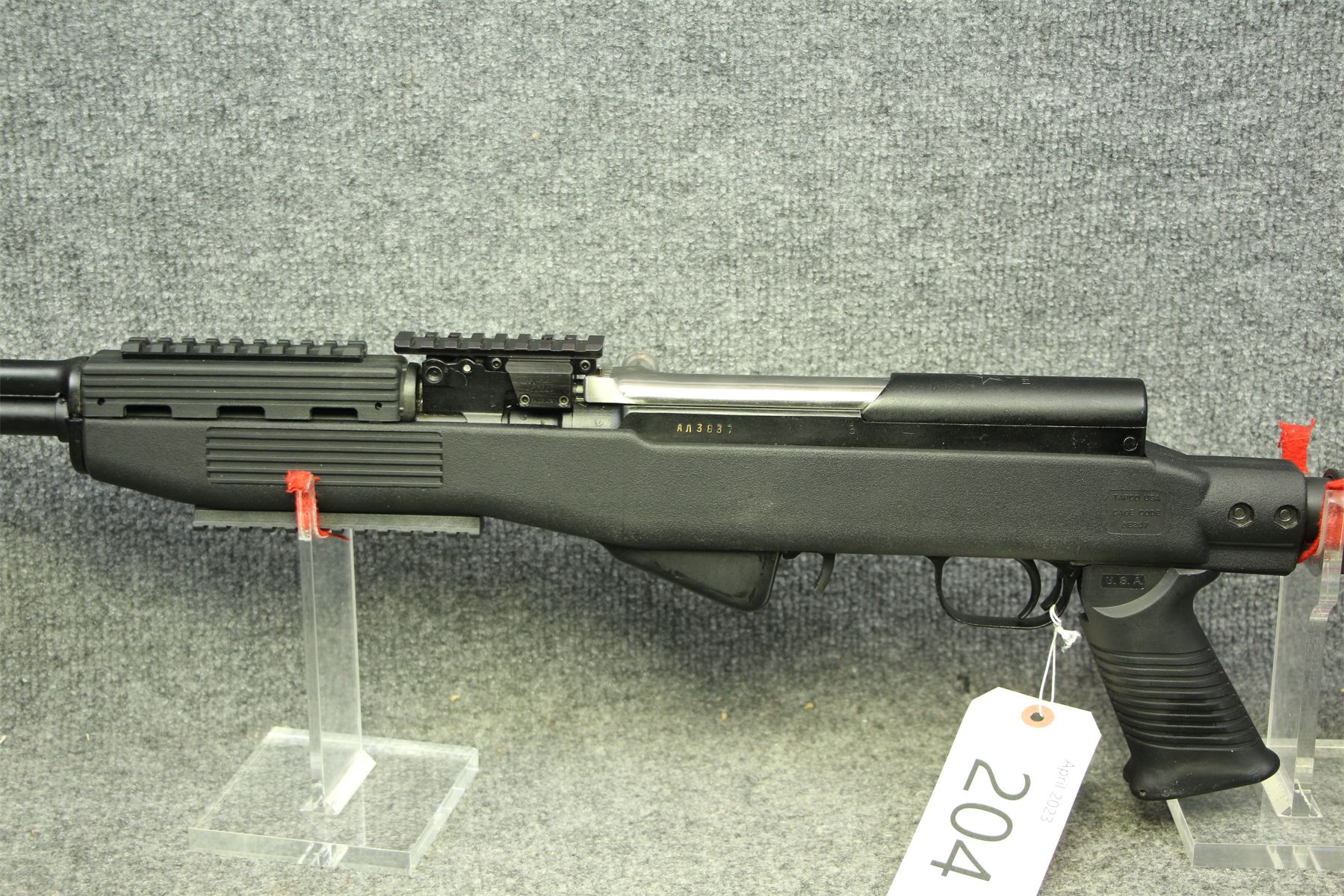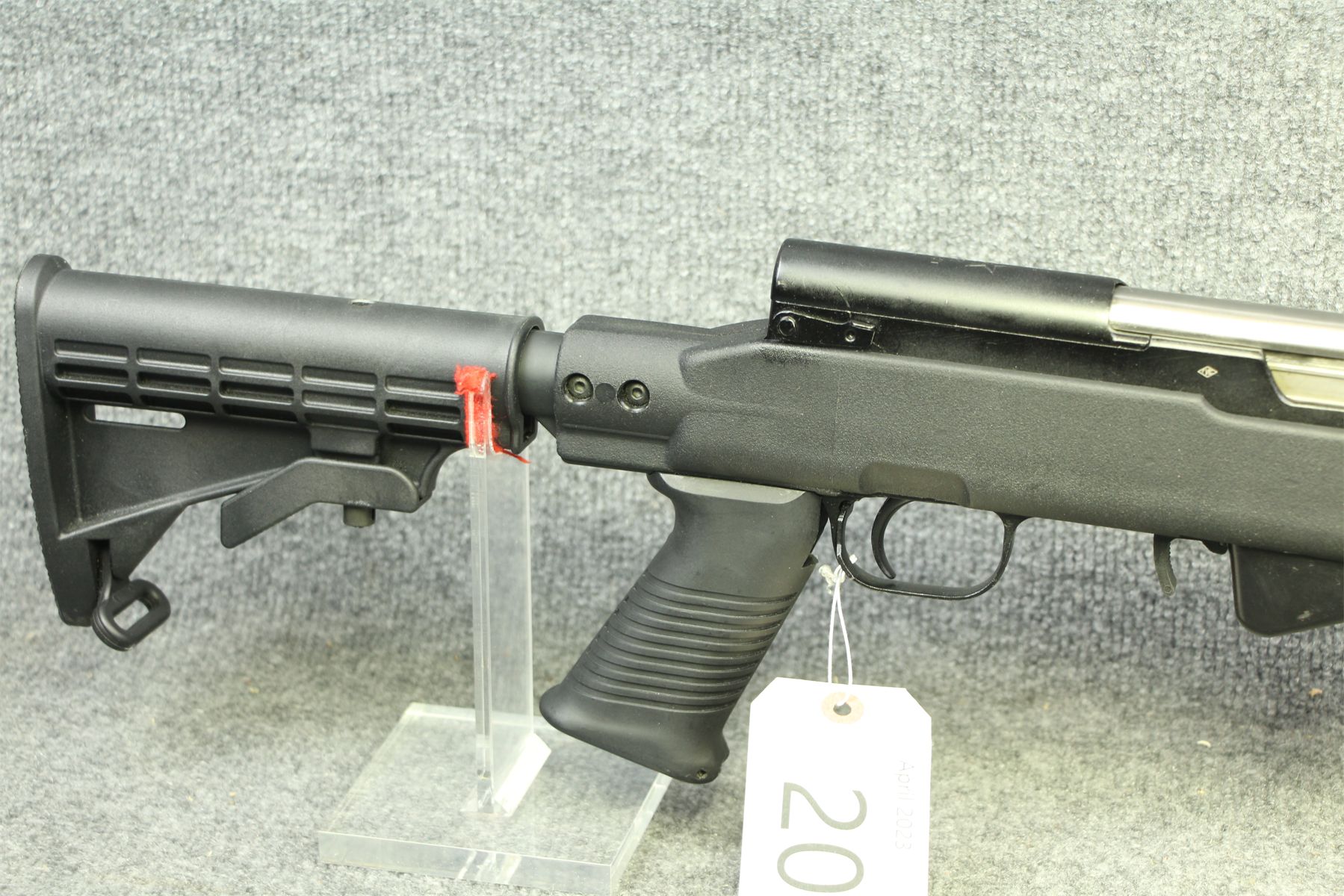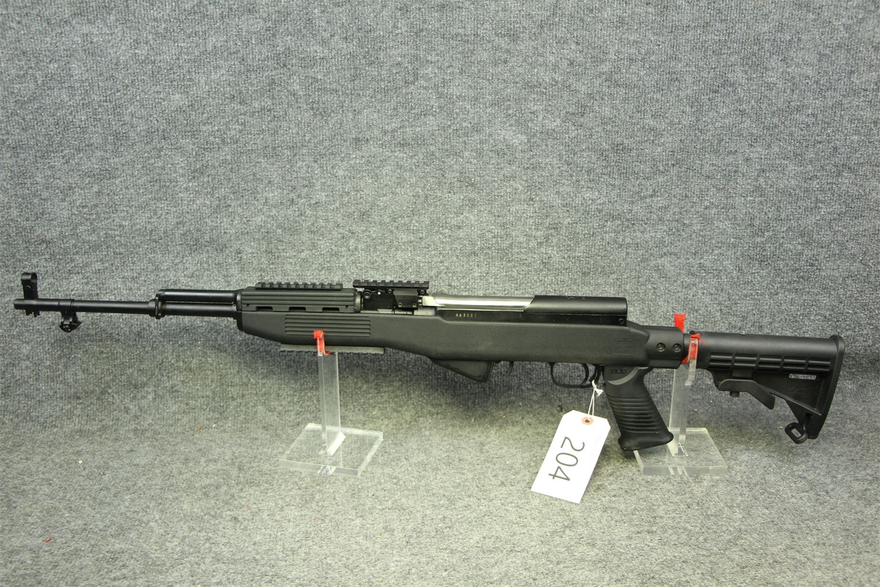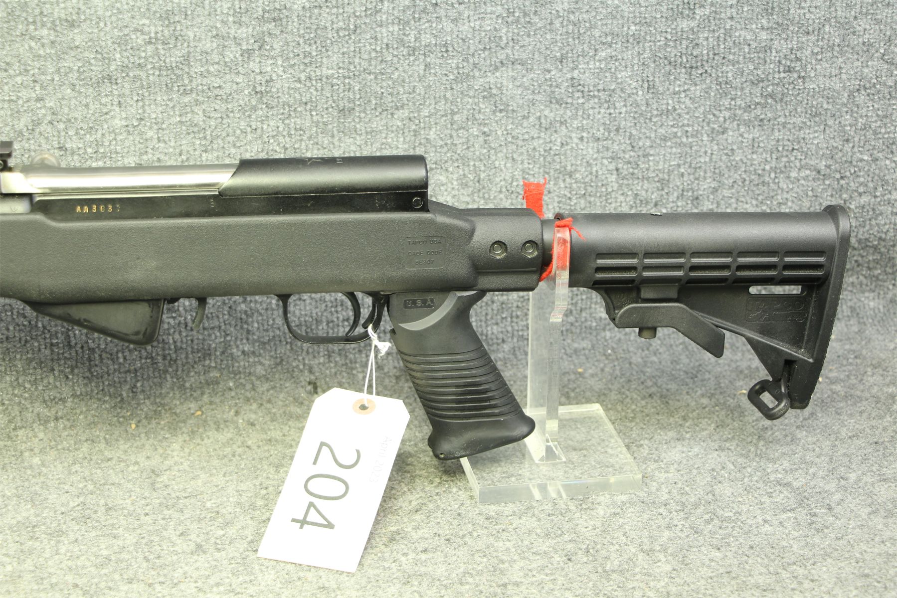 With a Tapco composite stock. 3 Picatinny bases. Extendable stock.
