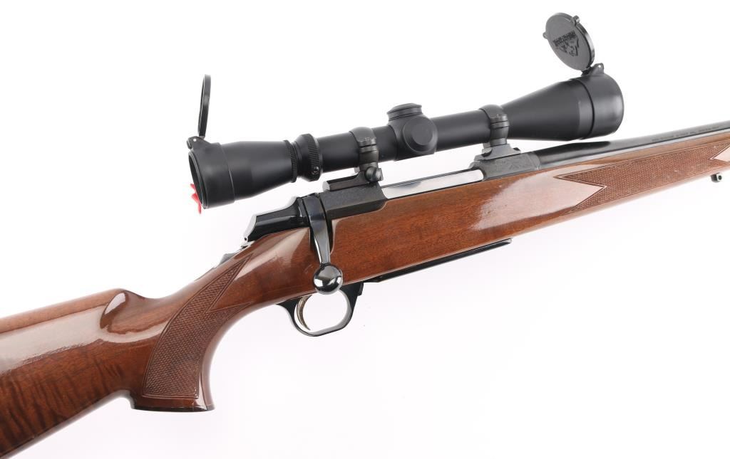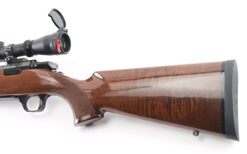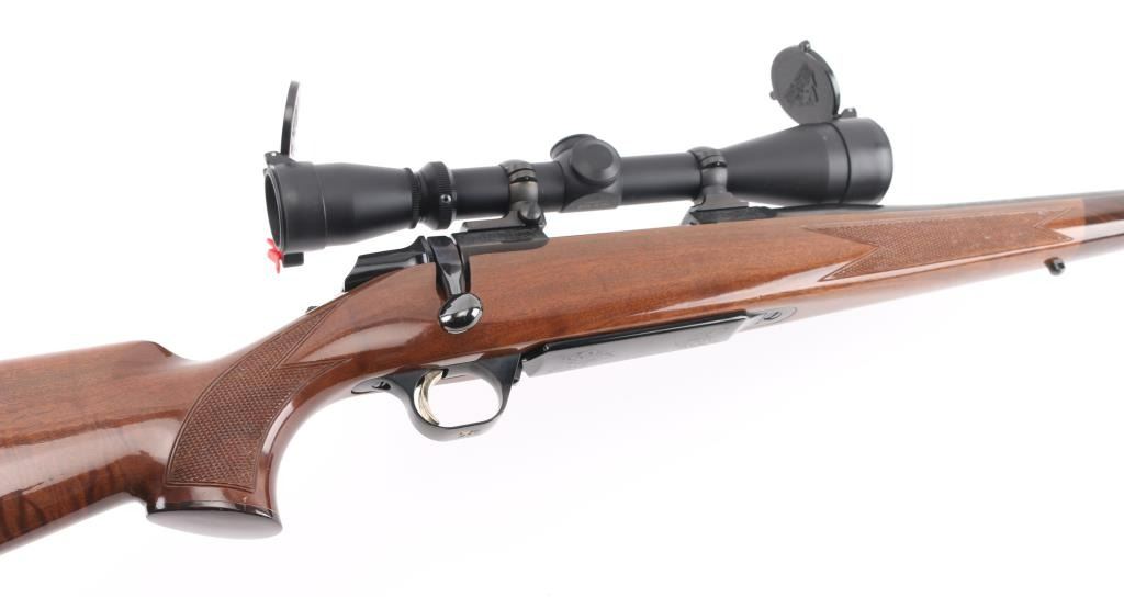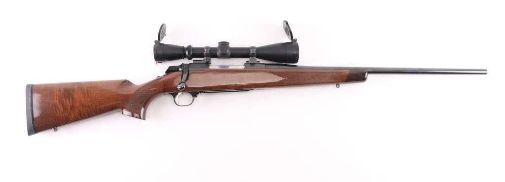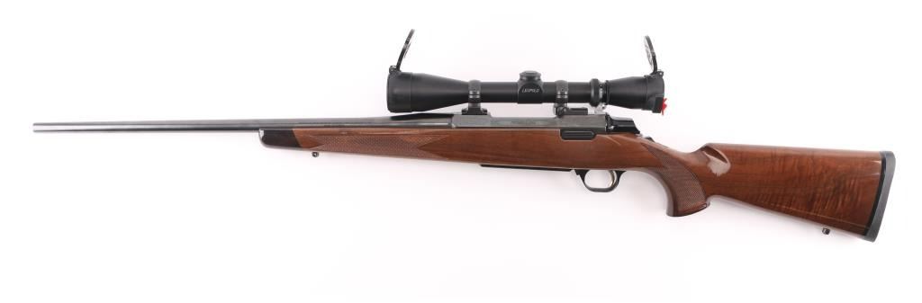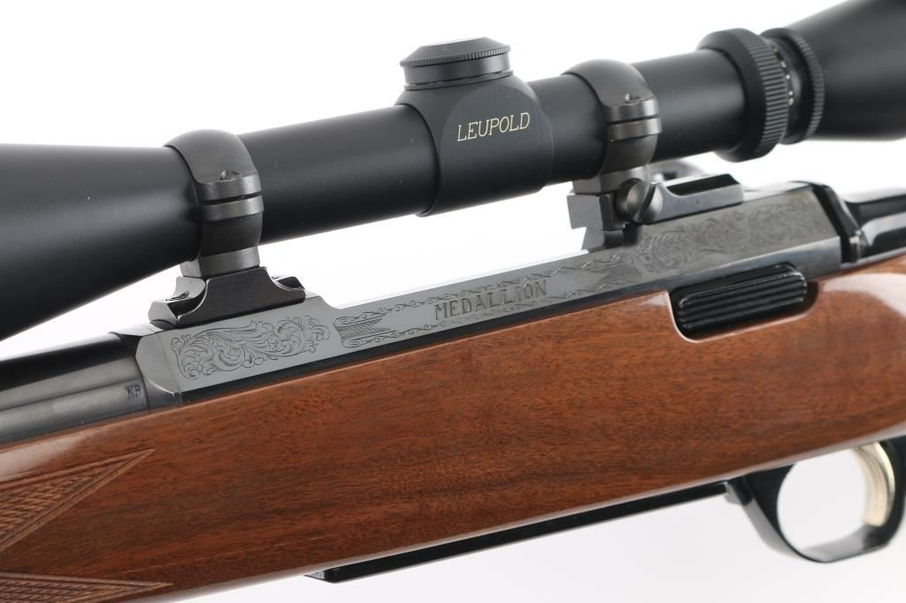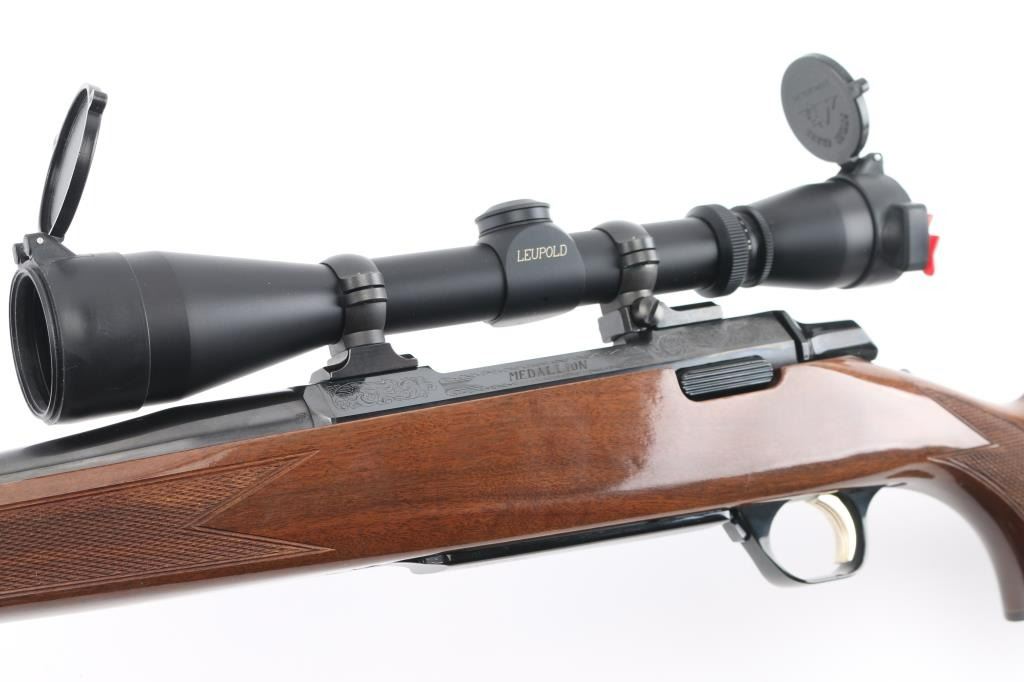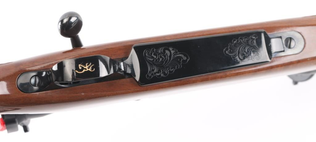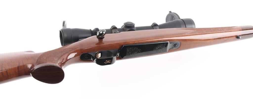 'Medallion' bolt action rifle made in Japan, imported by Browning Arms Company, Morgan UT. Features a 22" barrel, hinged floorplate opens to allow access to the detachable magazine, manual safety, 'cocked' indicator, two piece Leupold scope bases & rings, fancy figured walnut stock with contrasting wood tip & grip cap, checkered panels at wrist & forend, sling studs, rubber recoil pad. Browning Buck emblem on trigger bow is inlaid in gold color; trigger is gold color plated. Limited floral scroll engraving on receiver & floorplate. Bore is excellent. Retains 95% deep blue on metal surfaces, with minor handling marks. Wood is excellent condition, with few small dings to the glossy urethane finish. Mounts a Leupold Vari-X IIC 3-9x scope with duplex reticle, flip up caps, clear view. Condition is NRA Excellent *** Modern Firearm ***