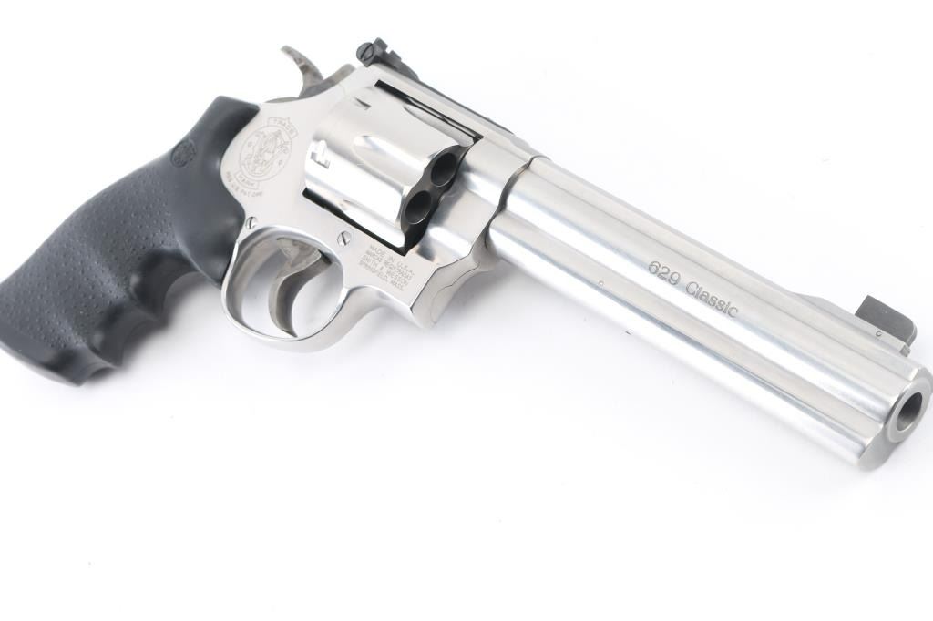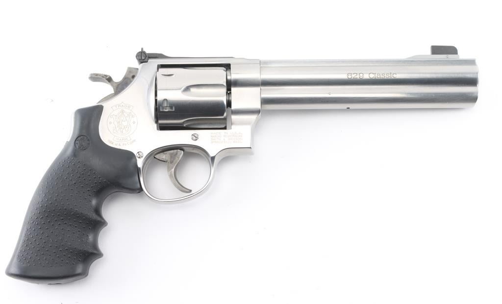 American made 6 shot revolver chambered for .44 Magnum cartridges. This is the .44 Classic Stainless model. It was built on the round butt N target frame with three screws. It has a 6.5" barrel, full under lug, large blade front sight, adjustable rear sight, fluted cylinder, smooth trigger, knurled hammer spur, and Hogue conversion square butt grips. Bore and cylinders look great, bright bore. Metal finish looks great. Grips are fine. Condition is NRA Excellent. *Modern Firearm*
