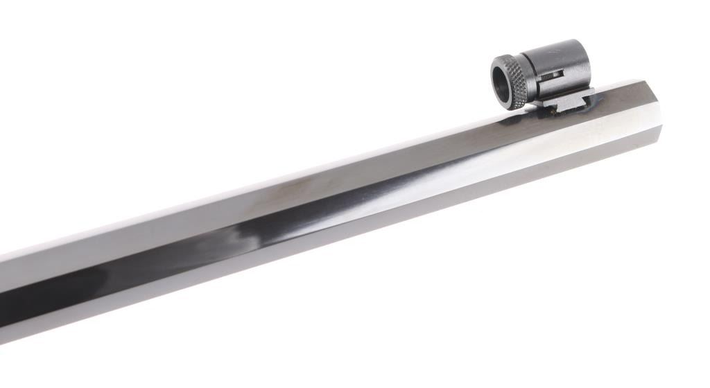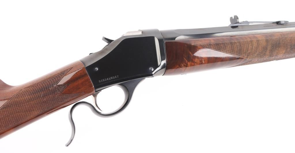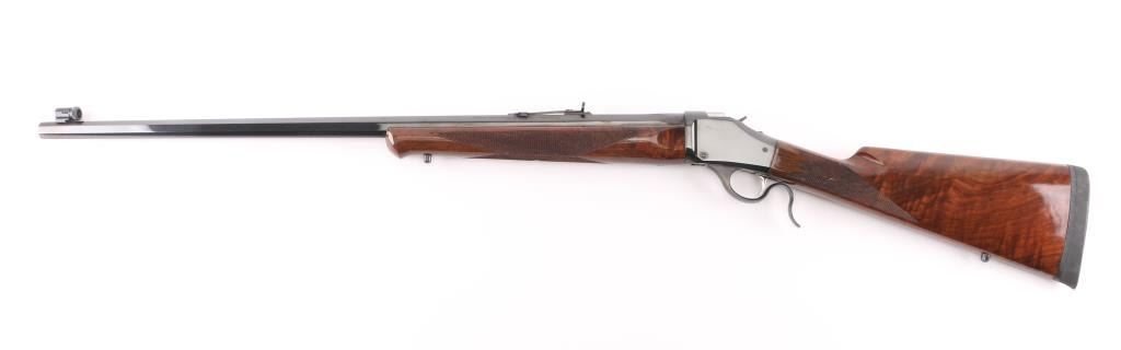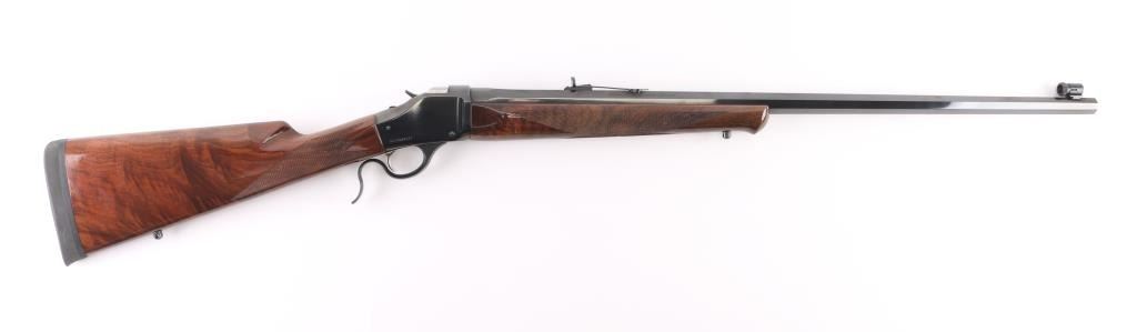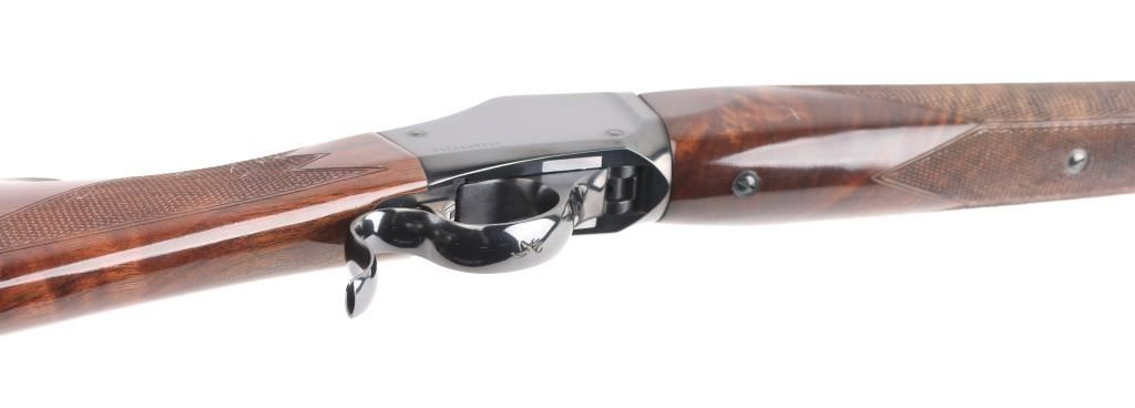 'High Wall' Single shot falling block rifle made in Japan, imported by Browning Arms Co, Morgan UT. Features blued finish, urethane finished fancy figured walnut stock & forend, straight grip, schnabel forend tip, checkered panels at wrist & forend, solid rubber recoil pad, sling studs, 28" octagonal barrel, buckhorn rear sight, hooded post front sight, exposed hammer. Selectable shell deflector behind hammer. Bore is excellent. Retains 98% blue with light scratches on receiver, handling marks. Stocks are very good with light scuffing. Condition is near NRA Excellent *** Modern Firearm ***