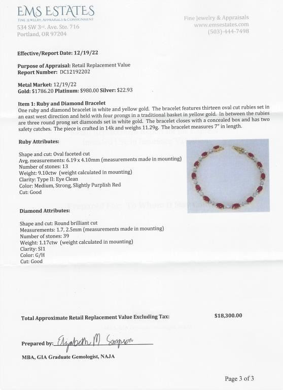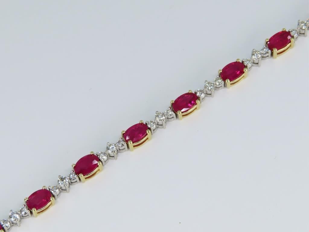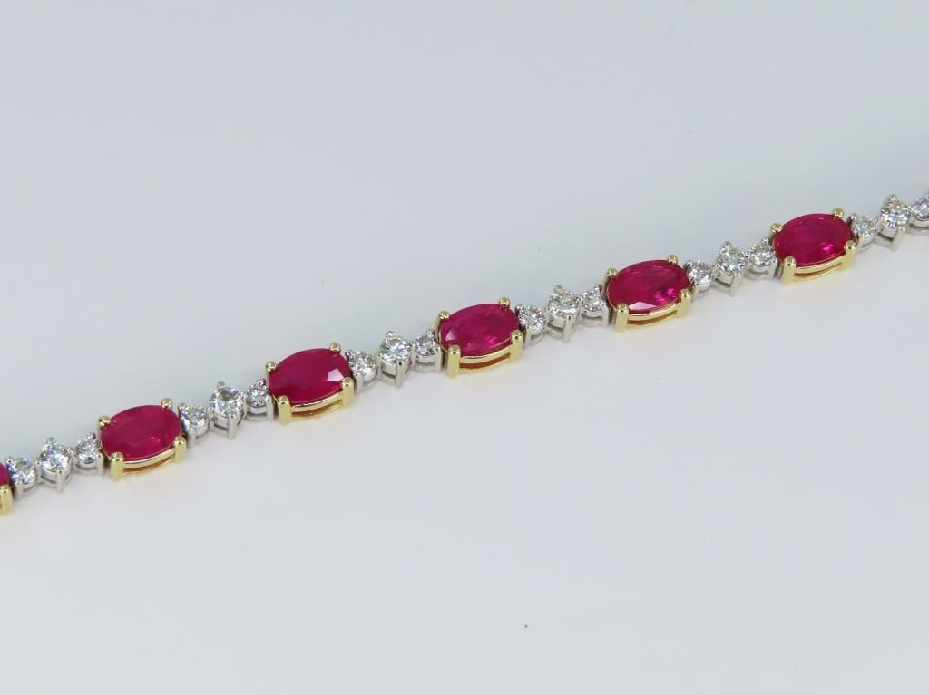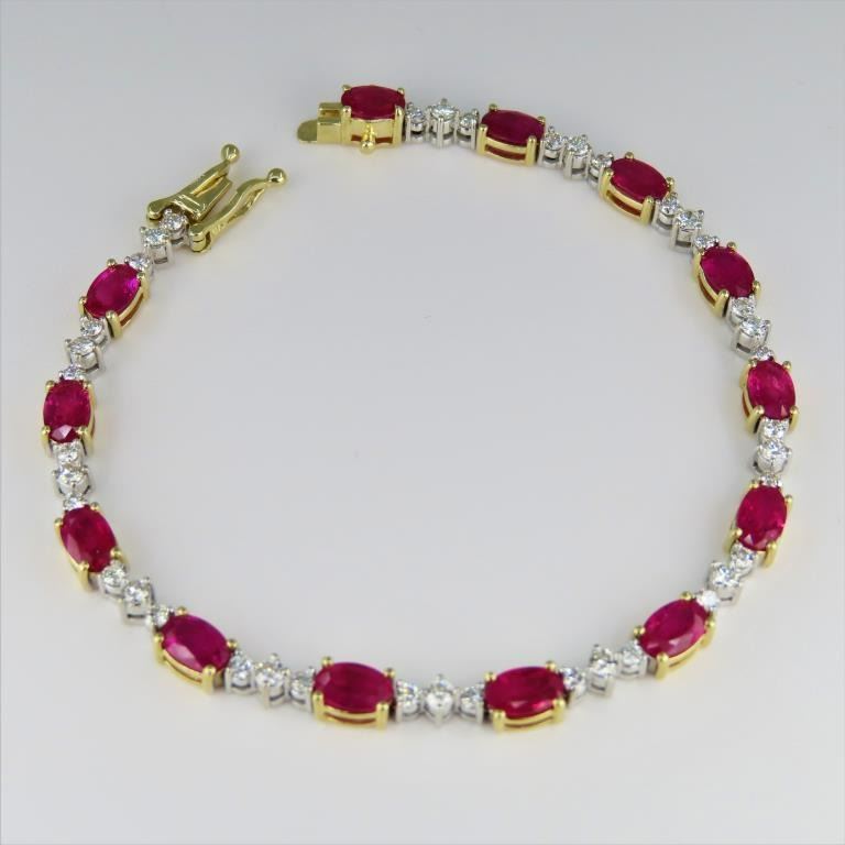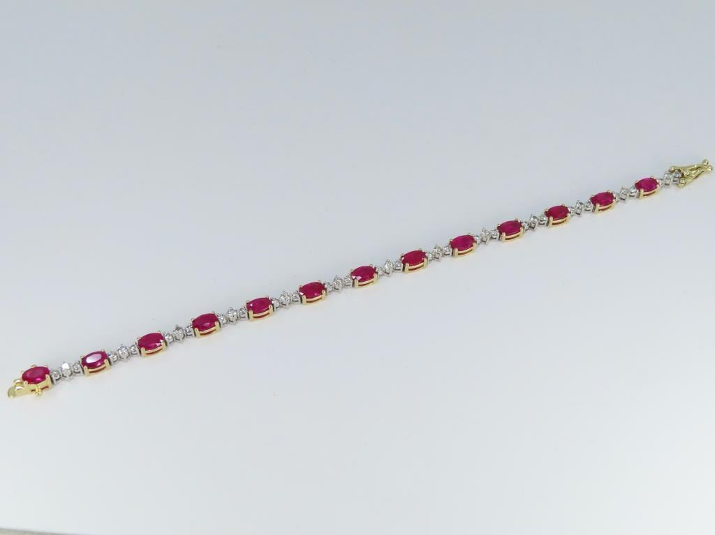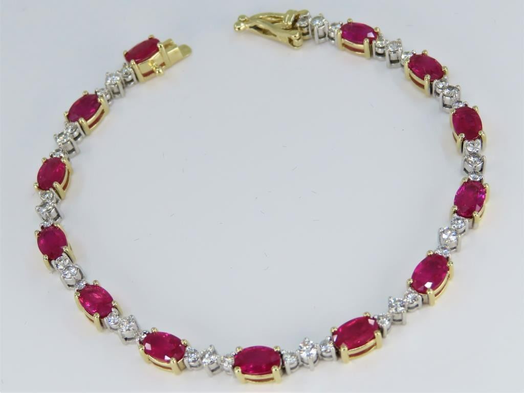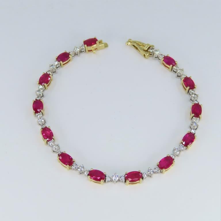 Bracelet featuring 13 oval cut vivid Red Rubies weighing approx. 9.10 carats with 39 round “IDEAL” cut Diamonds weighing approx. 1.17 carats with G-H colors and SI clarity set in a 14 karat yellow and white gold setting. Full Retail Appraisal - $18,300.00