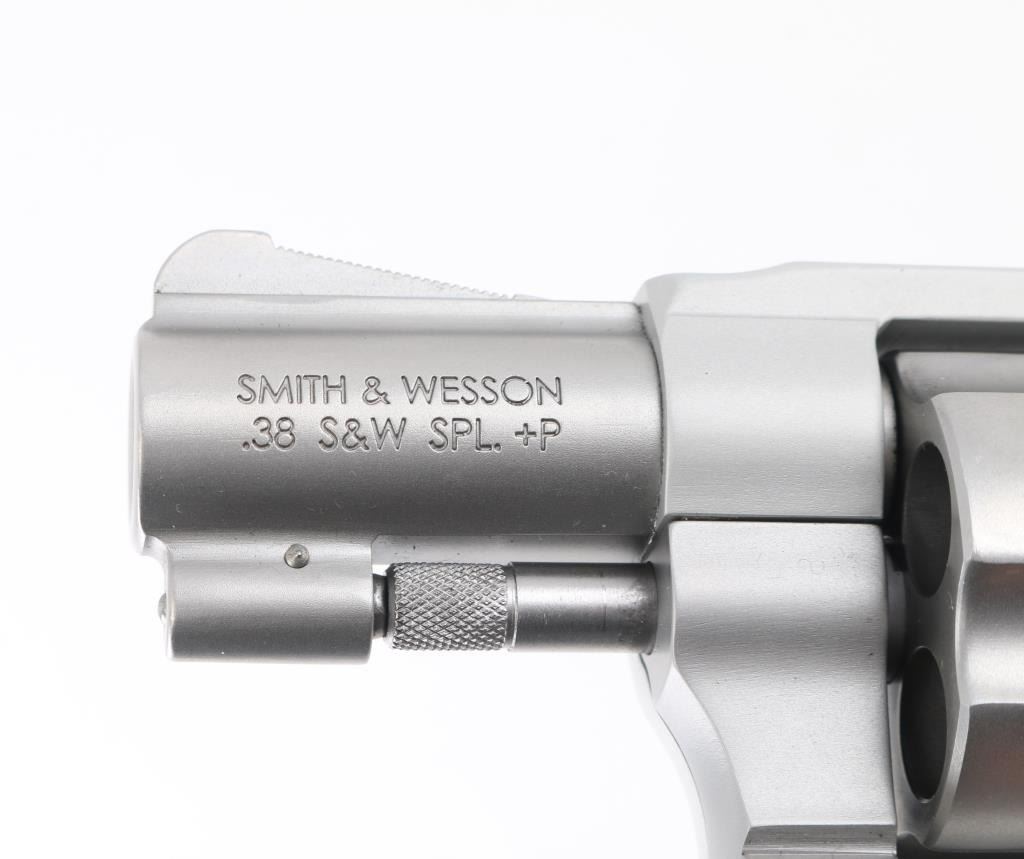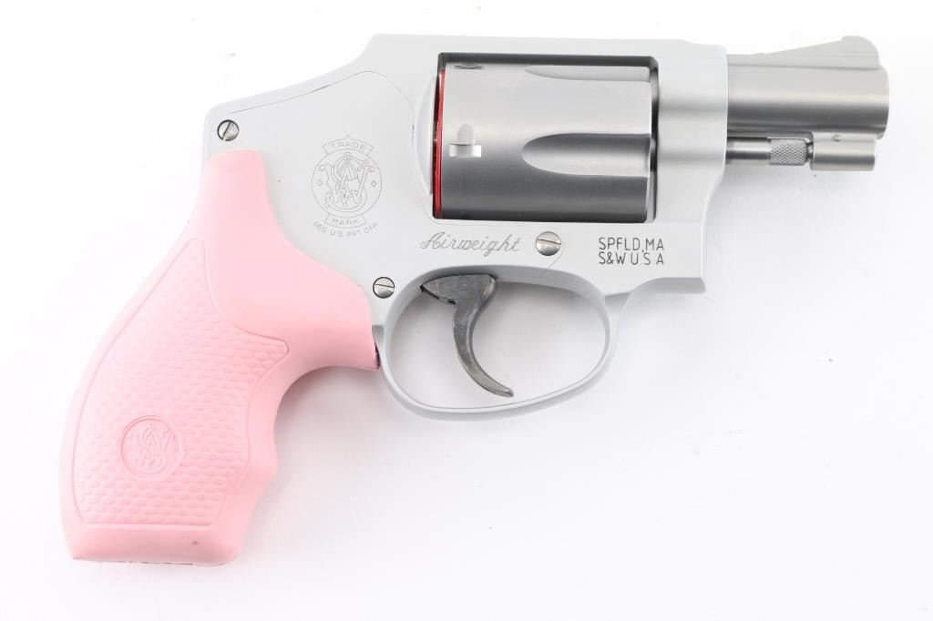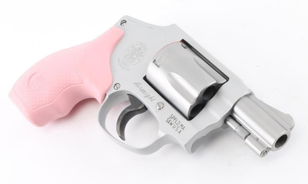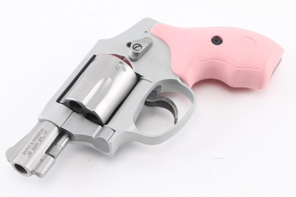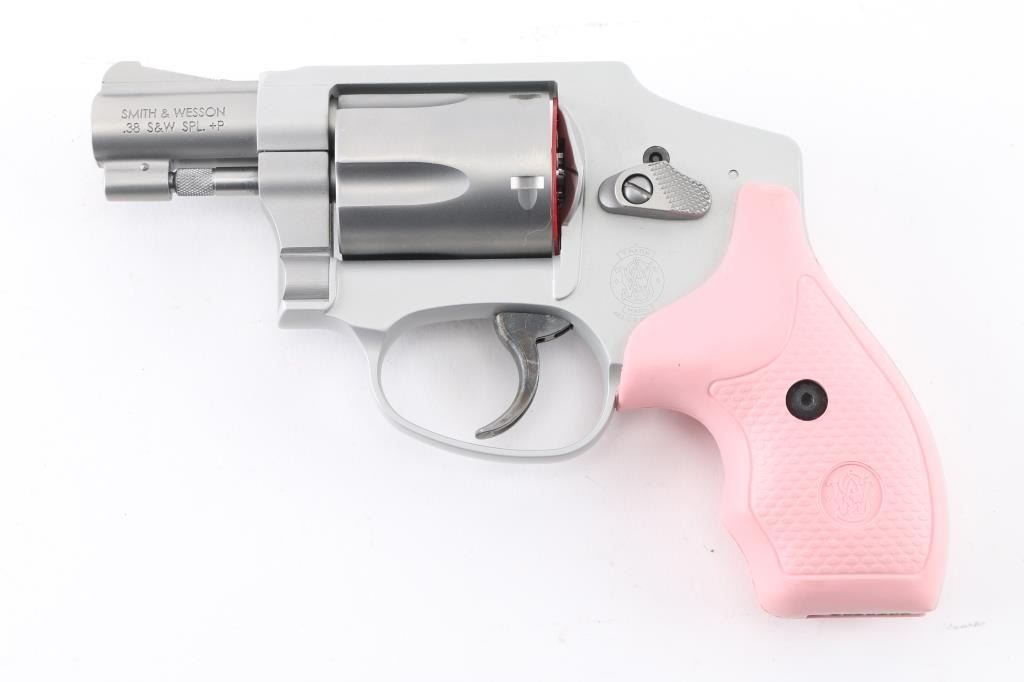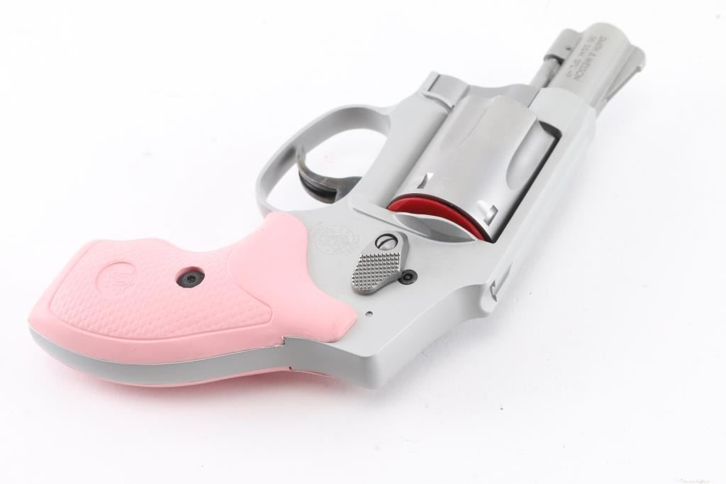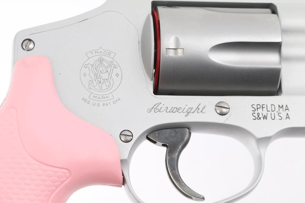 'Centennial Airweight' American made lightweight small frame double-action-only concealed hammer revolver rated for .38 Special +P ammunition. Features a matte finished 1 7/8" stainless steel barrel, serrated ramp front sight, square notched rear sight, fluted five-shot stainless steel cylinder, non-shrouded ejector rod, smooth target trigger, concealed hammer, clear finished three screw round butt aluminum alloy J frame and textured pink rubber grips with molded S&W insignias. Includes the original factory hard case with manual and lock. Condition is like NRA Perfect ***Modern Firearm***