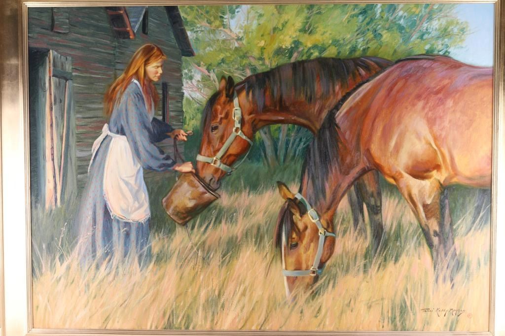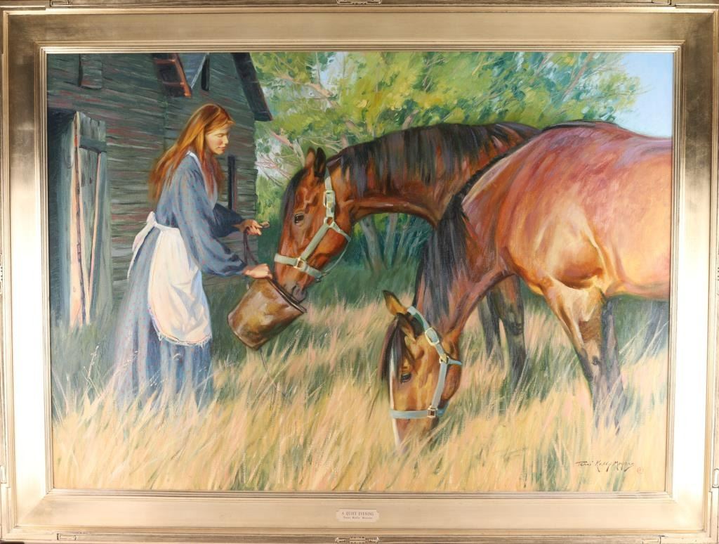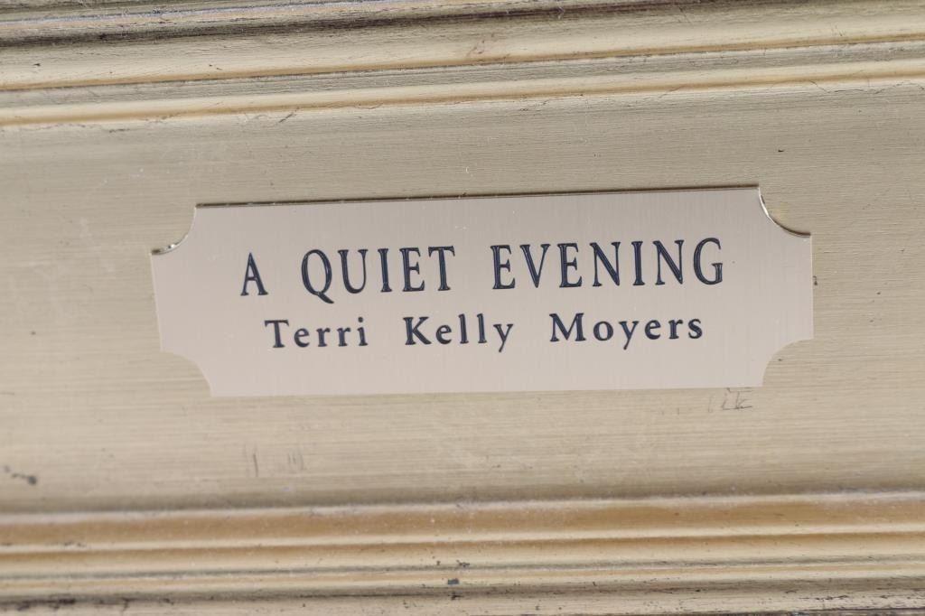 By "Terri Kelly Myers" entitled " A Quite Evening" signed lower right and framed in beautiful gold frame. image size of 48x35.5. Bio-Terri Kelly Moyers was born in Calgary, Alberta, Canada and is a long time resident of Santa Fe, New Mexico. Moyers studied at the Alberta College of Art. She attended the 1978 and 1979 Okanagan Game Farm Workshops taught by Clarence Tillenius and Robert Lougheed and attended by Kenneth Riley, Wayne Wolfe, Harley Browne and John Clymer. Her honors include the Frederic Remington Award and the Nona Jean Hulsey Rumsey Buyer's Choice Award both earned at the 1996 Prix de West Show. Gallery priced at 9000 several years ago.
