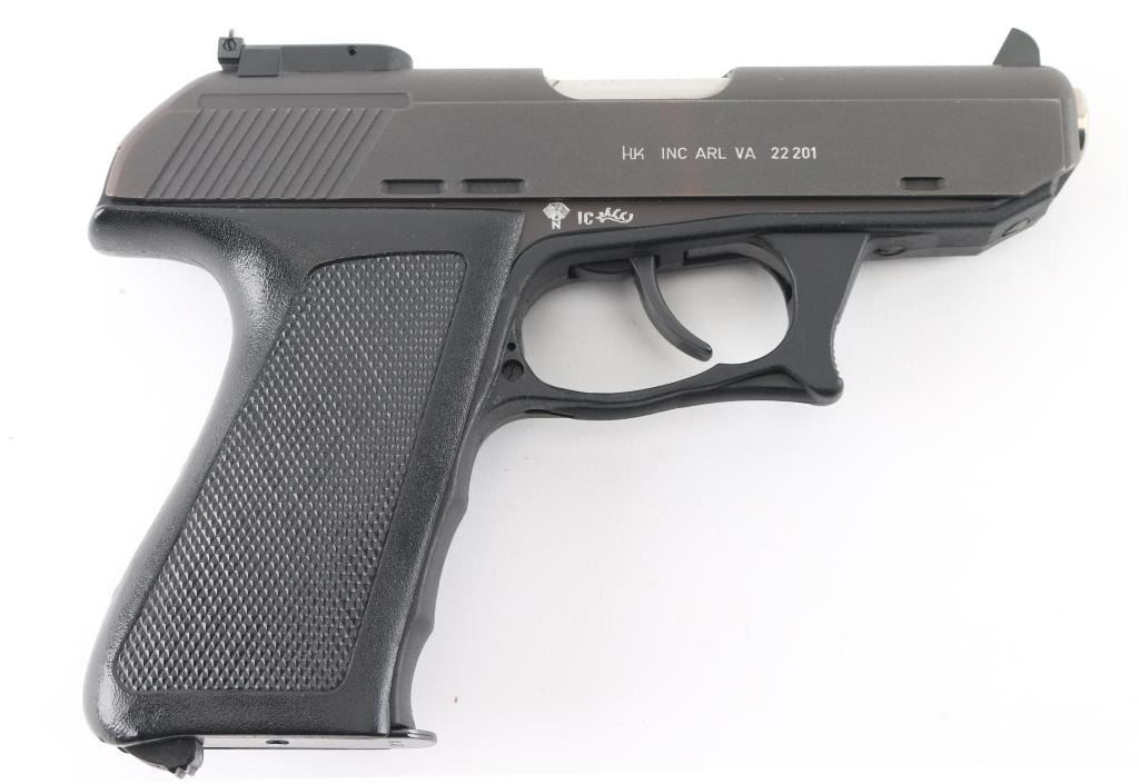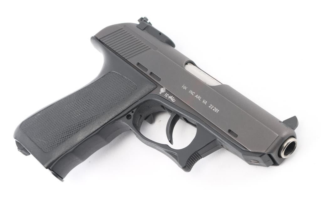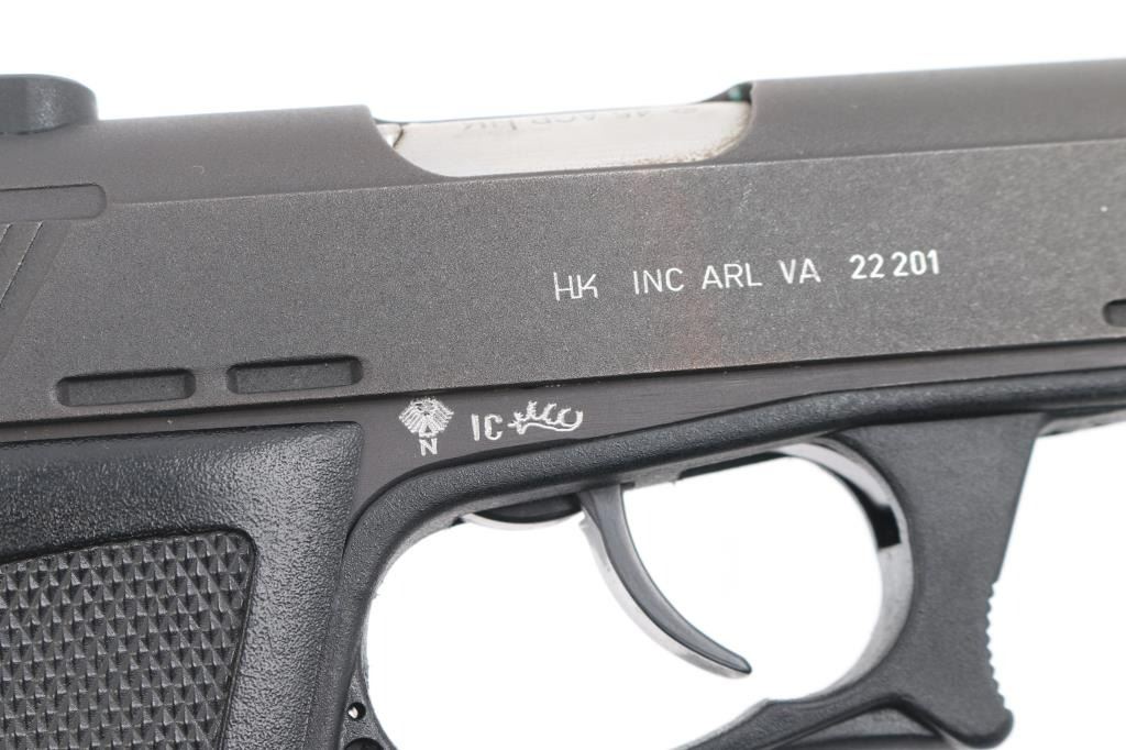 German made double action roller-delayed-blowback operated semi-automatic pistol chambered in .45 Automatic, circa 1982. Imported by HK Inc. of Arlington, V.A. with import marks on the right side of the slide. This is the very desirable Target model. Features a phosphorus/blued finish, 4" barrel with polygonal rifling, dovetailed tall blade front sight w/ white strip, adjustable rear window sight, concealed hammer, thumb safety, cocked indicator, cocking lever w/ decocking & slide release functions, serrated adjustable trigger, black polymer trigger guard, heel magazine release, 7 round magazine and one-piece checkered black polymer wrap-around grip w/ thumb rest & red outline HK insignia on the left side. Bore looks great, bright. Finish and grips look great. Condition is NRA Excellent. *Modern Firearm*