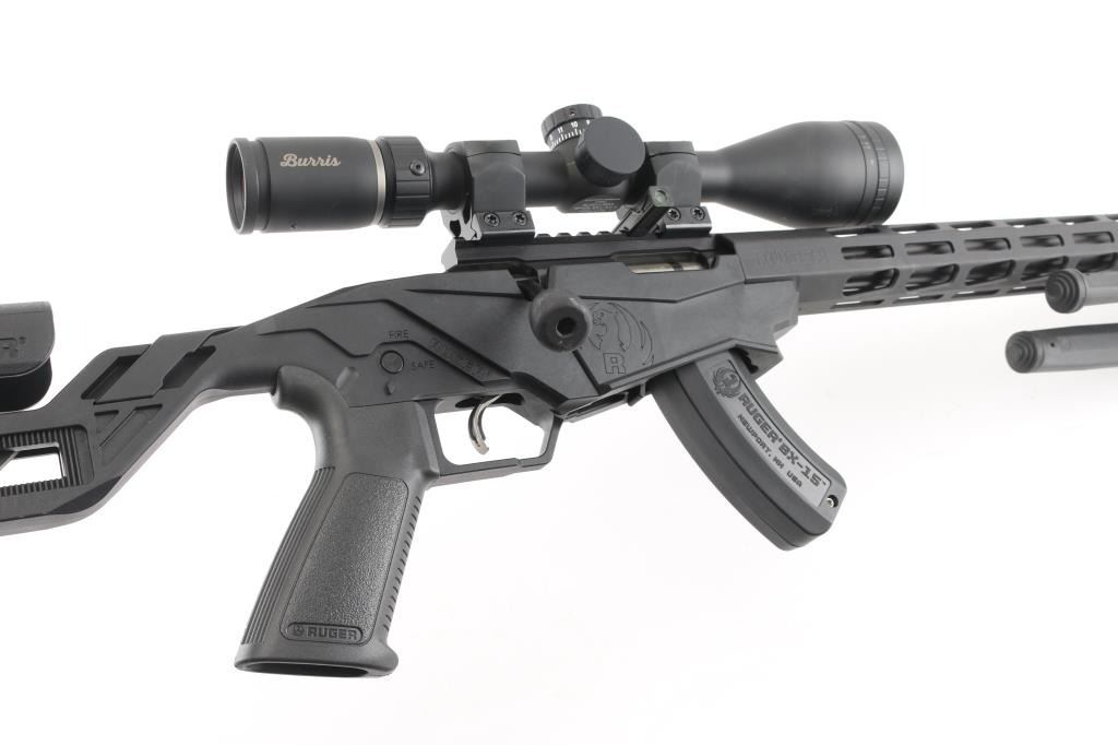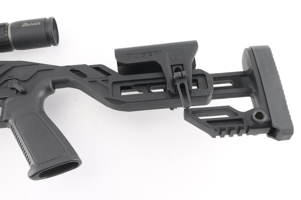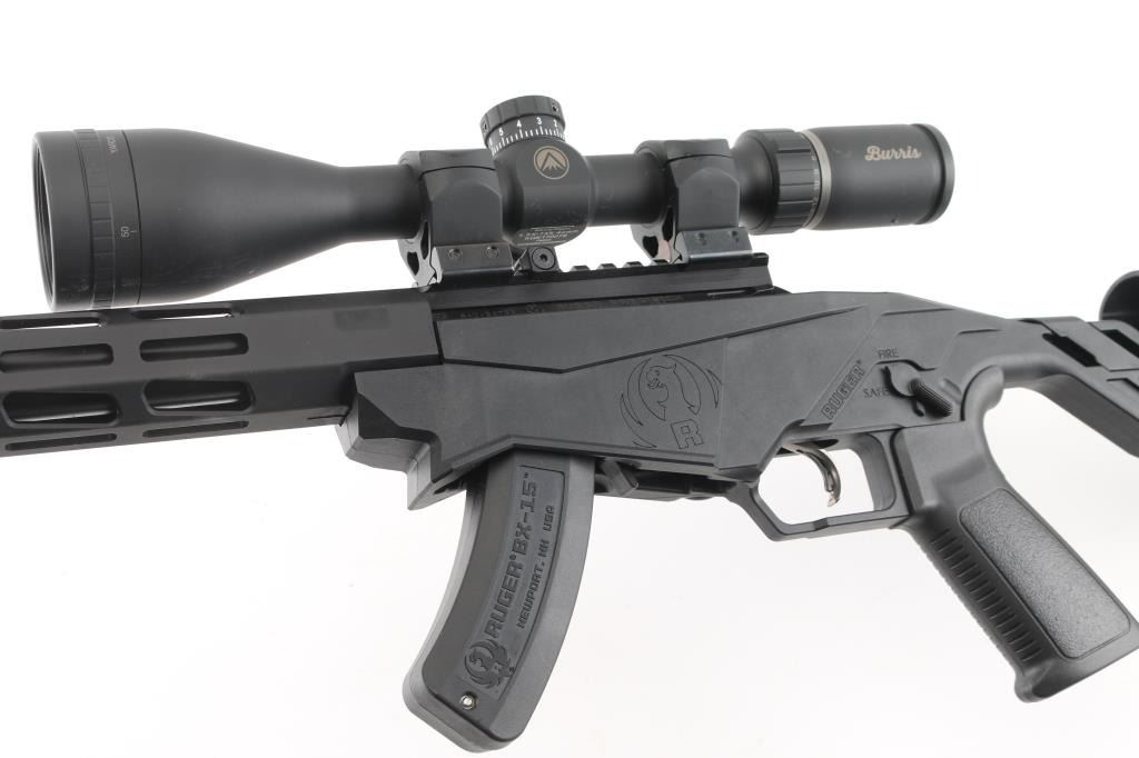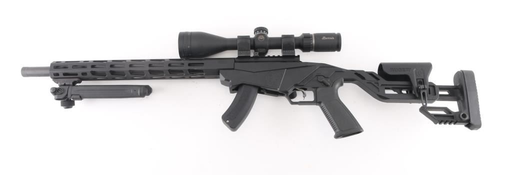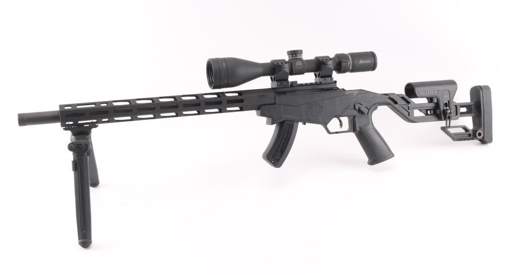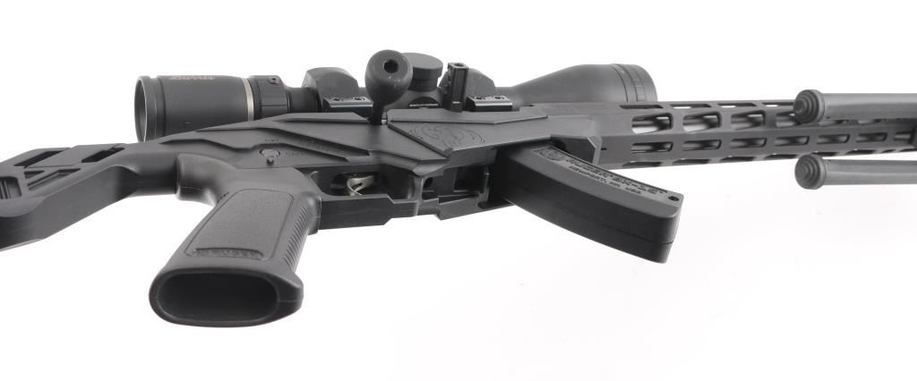 Bolt action rifle features approx 18" heavy barrel with threaded muzzle, muzzle thread protector, almost full length ventilated aluminum handguard, Picatinny rail section on receiver top, pistol grip chassis-style stock, manual safety, stock adjustable for length of pull and comb height, attached folding adjustable bipod. Mounts a Burris MSR .223 4.5-14x42mm scope with range finding reticle, adjustable objective. Bore is excellent. Overall condition is excellent with few handling marks and like new appearance. Includes one Ruger BX-15 (15 rd) magazine. Condition is NRA Excellent *** Modern Firearm ***