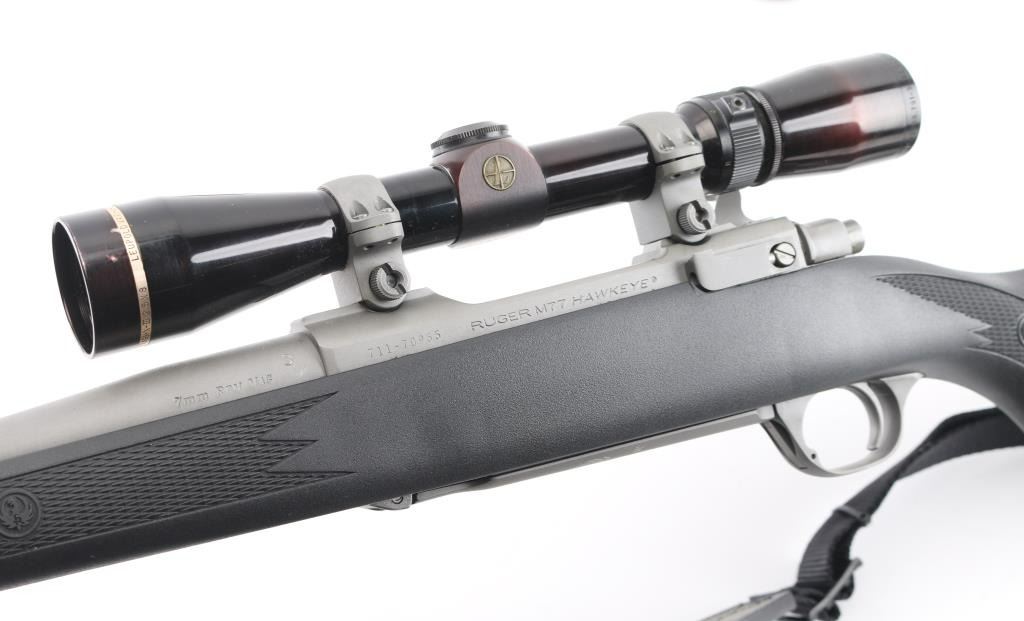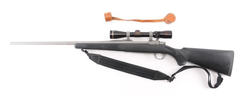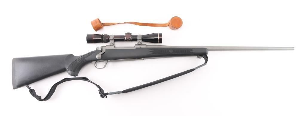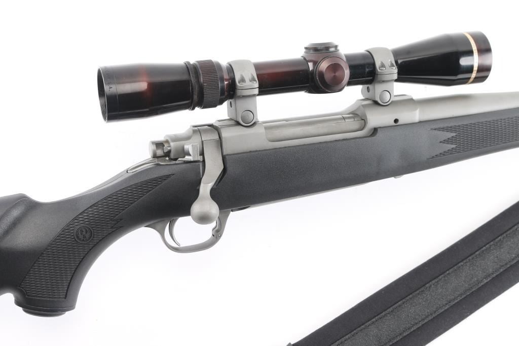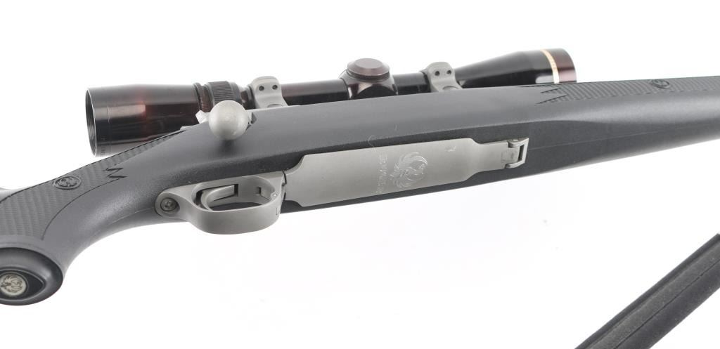 Bolt action rifle features stainless steel construction, black polymer stock with checkered panels at forend & curved wrist (embossed with Ruger emblems), no cheekpiece, thin solid rubber recoil pad, sling studs, 24" barrel, no sights, scalloped dovetails on receiver for scope mounting, hinged floorplate, side swing safety at right rear of action. Mounts a very good condition Leupold Vari-X III 2.5-8x scope, fine crosshair, clear view, leather caps. Bore is very good condition. Matte finished stainless is excellent, with few handling marks. Polymer is excellent condition. Scope shows thinning of anodized black color, appears plum colored in some areas. Includes black nylon sling. Condition is NRA Excellent *** Modern Firearm ***