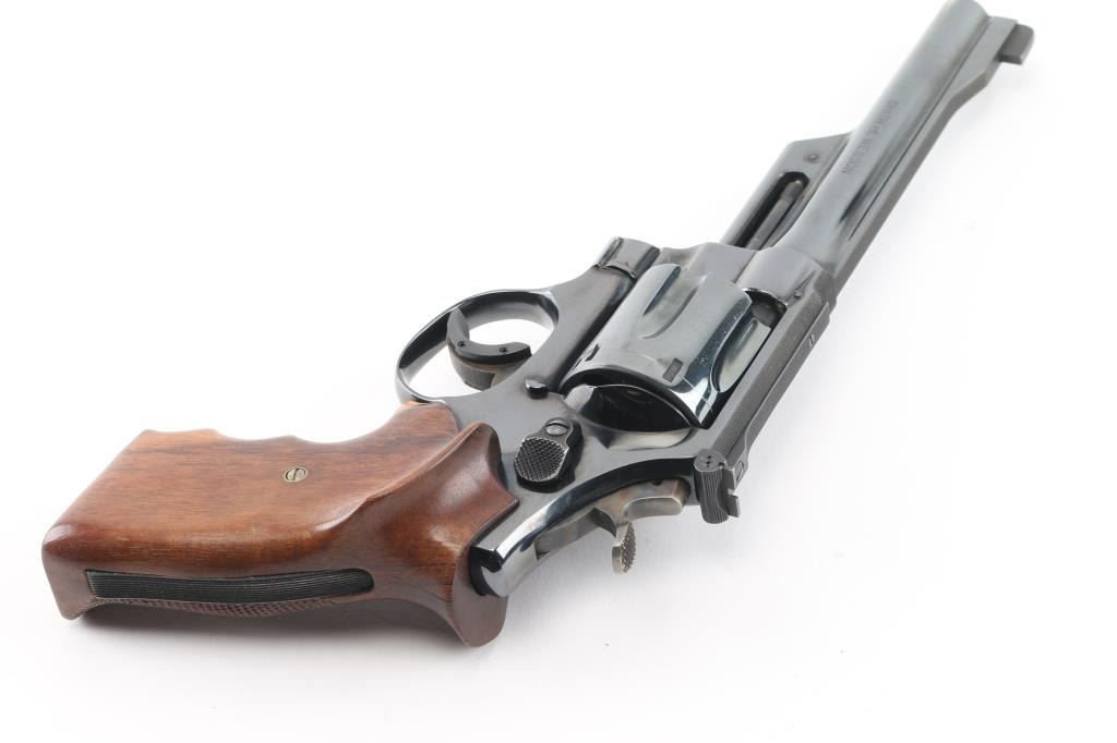 'Pinned & Recessed' double action revolver manufactured circa 1968-69. Features high polish blued finish, aftermarket smooth walnut finger groove grips with right hand thumb rest, 6" barrel with shrouded ejector rod, Partridge front & adjustable rear sights, case colored grooved narrow trigger with added trigger shoe, case colored checkered medium width spur hammer. Bore and charge holes are very good condition. Retains 95% finish with muzzle wear, minor handling marks, light drag line. Grips are very good. Action is smooth with tight lock-up. Condition is NRA Very Good++ *** Modern Firearm ***