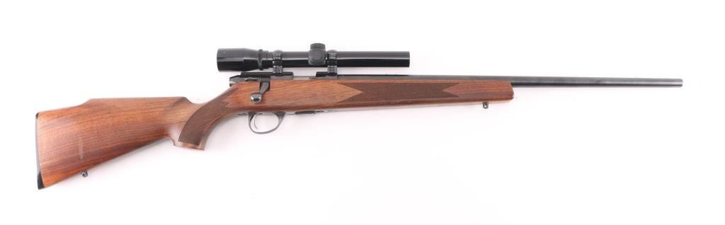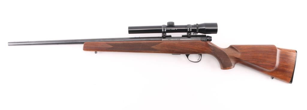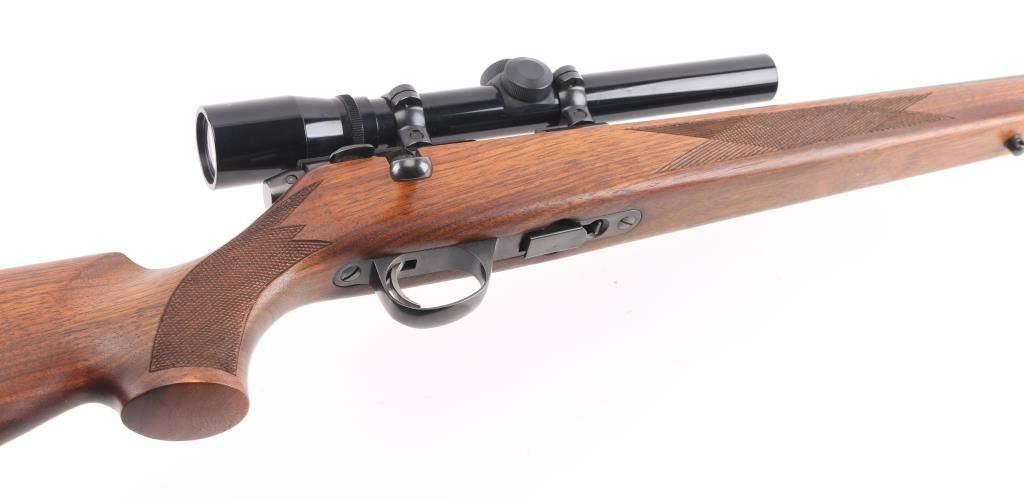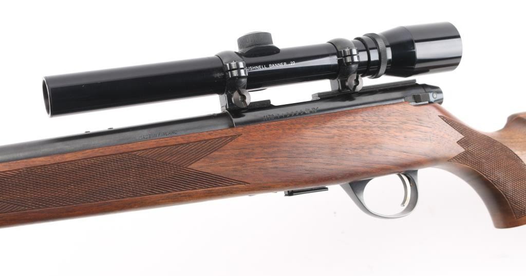Finnish bolt action rimfire rifle, imported by Stoeger, manufactured circa 1979-1983. Features blued finish, checkered walnut stock, right handed cheek piece, factory plastic buttplate, 22" barrel, no sights, barrel drilled & tapped for sight mounting, dovetail base attached to receiver, detachable 5 rd magazine, manual safety, sling studs, flat button shaped bolt knob, machined steel trigger guard. Bore is very good. Retains 95% finish, with handling marks. Stock is very good with minor blemishes. Mounts a very good condition Bushnell Banner 22 scope, about 4x, with duplex reticle, clear view. Condition is near NRA Excellent *** Modern Firearm ***
