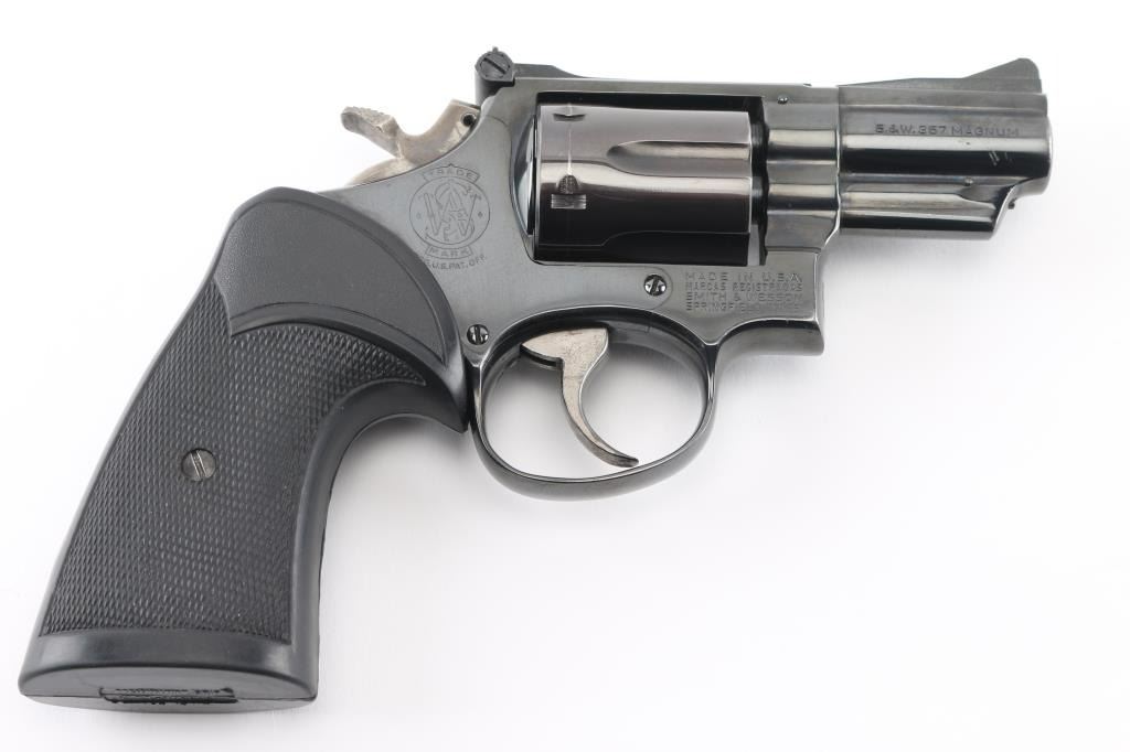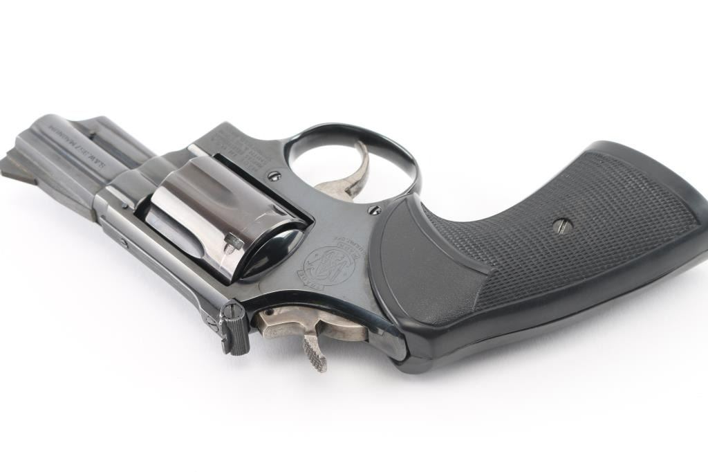 The ".357 Combat Magnum" Built on a square butt K target frame. (1967 relocation of rear sight leaf screw) Manufactured 1974. Medium frame double action revolver features pinned barrel & recessed cylinder for cartridge rims, blue finish, checkered black Pachmayr grips.2.5" barrel, adjustable sights, smooth polished wide trigger, case colored knurled wide spur hammer. Bore and charge holes are excellent/bright condition. blue finish is near excellent with slight drag line on cylinder, some minor edge wear. Grips are excellent condition. Action is smooth, lock-up is good. Appears carefully reblued, minor loss of original contours, sideplate polished off-gun, re-blue matches factory color.