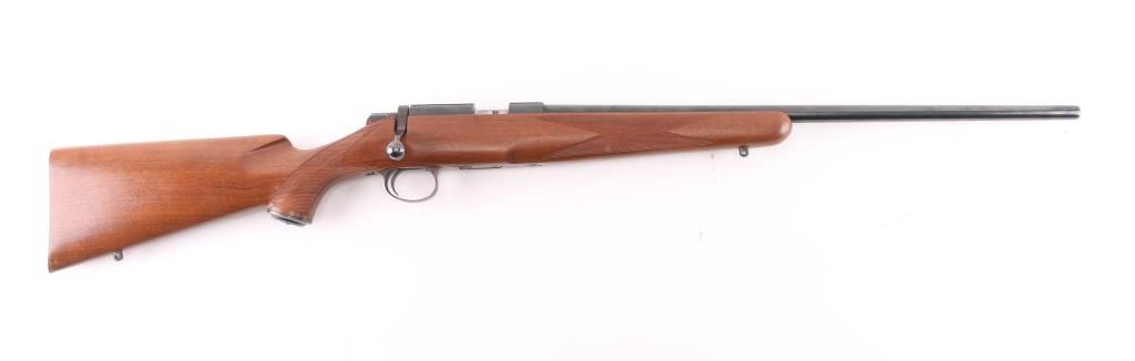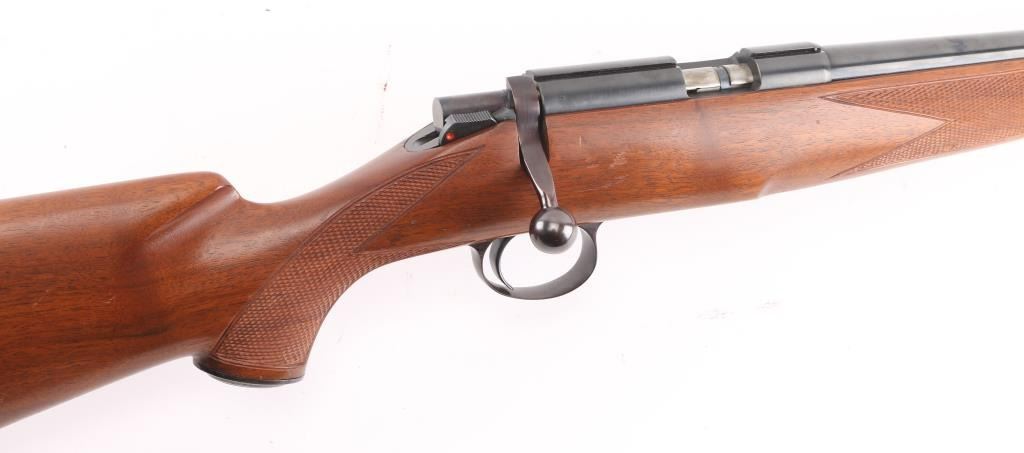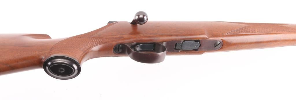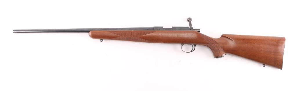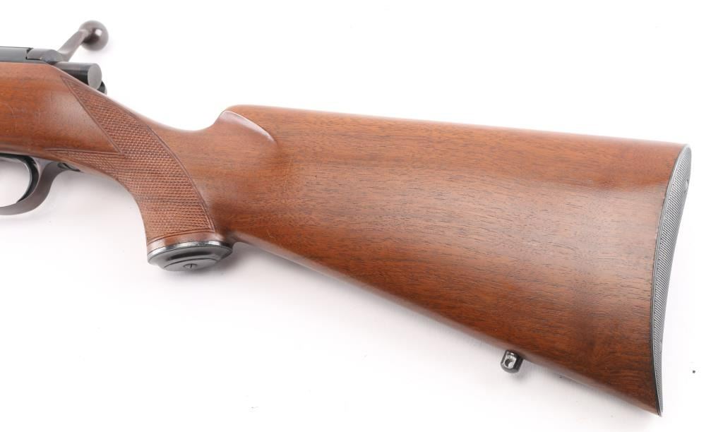 American classic bolt action rimfire rifle. Early production from Clackamas OR. Features blued finish, checkered walnut stock, checkered steel buttplate, contoured steel grip cap, 22" barrel, no sights, dovetail grooved receiver, detachable 5 rd magazine, manual safety, sling studs. Bore is very good. Retains 95% finish, few handling marks, small ding to barrel. Stock is near excellent with few minor blemishes. Condition is near NRA Excellent *** Modern Firearm ***