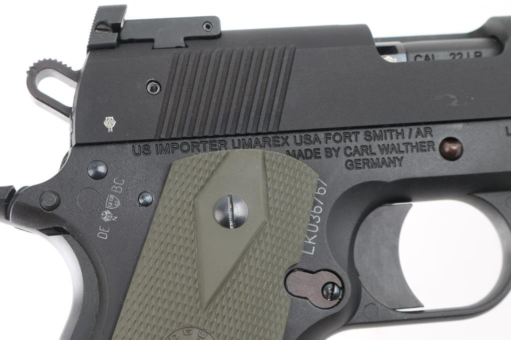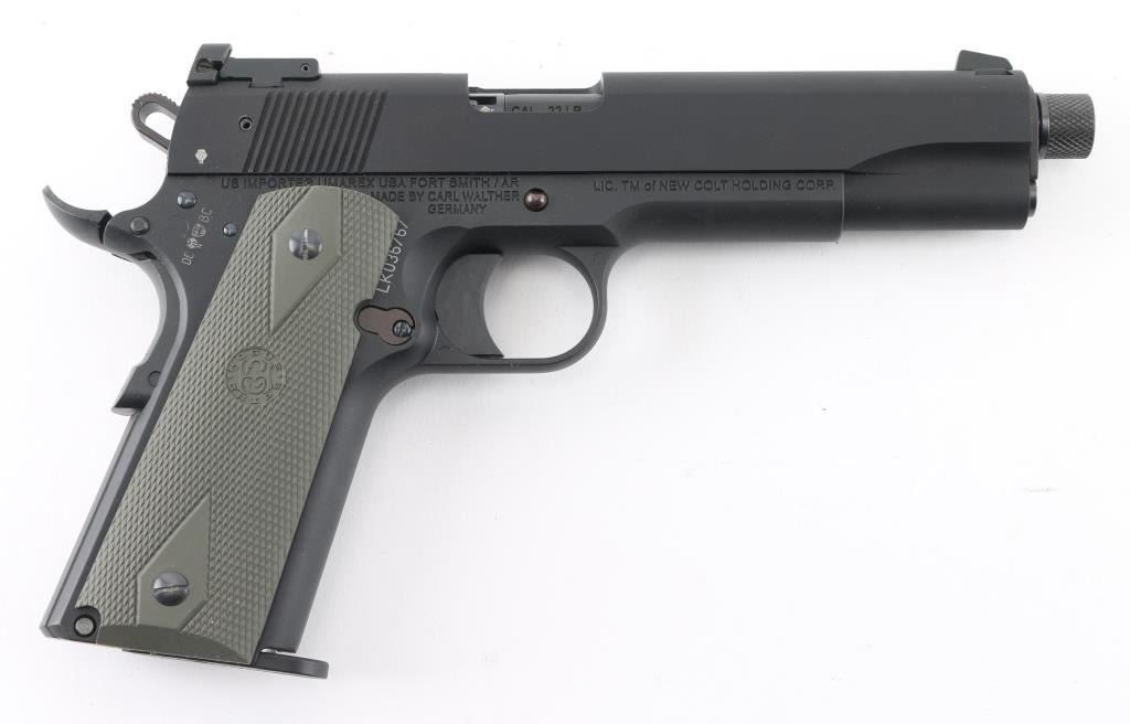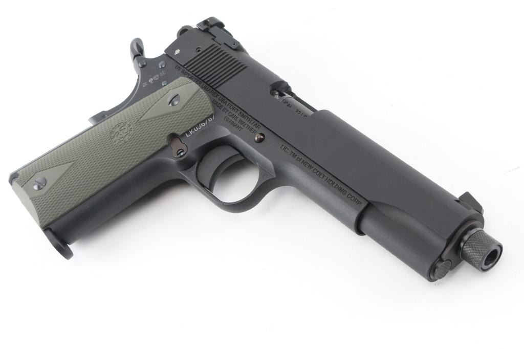 German 1911 styled semiautomatic rimfire pistol imported by Umarex USA, Ft Smith AR. Features matte black finish, green rubber checkered double diamond Hogue grips, 5" barrel with threaded extension with checkered thread protector, adjustable sights, upswept beavertail grip safety, manual safety. Bore is excellent/bright, overall condition is new in box. Includes hard plastic factory case. Condition is NRA Perfect in Box. Modern Firearm.