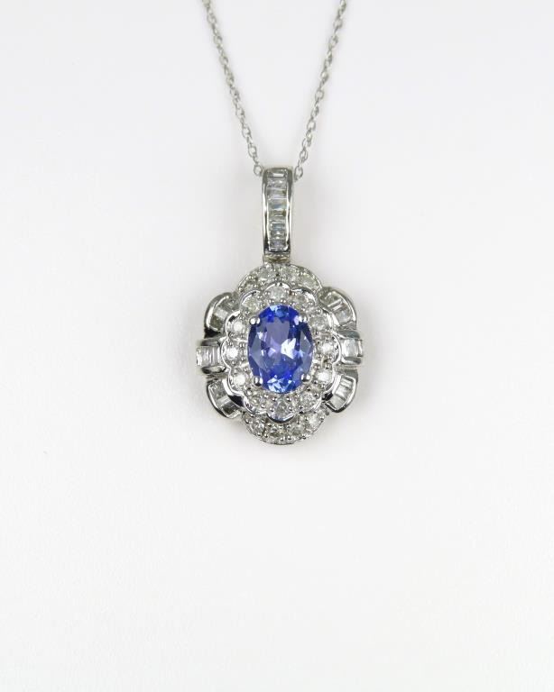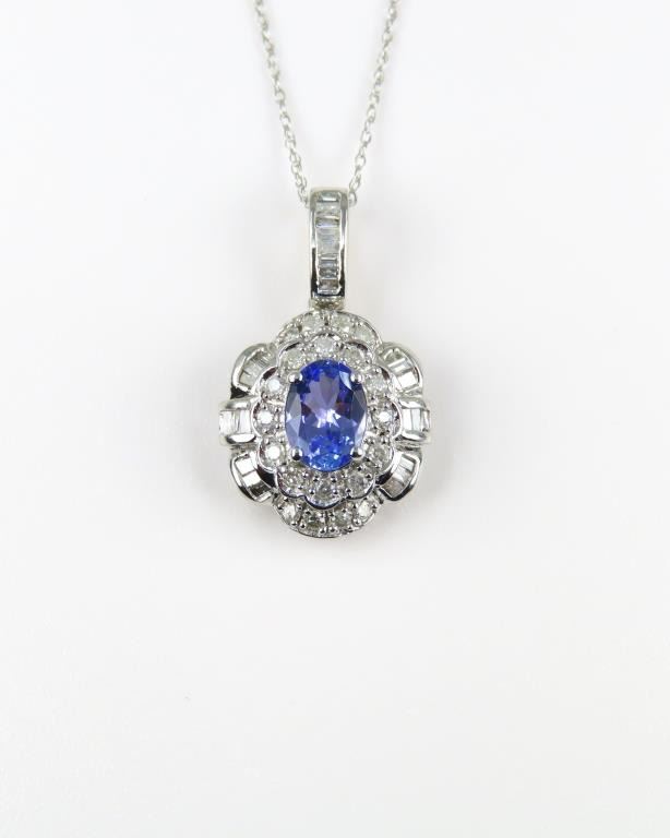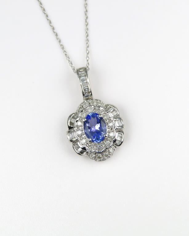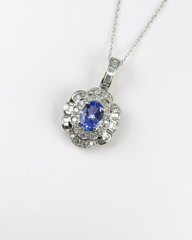 featuring an oval cut Tanzanite weighing approx. 1.00 carats framed with 26 baguette and 20 round cut Diamonds weighing approx. 1.00 carat total set in a lovely scalloped design setting crafted in 14 karat white gold with 10 karat white gold chain.